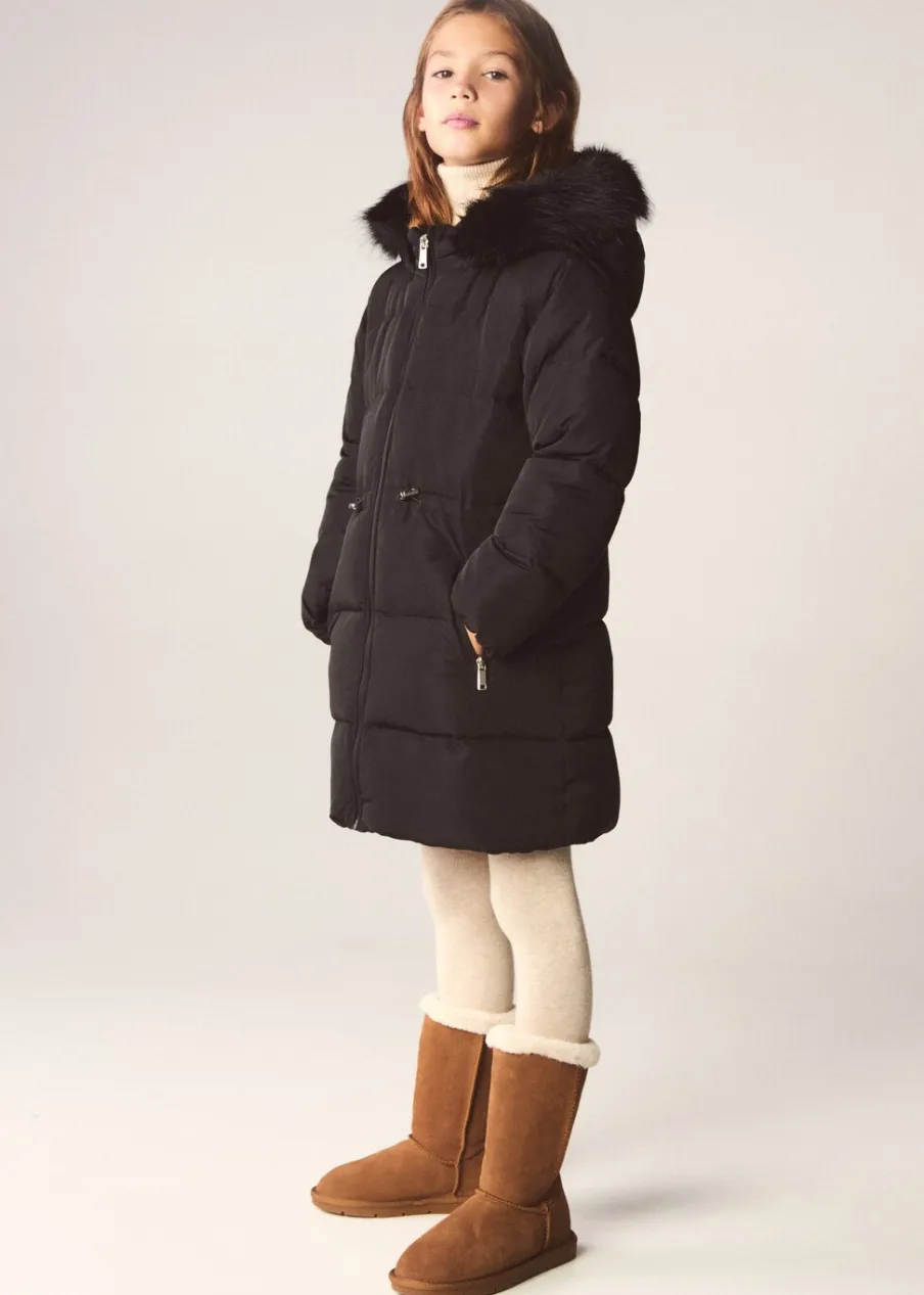Model pikowany. Wewnętrzna podszewka. Kaptur z obszyciem ze sztucznego futra. Długi rękaw. Model prosty. Wypełnienie z piór. Zapięcie na suwak. Dwie kieszenie na zamek z boku.