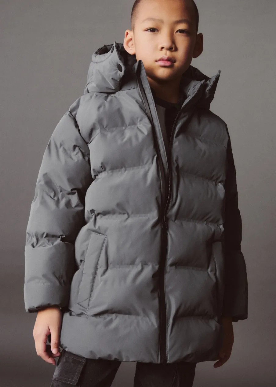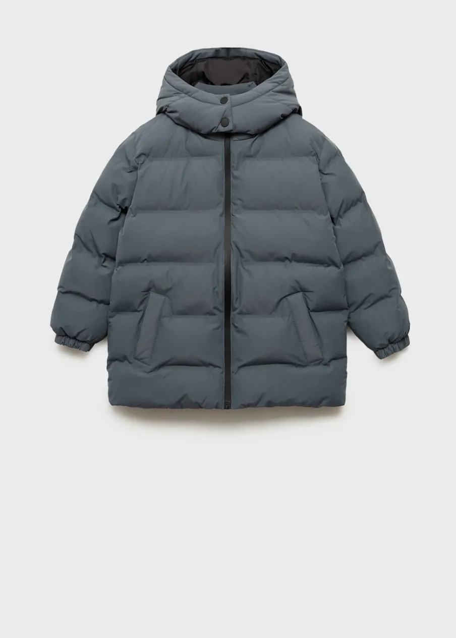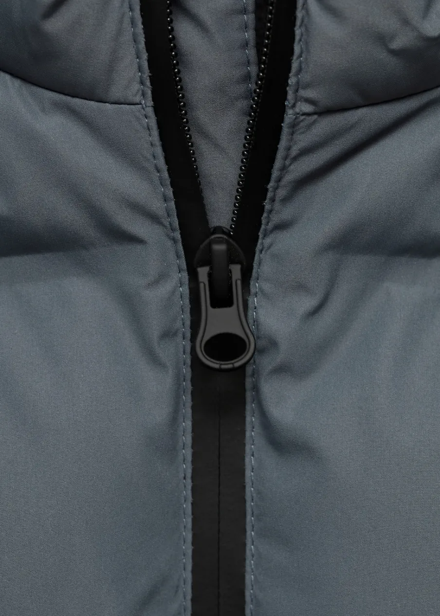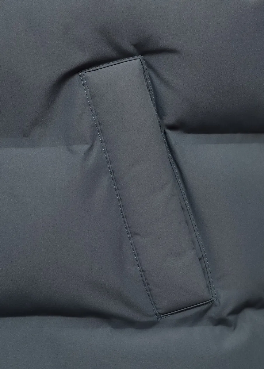 Szwy klejone. Golf. Długi rękaw. Dwie kieszenie boczne. Kaptur. Model pikowany. Model prosty. Zapięcie na guziki.
