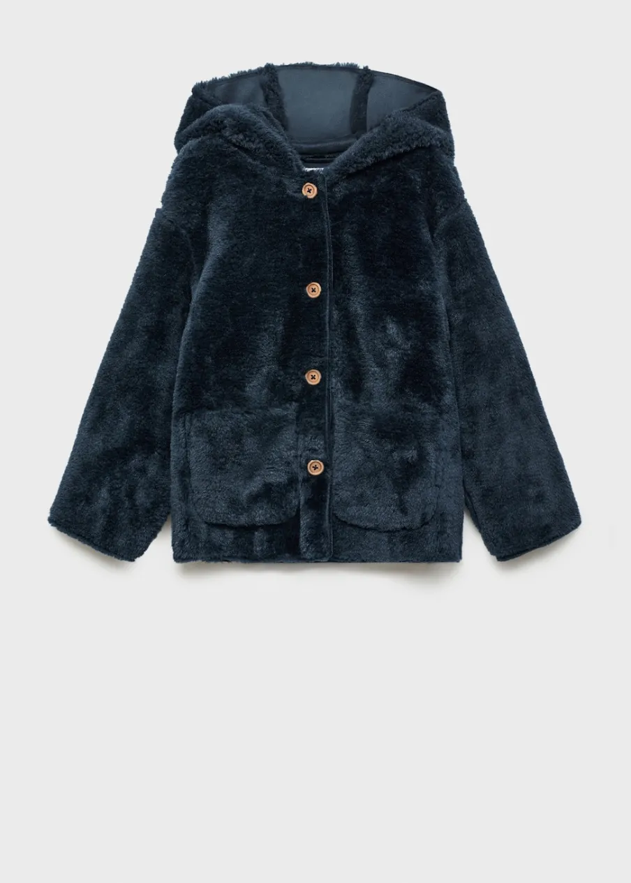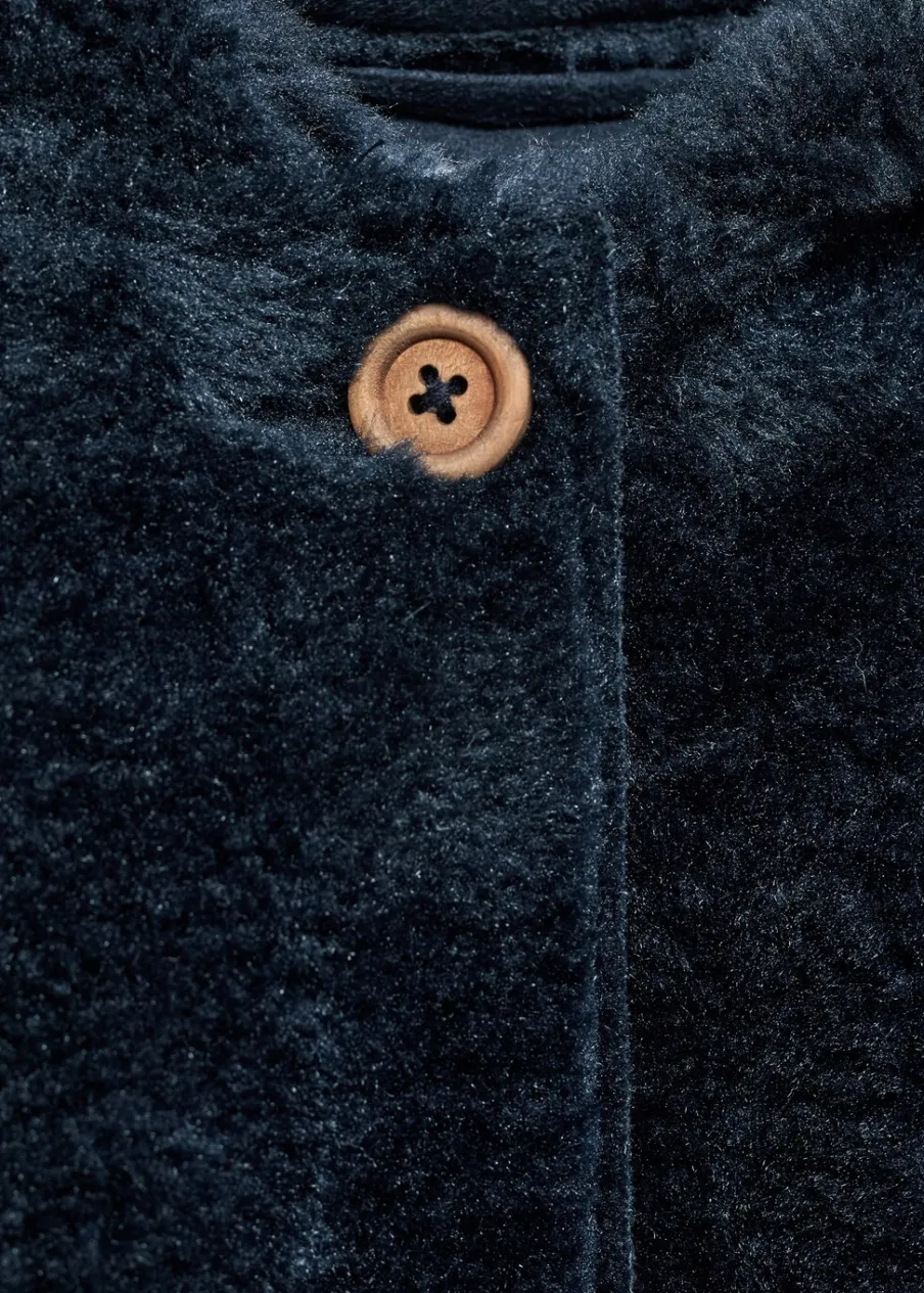 Model prosty. Włochata tekstura. Kaptur. Dwie kieszenie nakładane po bokach. Długi rękaw. Wewnętrzna podszewka. Zapięcie na guziki z przodu.