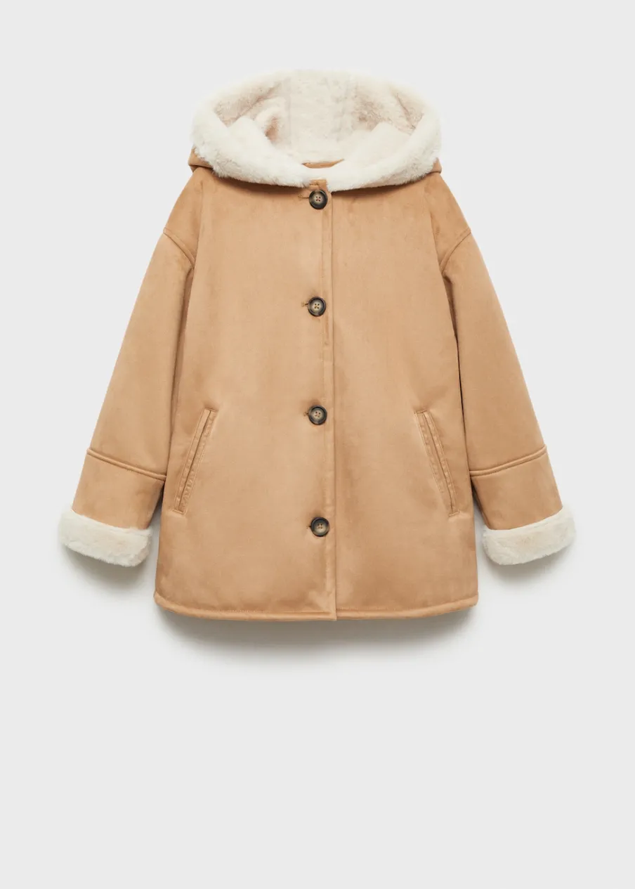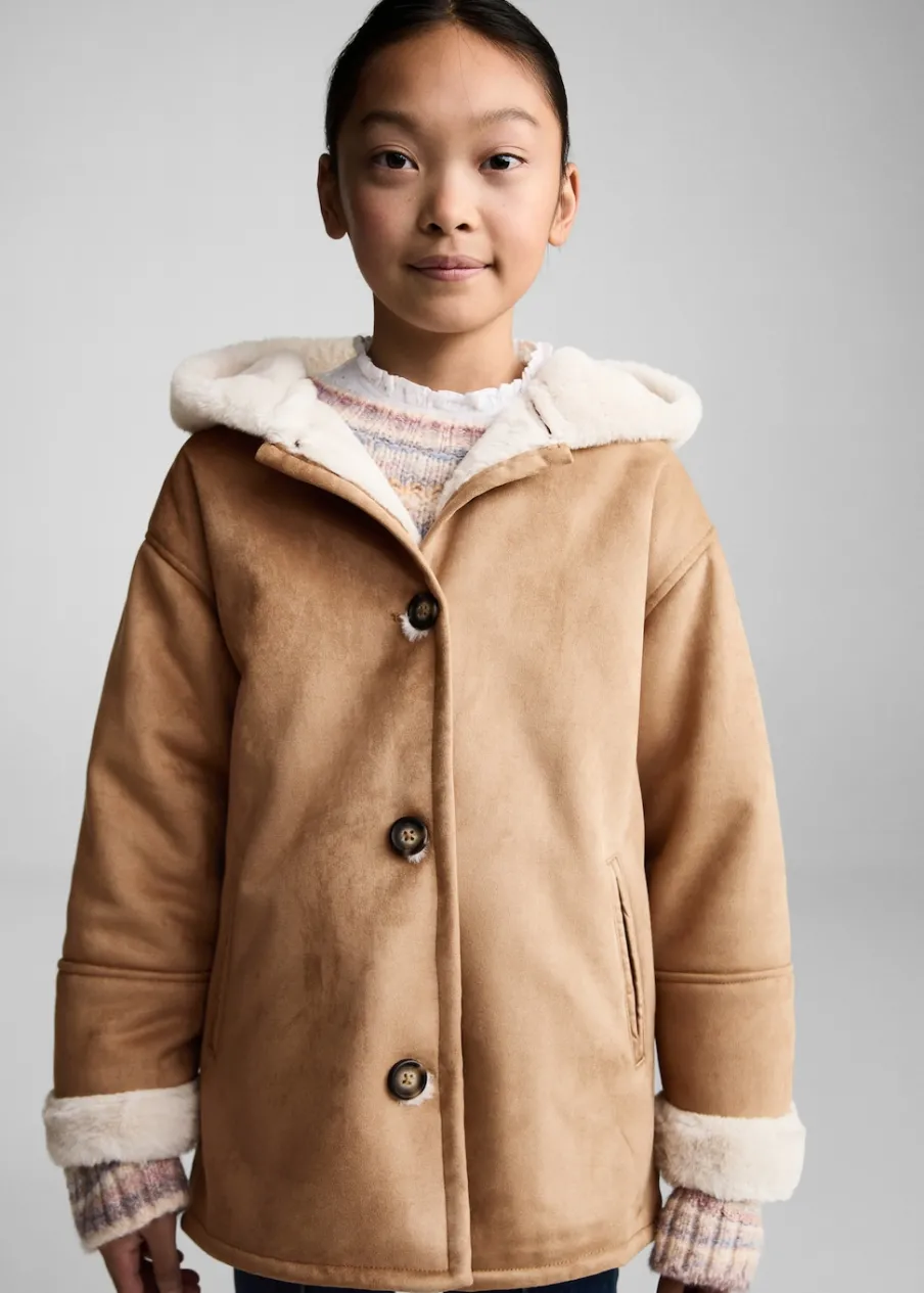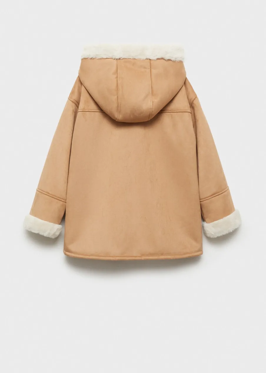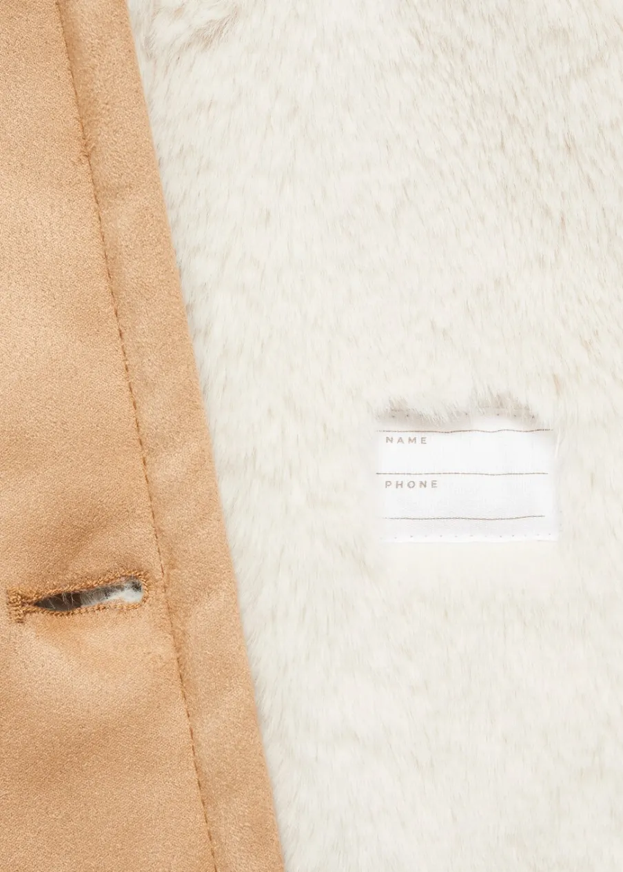 Sztuczny zamsz. Model prosty. Model długi. Okrągły dekolt. Kaptur. Długi rękaw. Futrzana podszewka. Dwie kieszenie boczne. Wewnętrzna etykieta na dane osobowe. Zapięcie na guziki.
