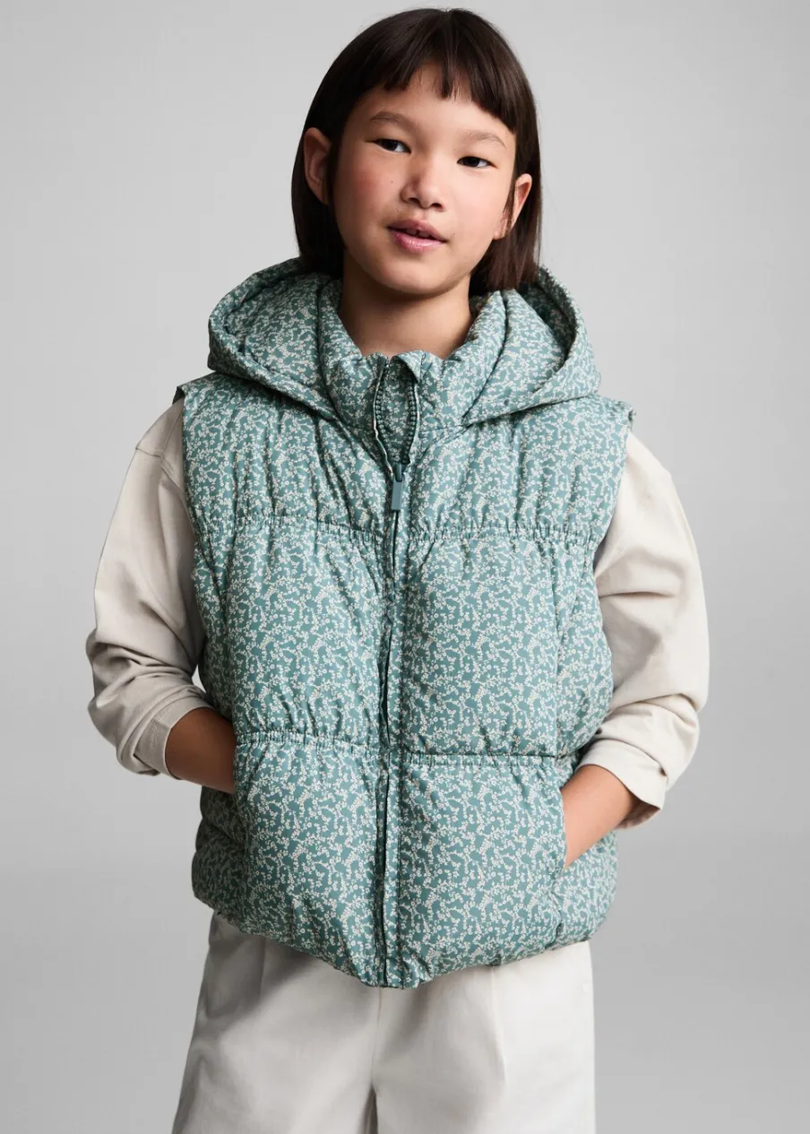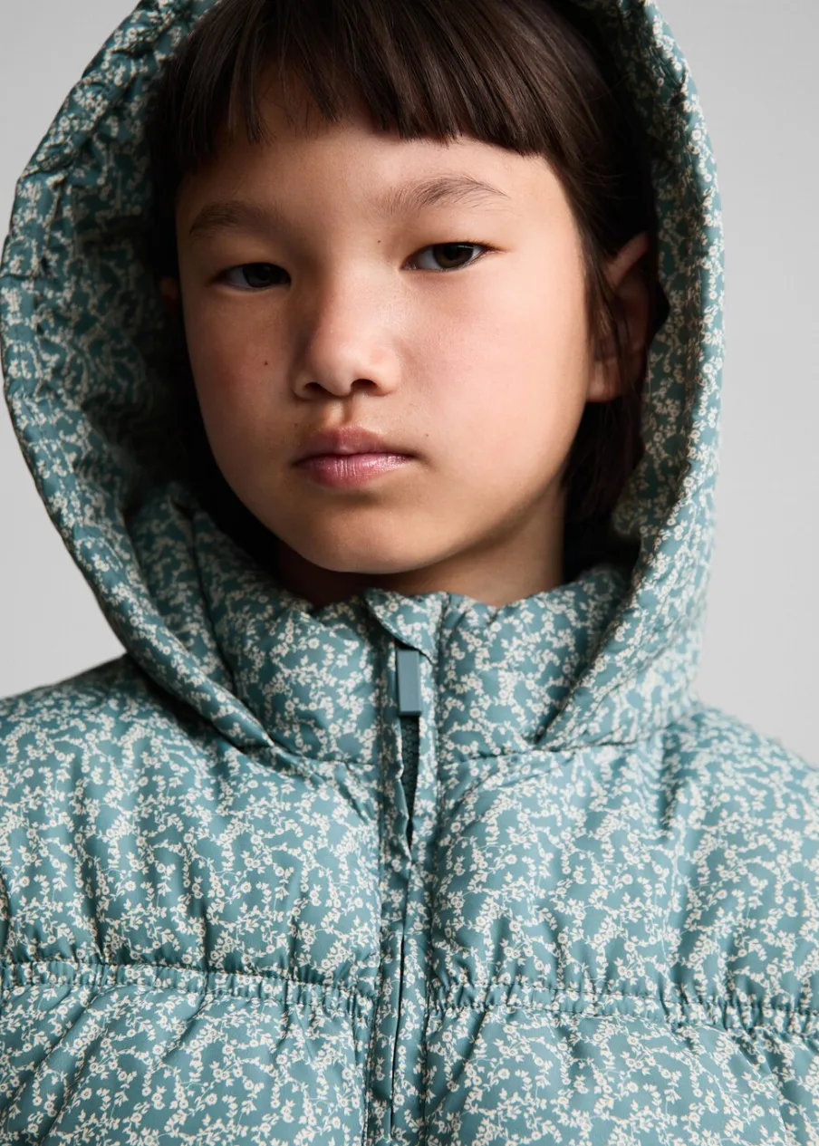 OpisModel pikowany. Kwiatowy wzór. Krótki krój. Model prosty. Kaptur. Zapięcie na zamek z przodu.
