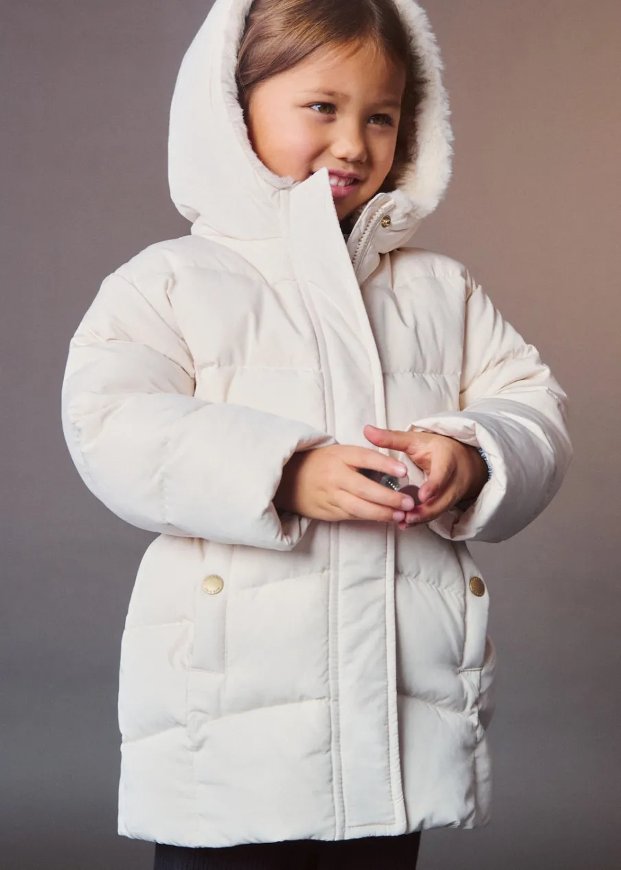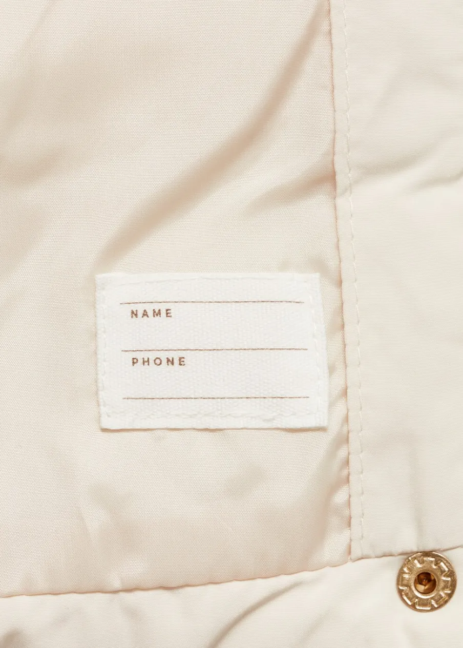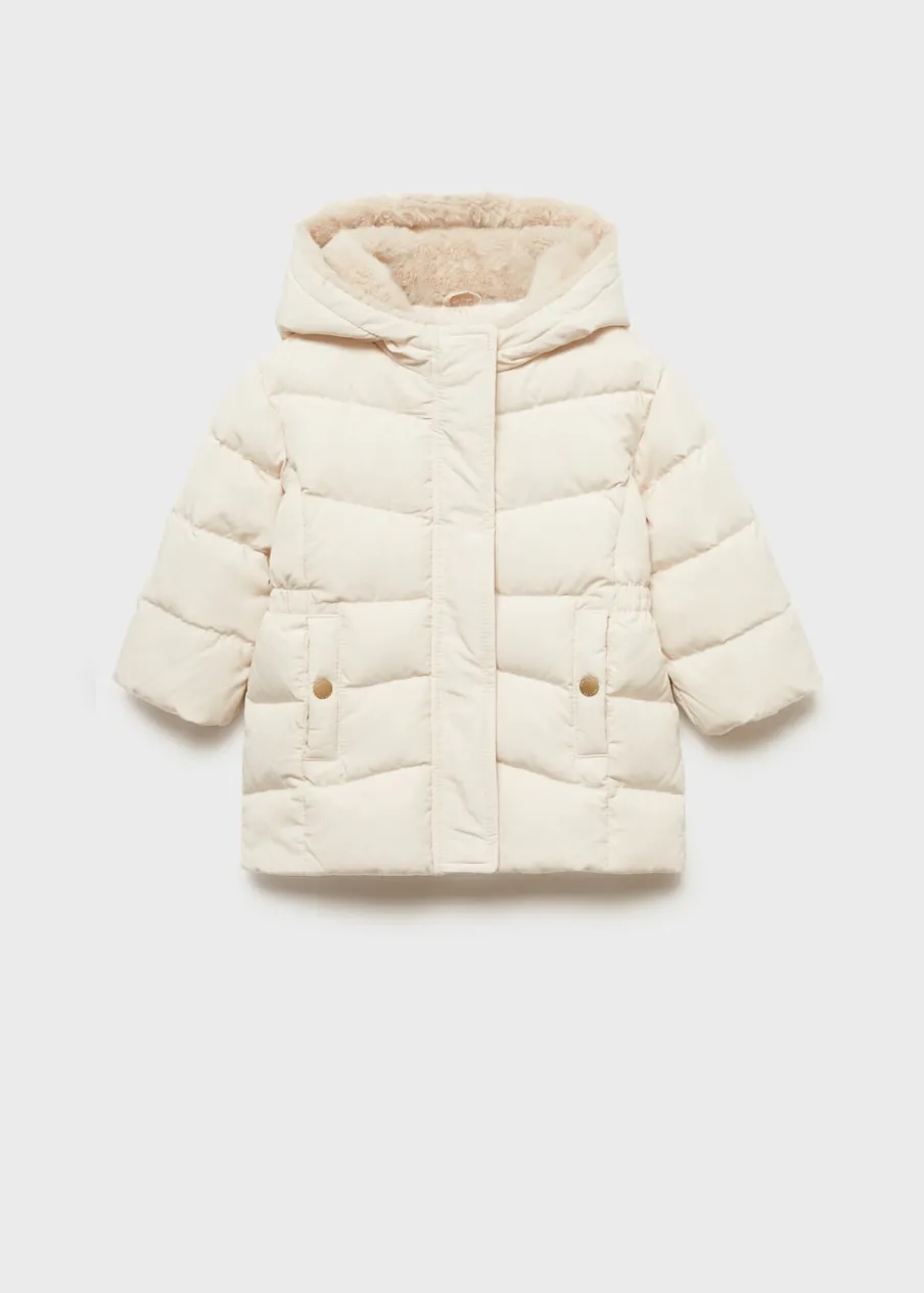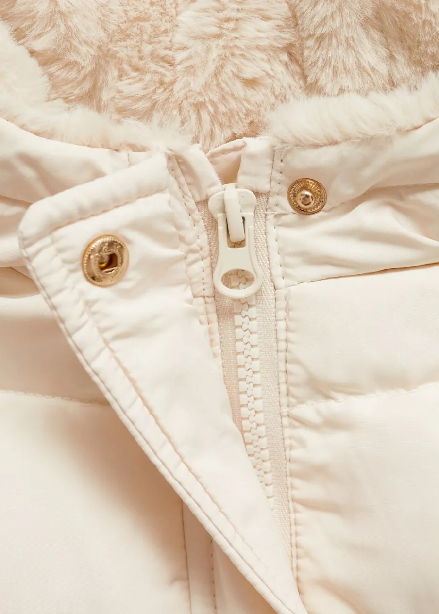 Model pikowany. Model prosty. Kaptur z obszyciem ze sztucznego futra. Długi rękaw. Z przodu dwie kieszenie z zapięciem na zatrzask. Marszczenie z tyłu. Wewnętrzna podszewka. Wewnętrzna etykieta na dane osobowe. Kryte zapięcie na suwak i guziki.