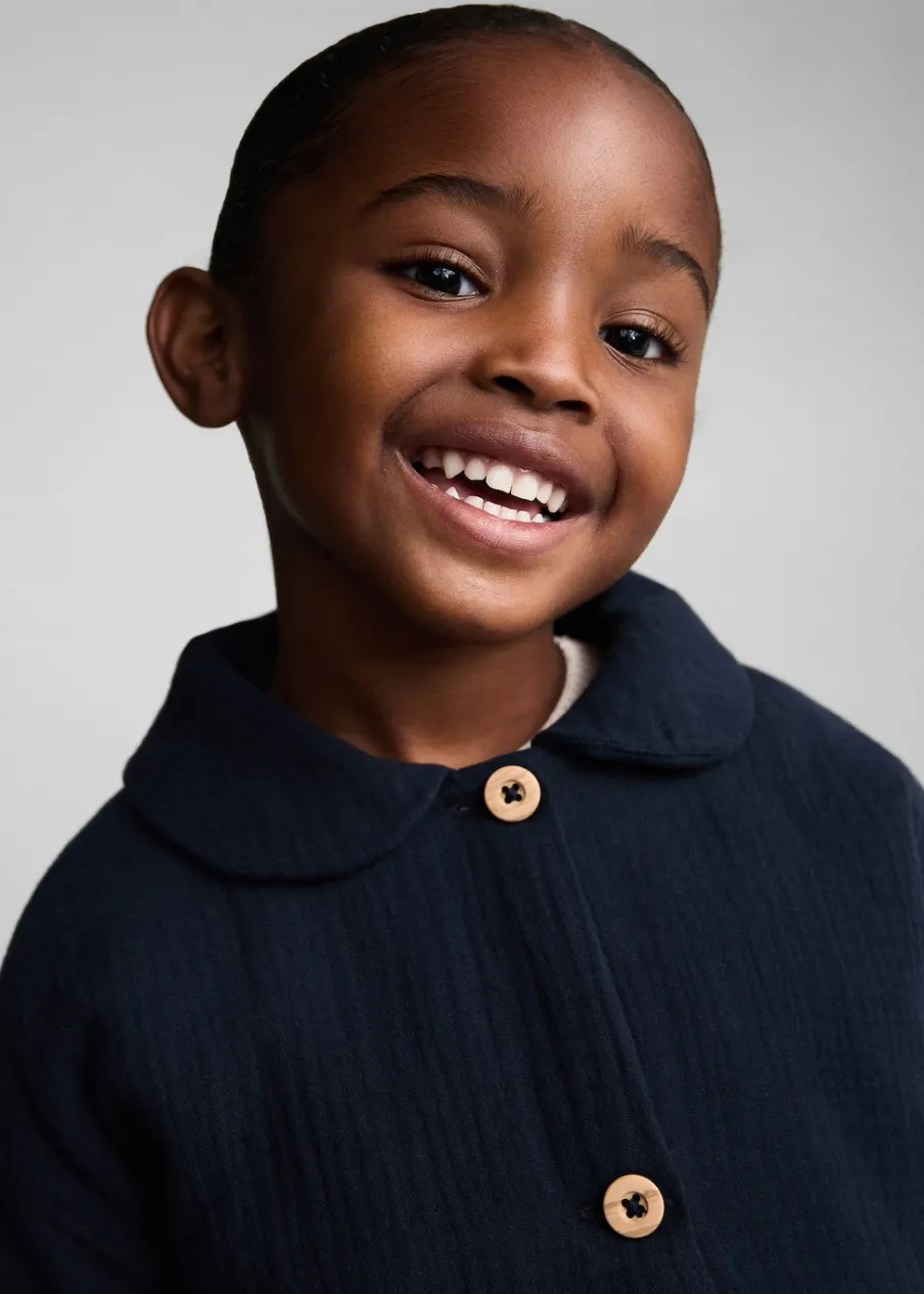 Opis100% bomull. Model prosty. Kołnierzyk bebe. Długi rękaw. Dwie kieszenie z przodu. Guziki z imitacji drewna. Za…