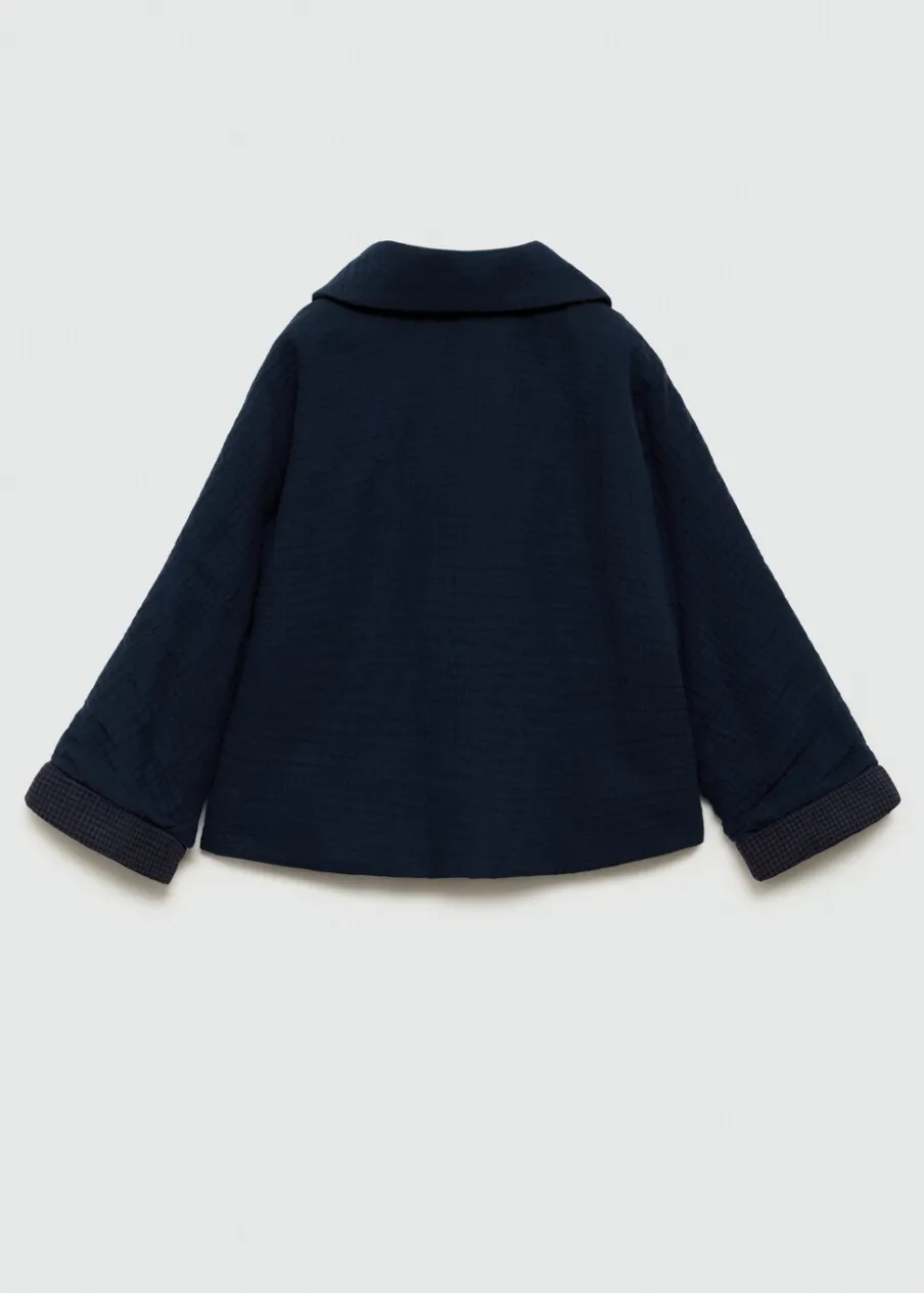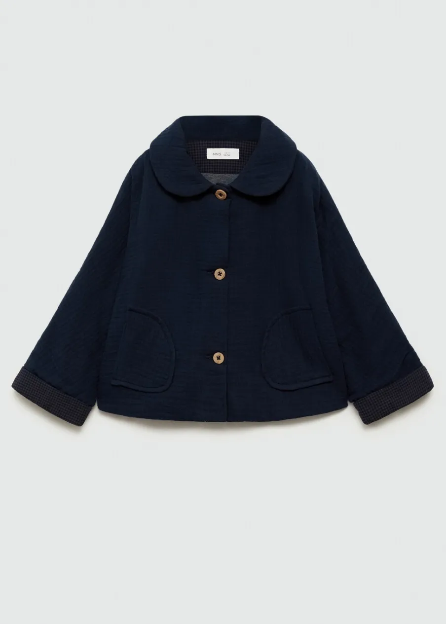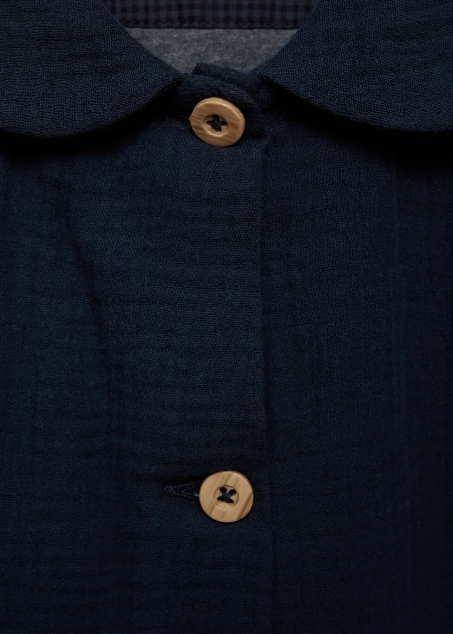 100% bomull. Model prosty. Kołnierzyk bebe. Długi rękaw. Dwie kieszenie z przodu. Guziki z imitacji drewna. Zapięcie z tyłu na guziki.