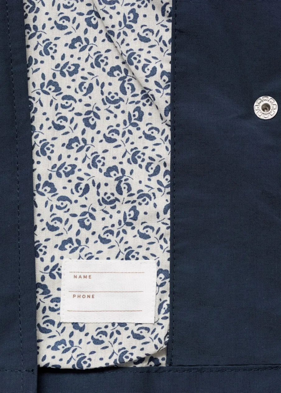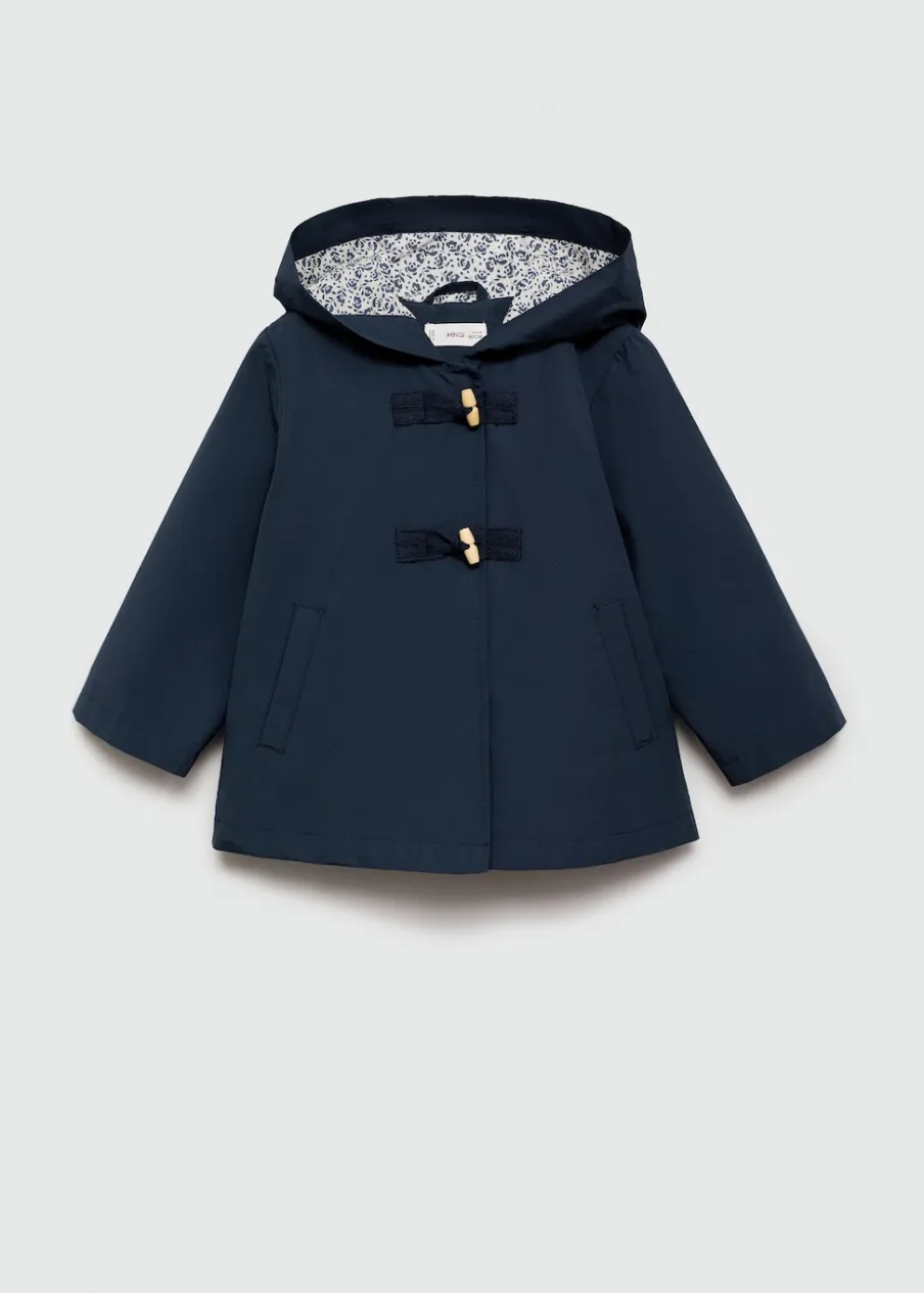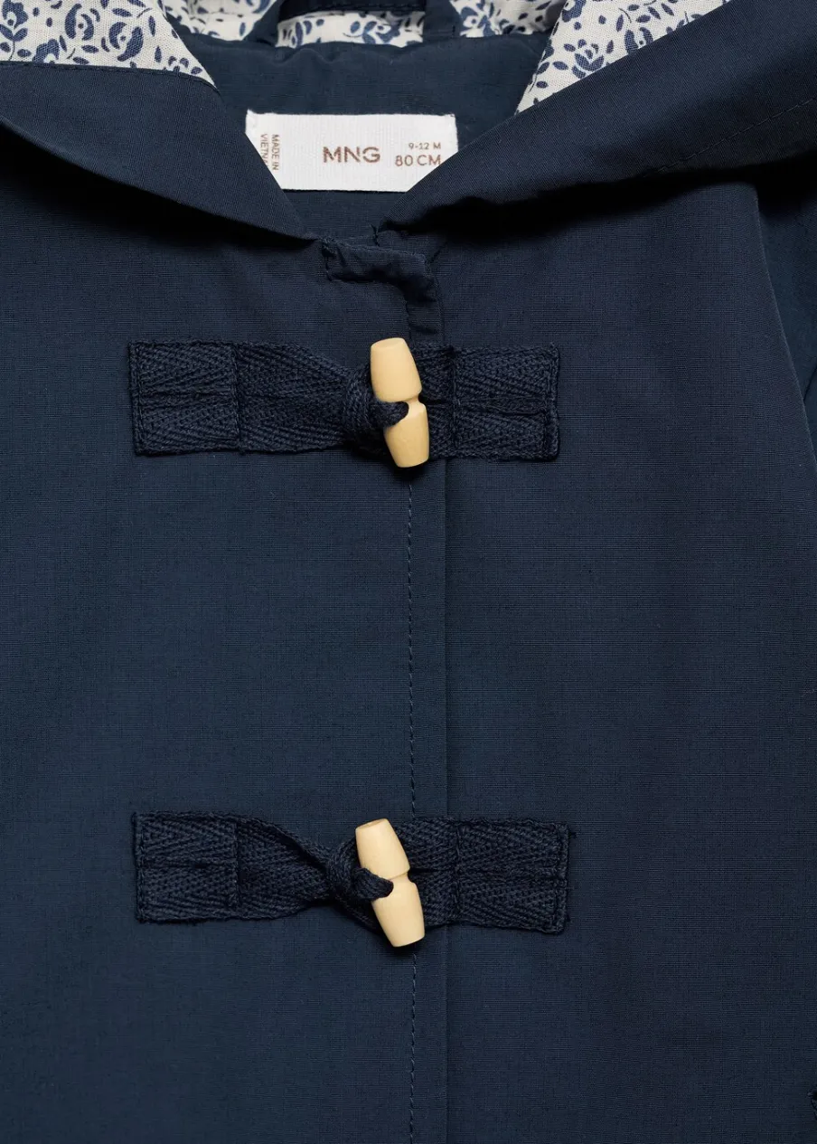 Tkanina z bawełną. Nieprzemakalny materiał. Model prosty. Model długi. Bawełniana podszewka. Kaptur z podszyciem. Wzorzysta podszewka. Dwurzędowe zapięcie na guziki z przodu.