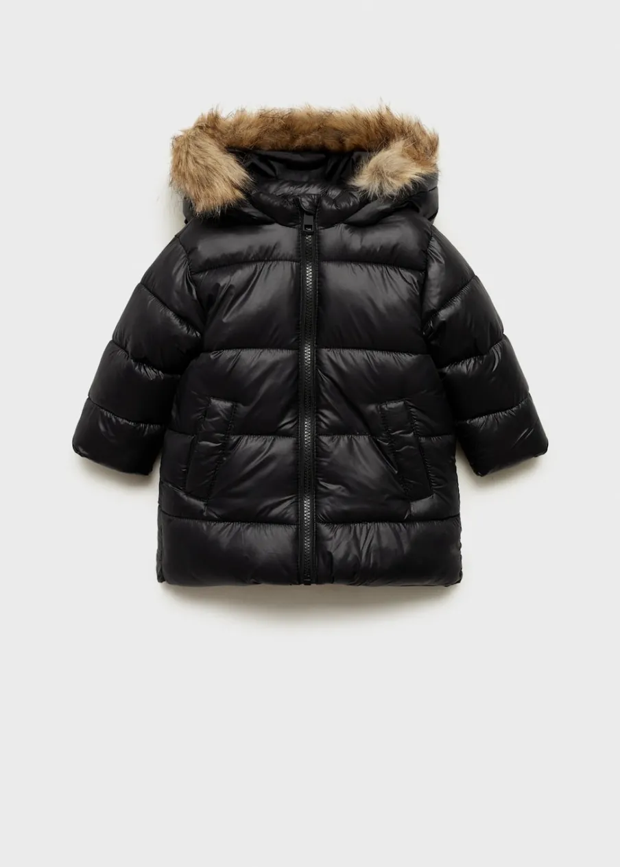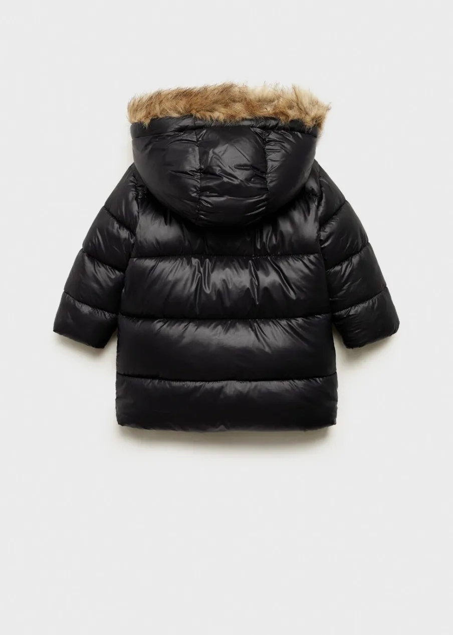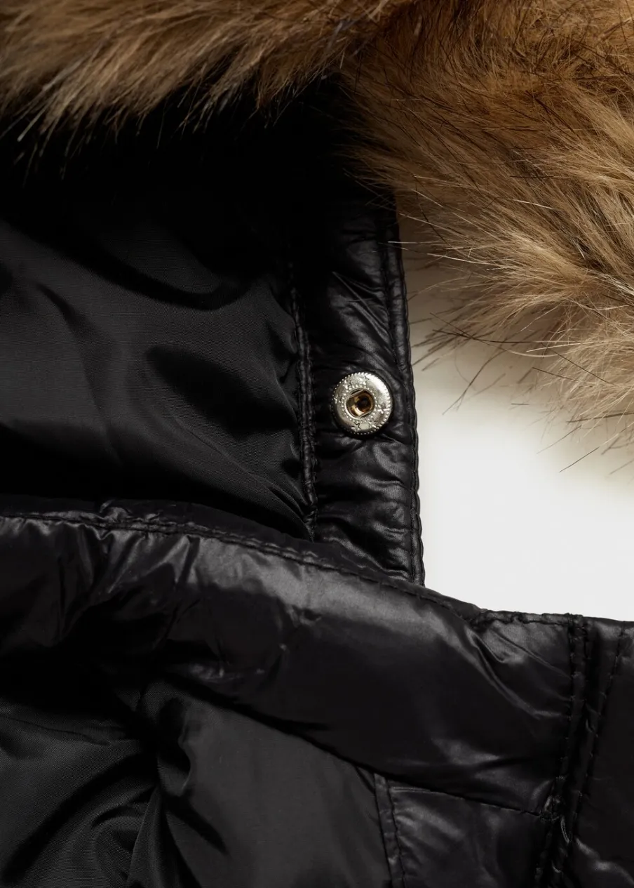 Golf. Długi rękaw. Model prosty. Etykieta na dane kontaktowe. Zapięcie z tyłu na suwak. Model pikowany. Kaptur z obszyciem ze sztucznego futra. Wewnętrzna podszewka. Dwie kieszenie boczne.