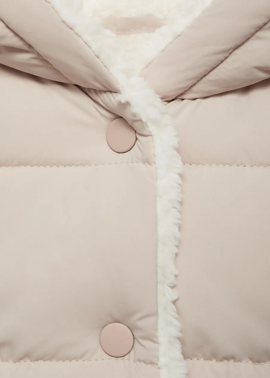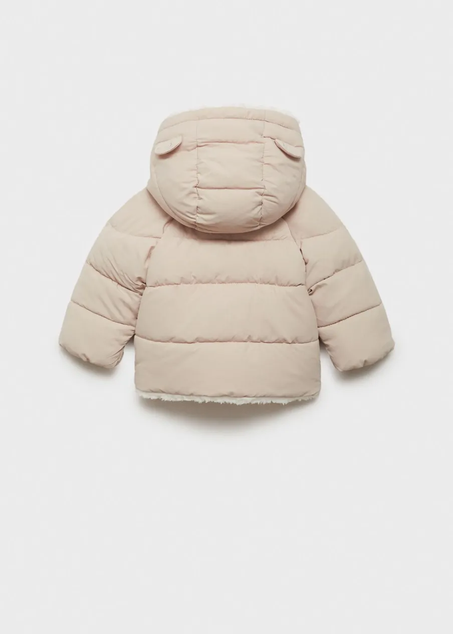 Model pikowany. Model prosty. Długi rękaw. Kaptur z uszkami. Etykieta na dane kontaktowe. Dwie kieszenie na guzik z tyłu. Zapięcie na zatrzaski z przodu. Kurtka puchowa podszyta futerkiem.