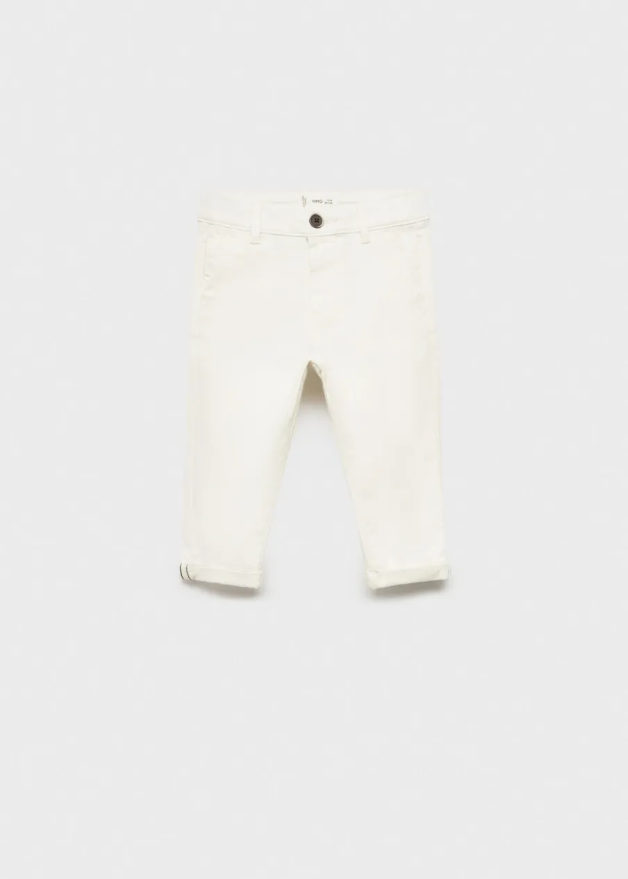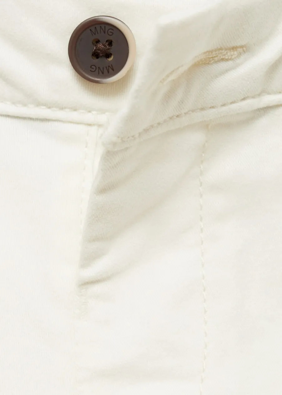 Bawełniana tkanina. Model prosty. Dwie kieszenie boczne. Dwie wpuszczane kieszenie tylne. Zapięcie na suwak i guzik.