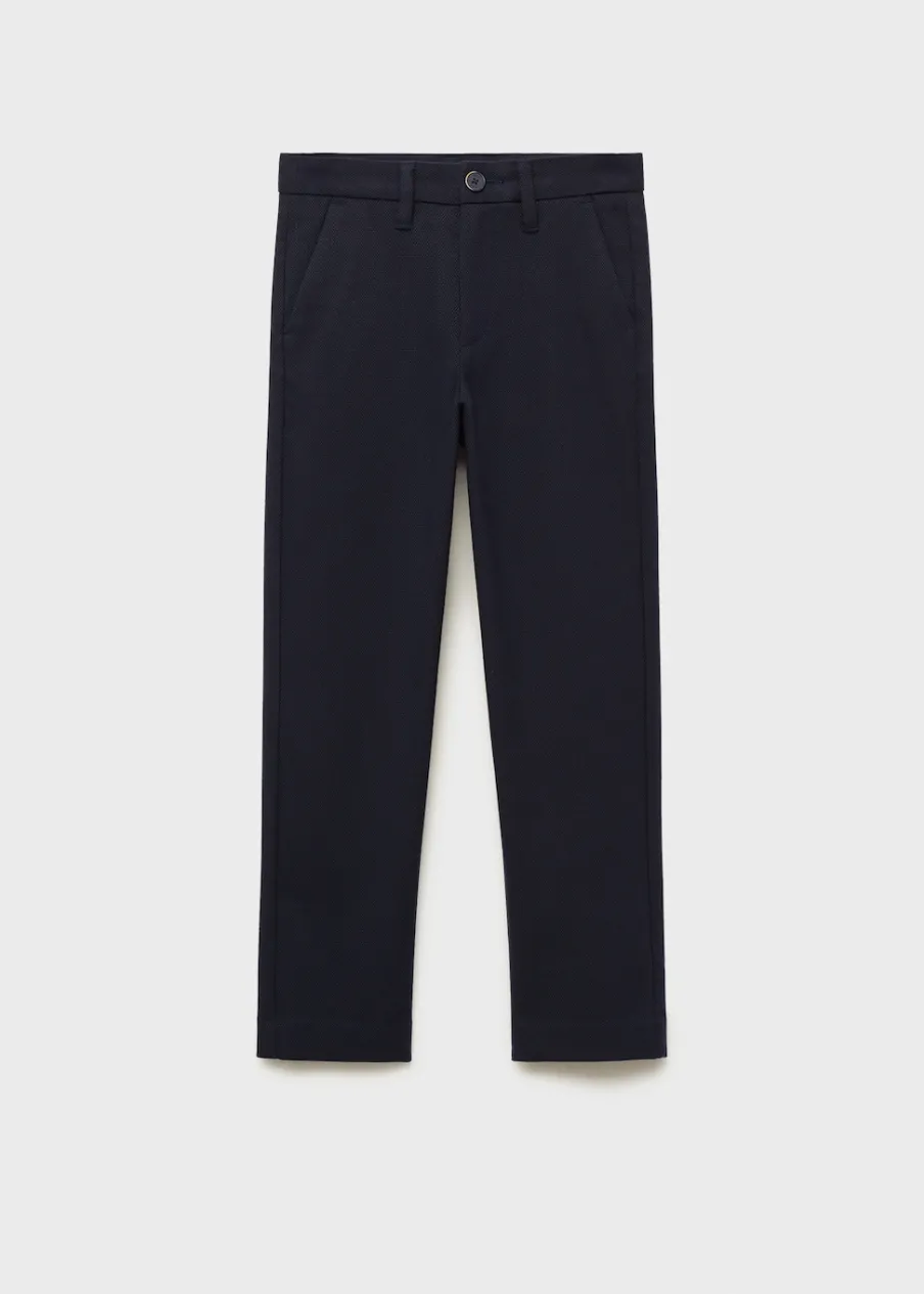 Bawełniana tkanina. Tkanina z piki. Model prosty. Dwie kieszenie boczne. Dwie wpuszczane kieszenie z tyłu. Szlufki. Zapięcie na guzik i zamek.