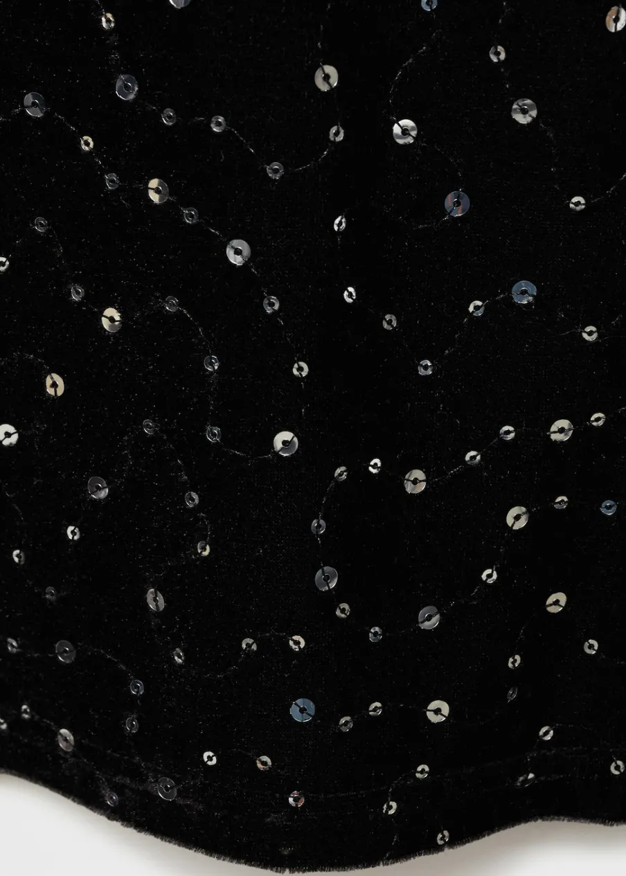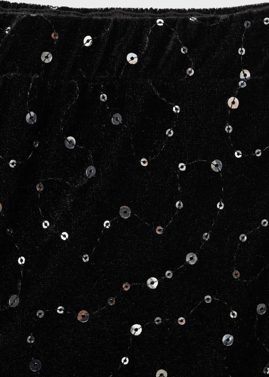 OpisAksamitna tkanina. Ozdobna aplikacja z cekinów. Elastyczna gumka. Fason culotte. Total look. Wewnętrzna podszewka….