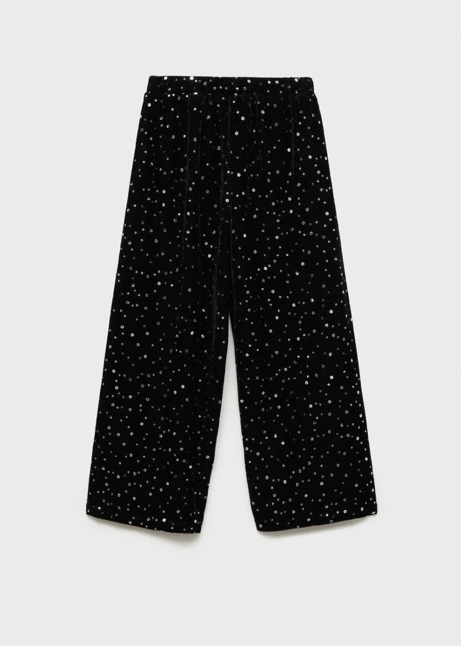 Aksamitna tkanina. Ozdobna aplikacja z cekinów. Elastyczna gumka. Fason culotte. Total look. Wewnętrzna podszewka. Kolekcja wieczorowa i imprezowa.