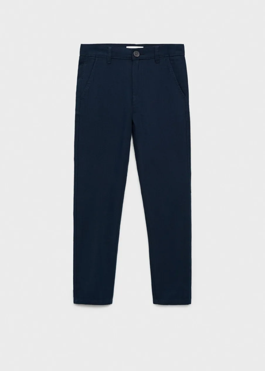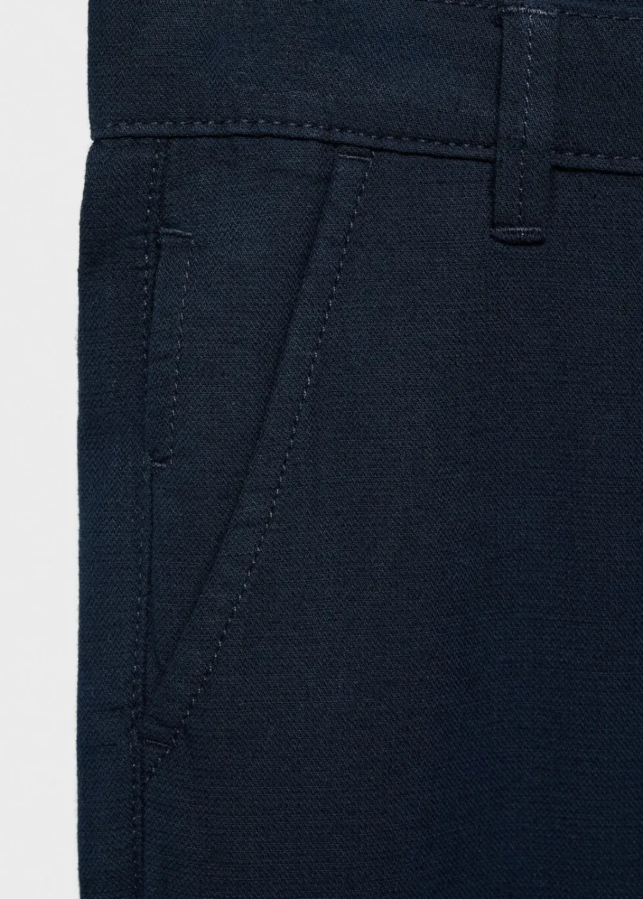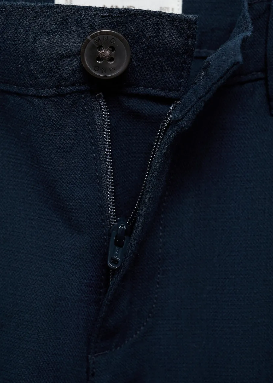 Tkanina mieszanka bawełny i lnu. Krój: skinny. Dwie kieszenie z przodu. Dwie wpuszczane kieszenie z tyłu. Szlufki. Zapięcie na suwak i guzik.