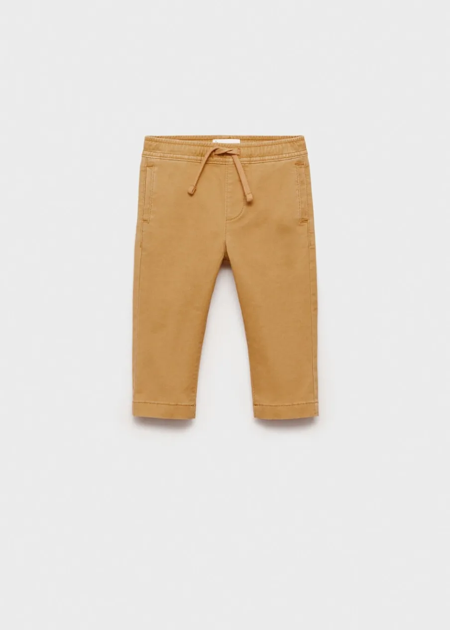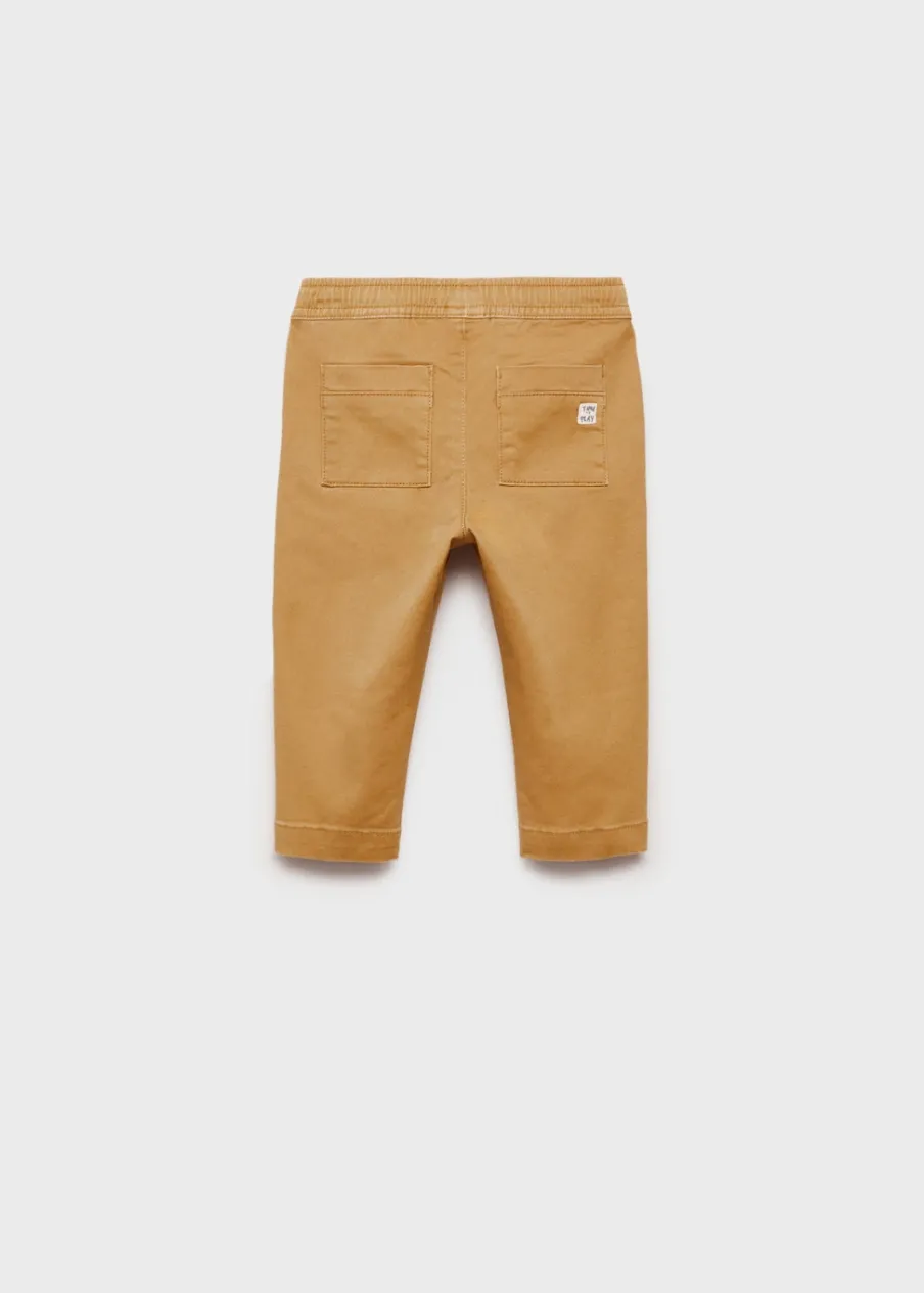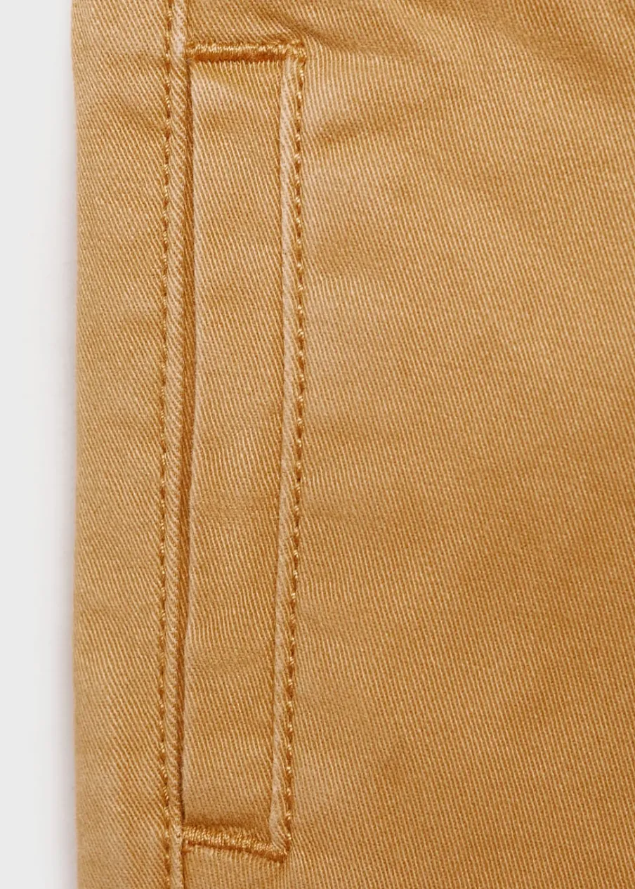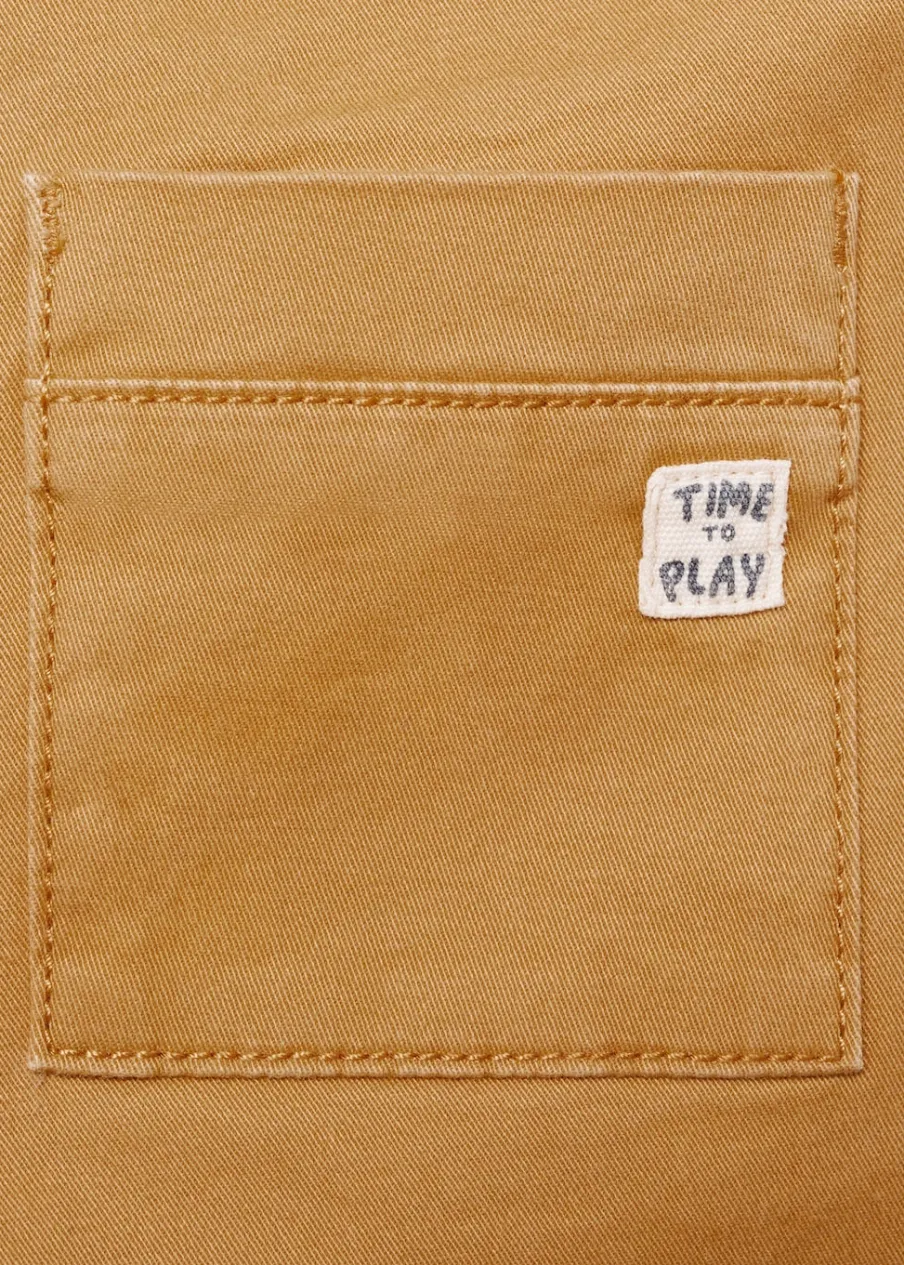 Bawełniana tkanina. Elastyczny pas ze sznurkiem. Dwie kieszenie z wypustkami z przodu. Dwie kieszenie nakładane z tyłu.