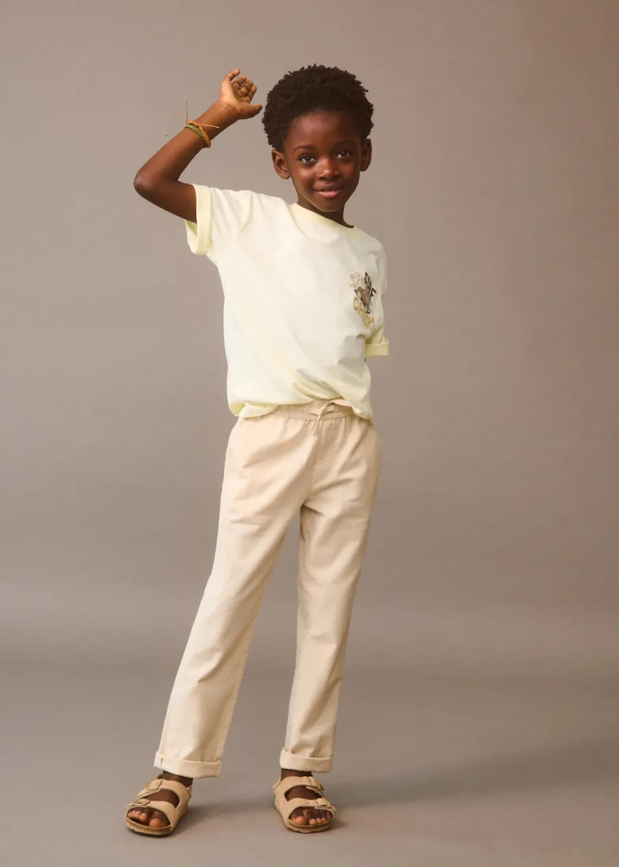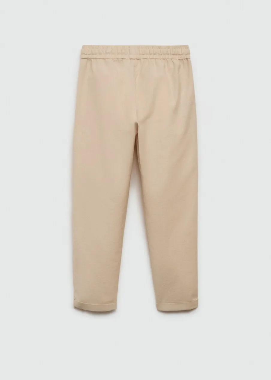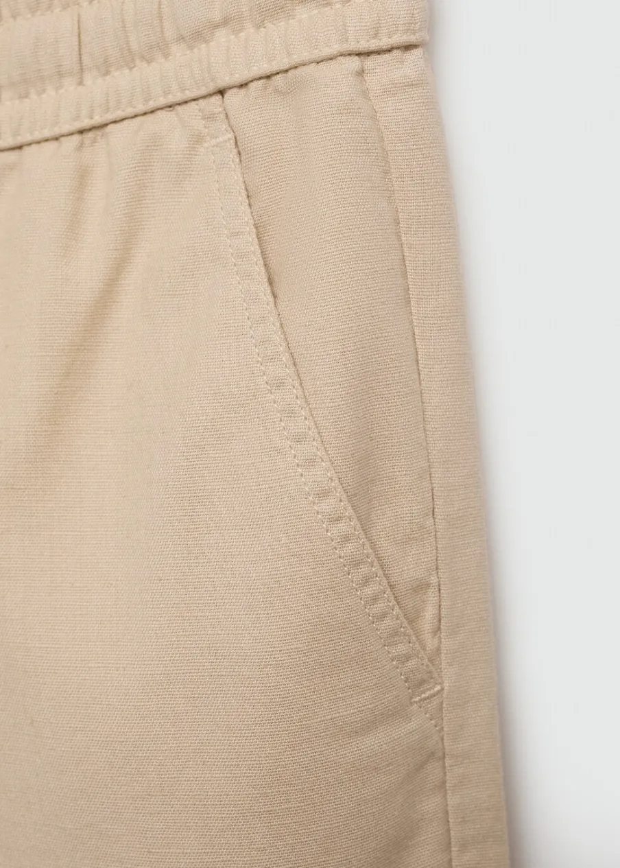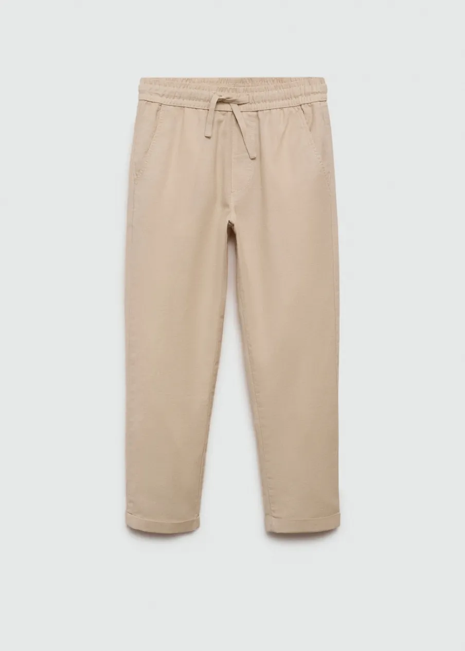 Tkanina z mieszanki lnu i bawełny. Model długi. Model prosty. Elastyczny pas. Wiązanie na sznurek.