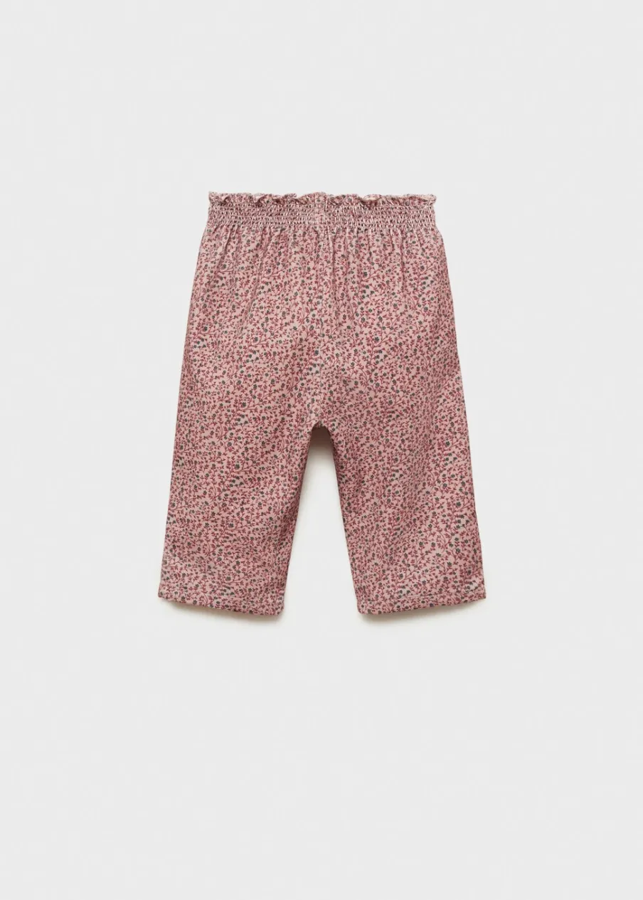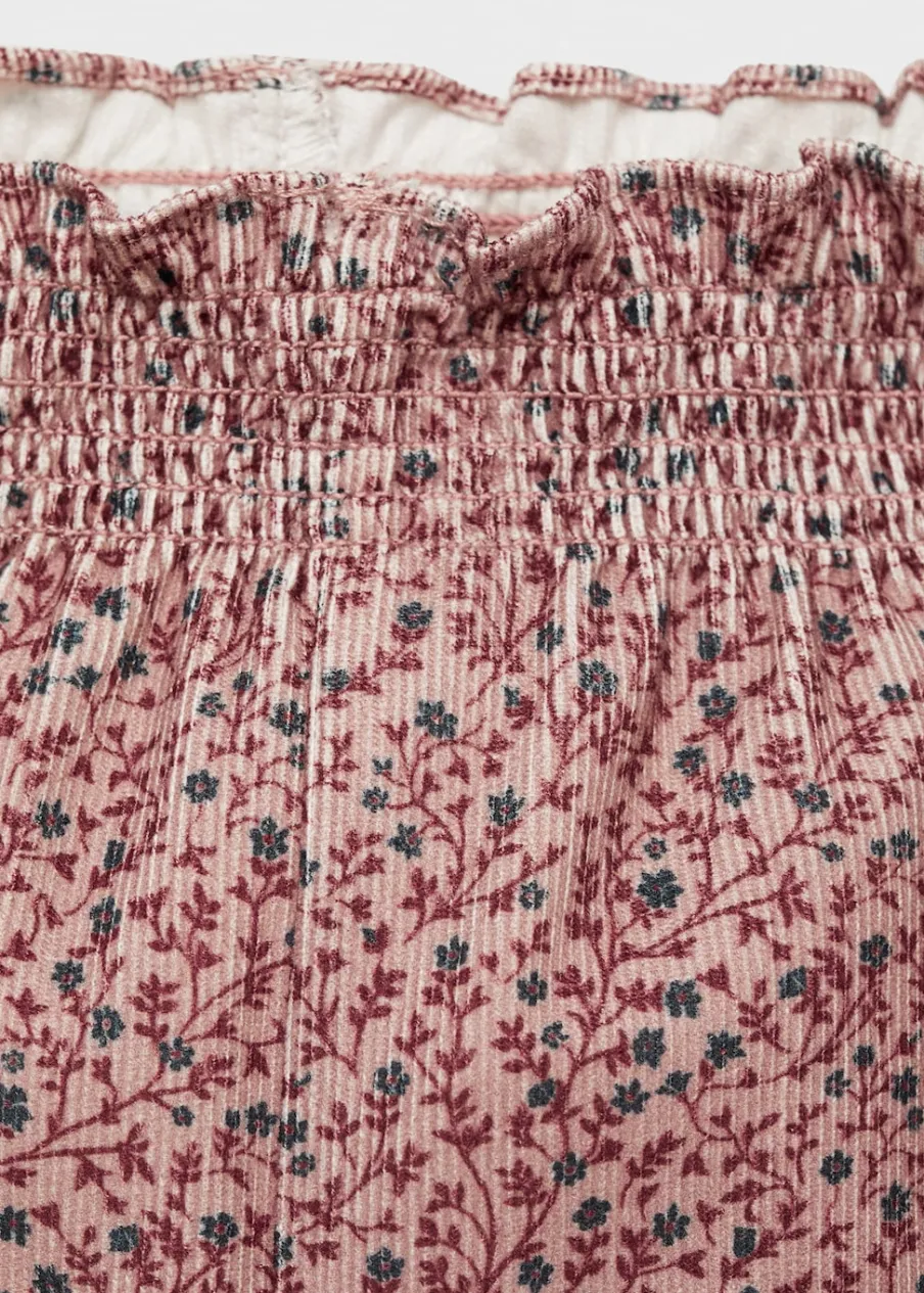 Tkanina sztruksowa. Model prosty. Elastyczny pas. Kwiatowy wzór. Marszczona tekstura. Bez zapięcia.
