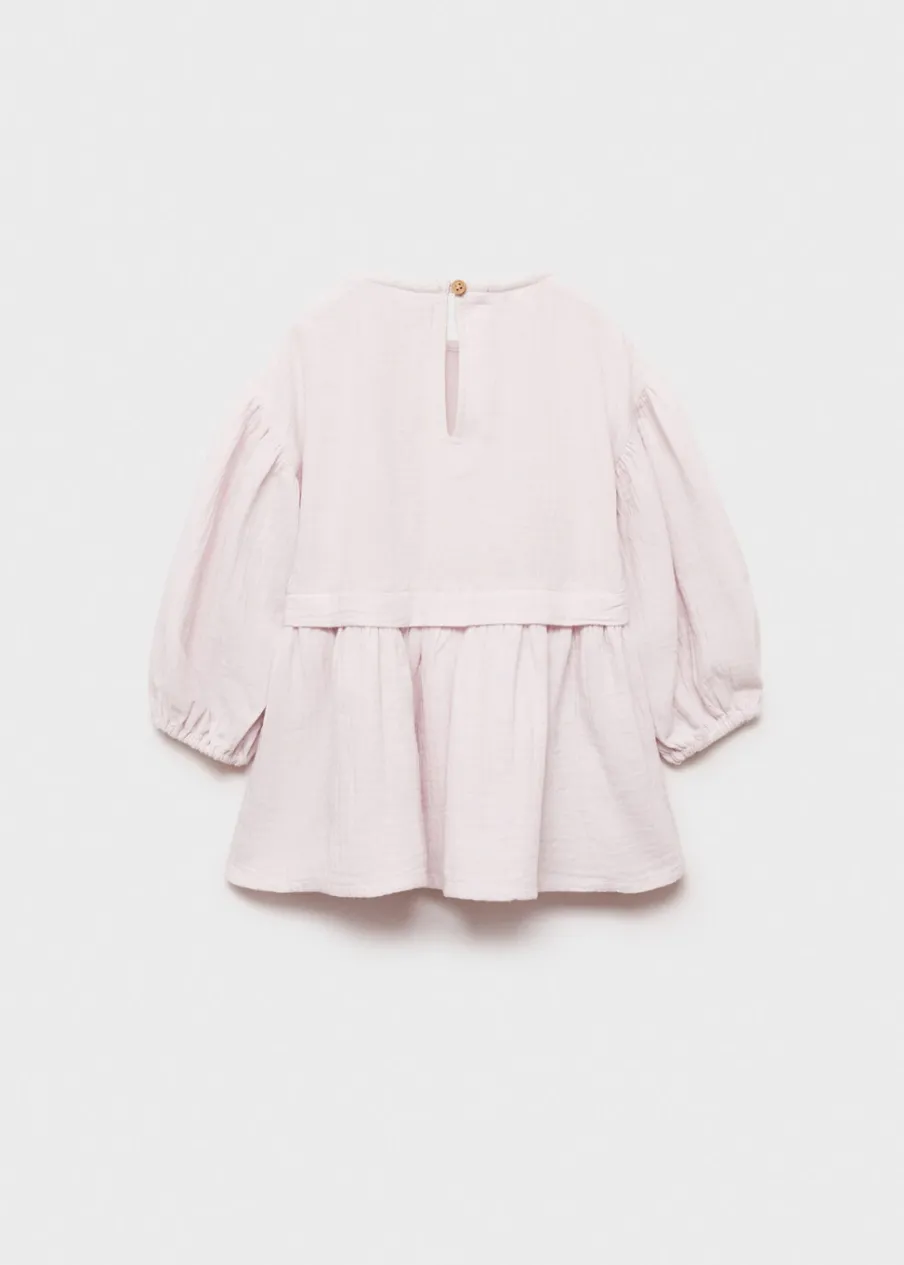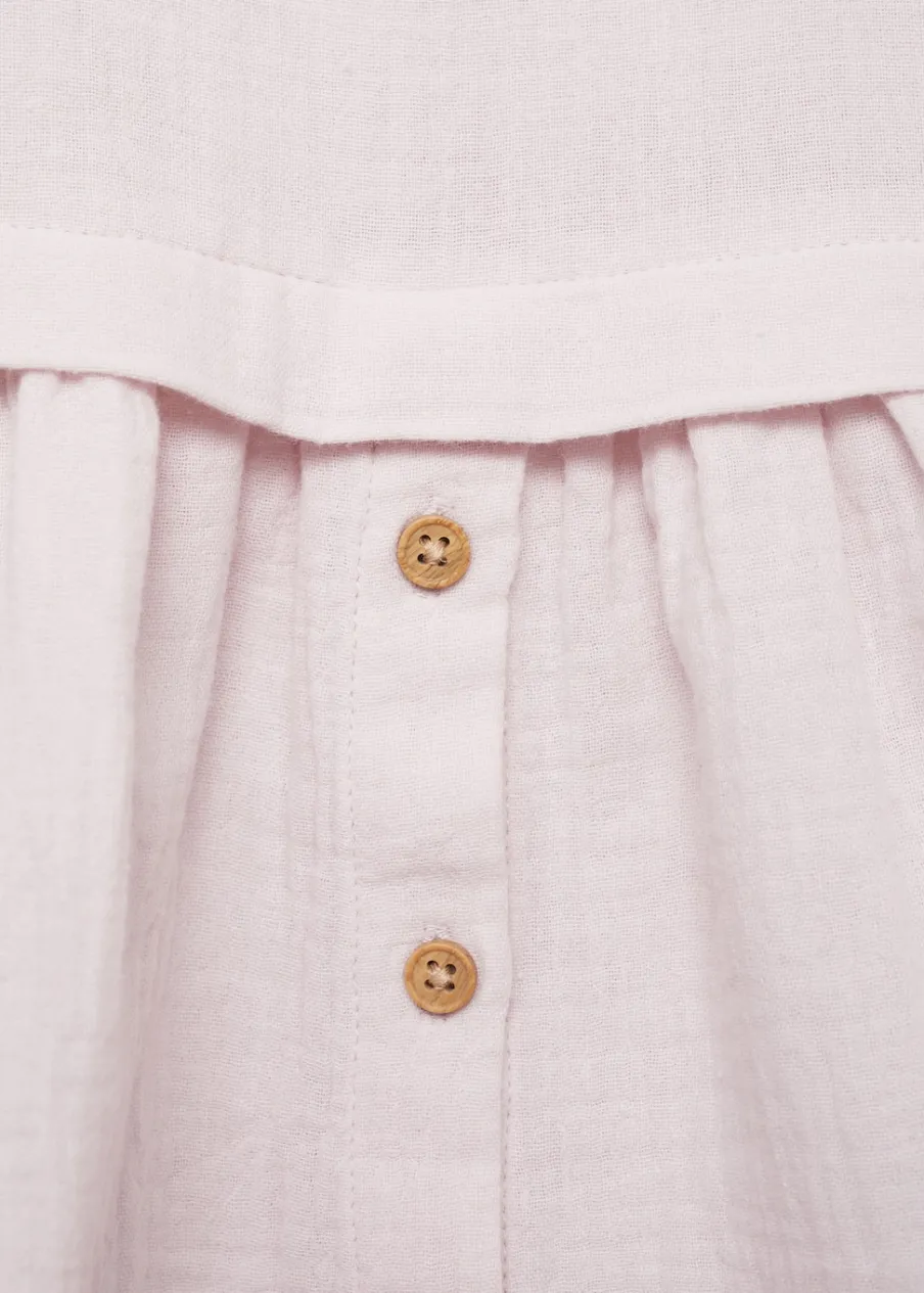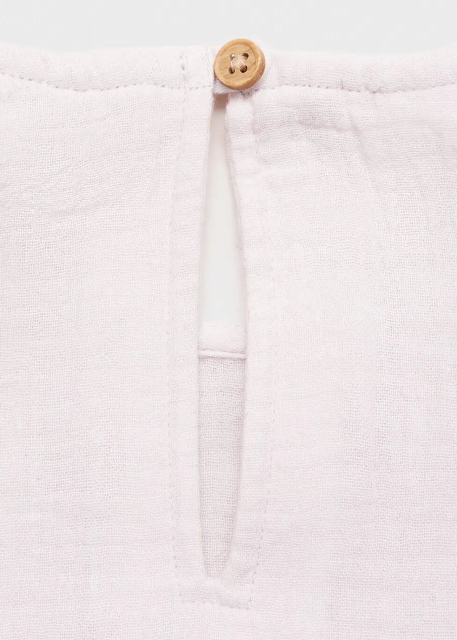 Bawełna 100%. Model prosty. Krótki krój. Okrągły dekolt. Długi bufiasty rękaw. Guziki z imitacji drewna. Rozcięcie u dołu z zapięciem na guziki. Zapięcie na guzik z tyłu.