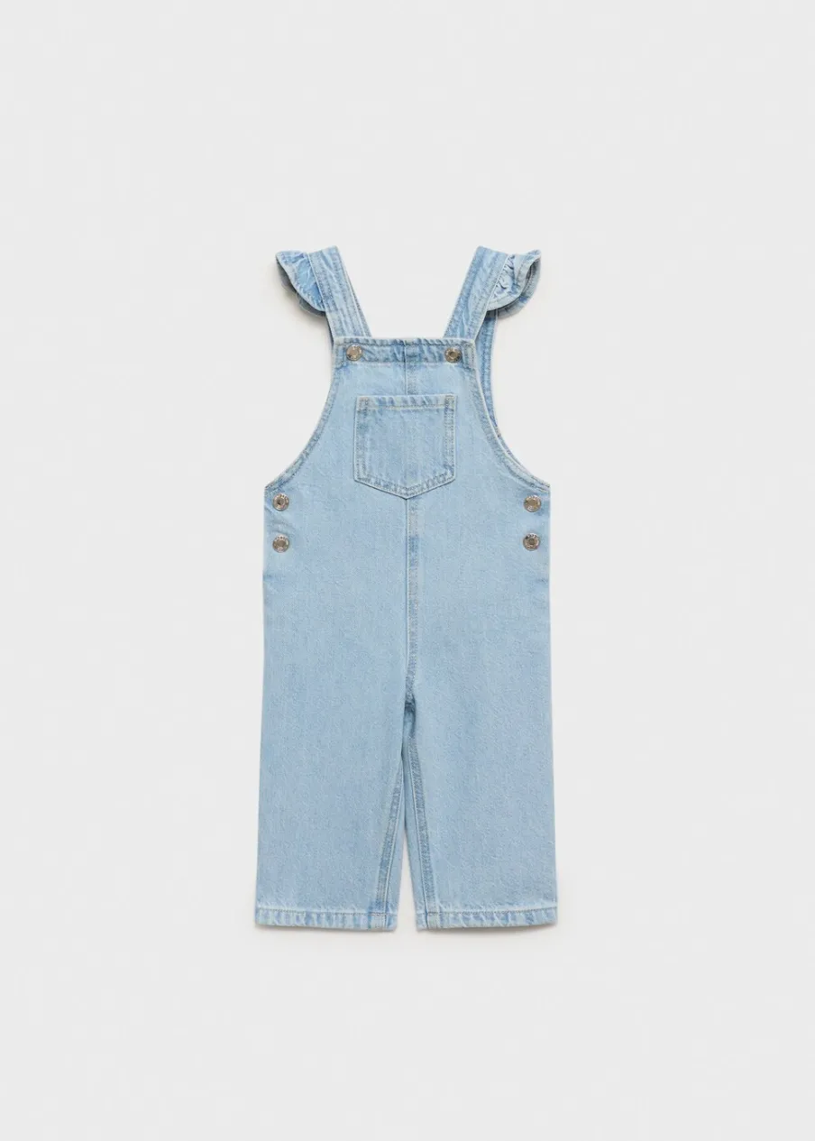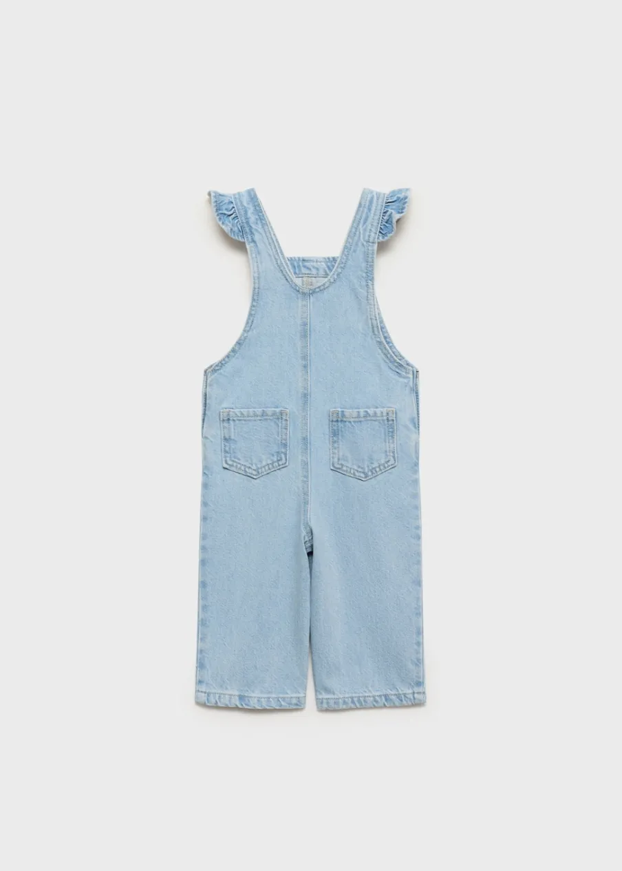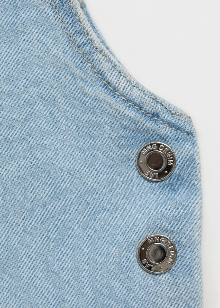 Tkanina bawełniana w dżinsowym stylu. Model prosty. Ramiączka z falbaną. Kwadratowy dekolt. Naszywana kieszeń z przodu. Kieszenie nakładane z tyłu. Boczne zapięcie na zatrzaskowe guziki. Metalowe guziki.