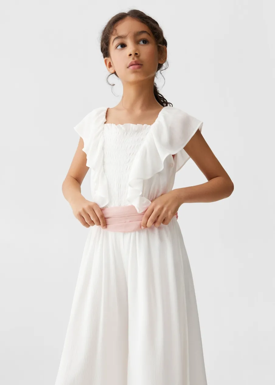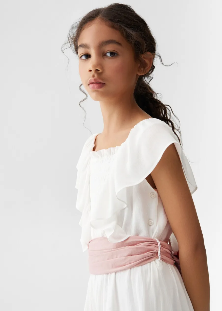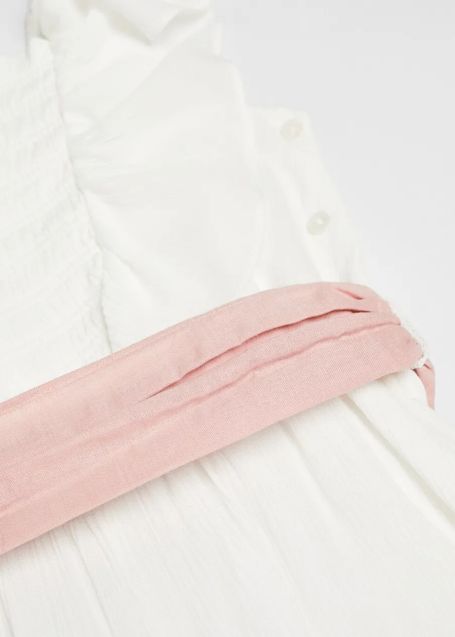 Model długi. Model prosty. Okrągły dekolt. Długi rękaw. Krótki rękaw z falbanką. Regulowany pasek. Zapięcie na guziki. Wewnętrzna podszewka.