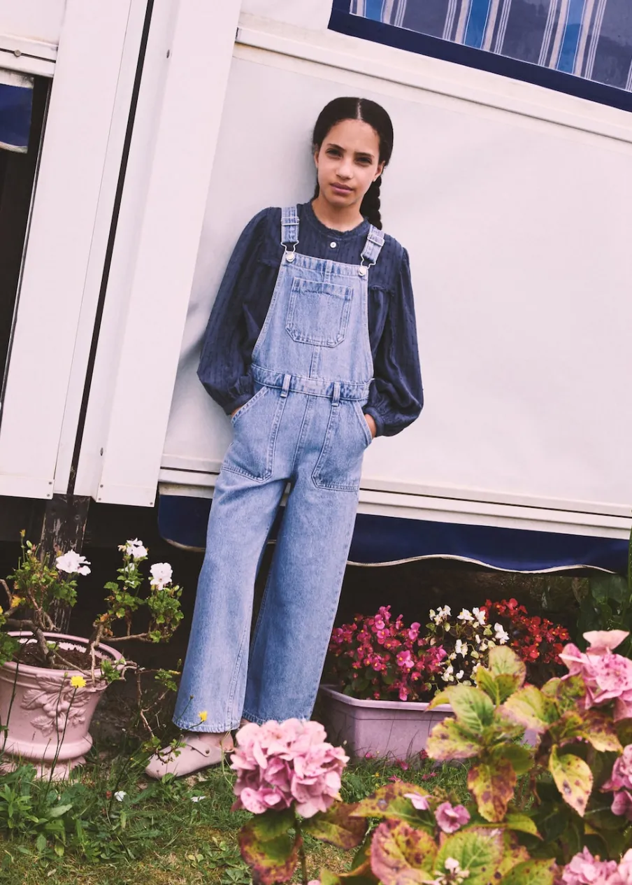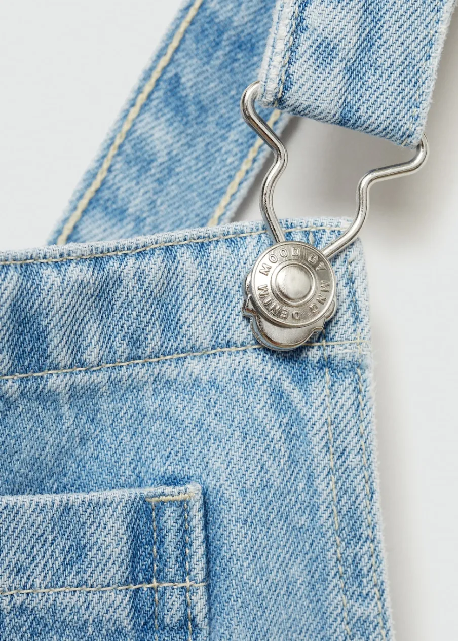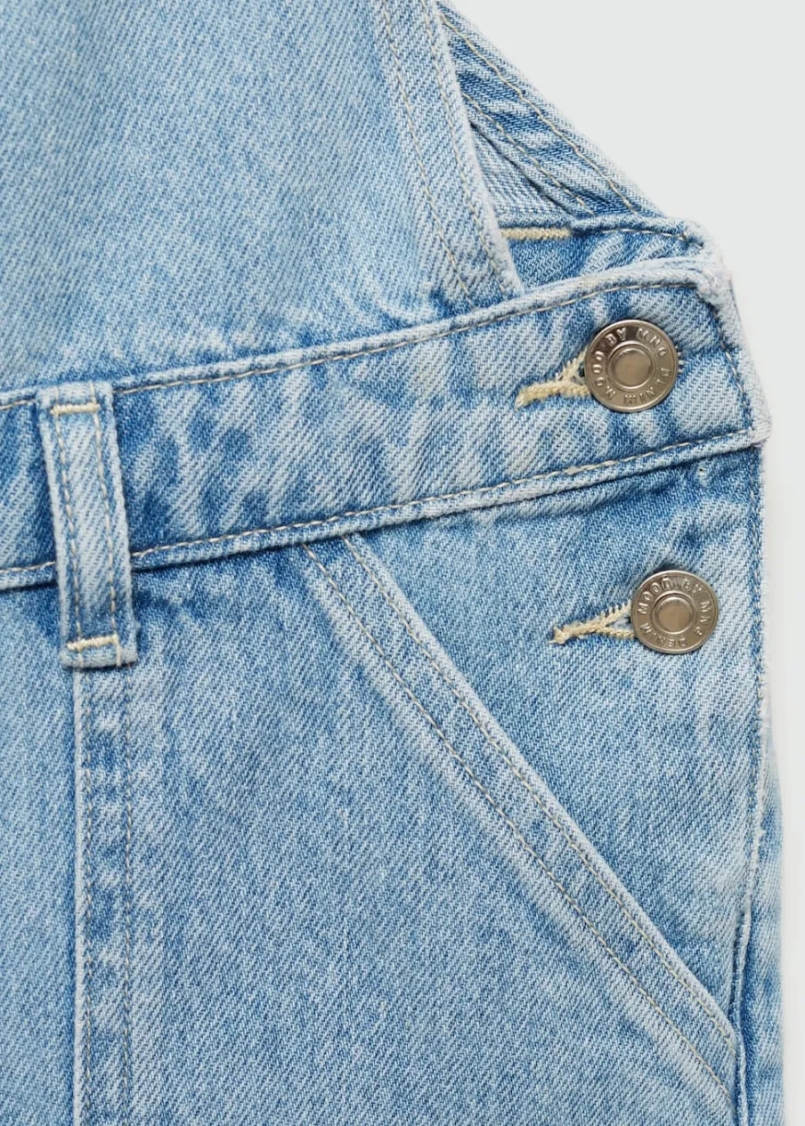 Kolekcja Powrót do szkoły. Tkanina bawełniana w dżinsowym stylu. Model prosty. Kwadratowy dekolt. Ramiączka skrzyżowane na plecach. Regulowane ramiączka zapinane z tyłu na haftki. Model długi. Zapięcie na boczne guziki. Pięć kieszeni.