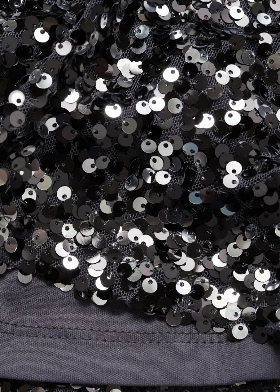 OpisOzdobna aplikacja z cekinów. Model prosty. Krótki krój. Okrągły dekolt. Długi rękaw. Zapięcie na guzik. Zapi…