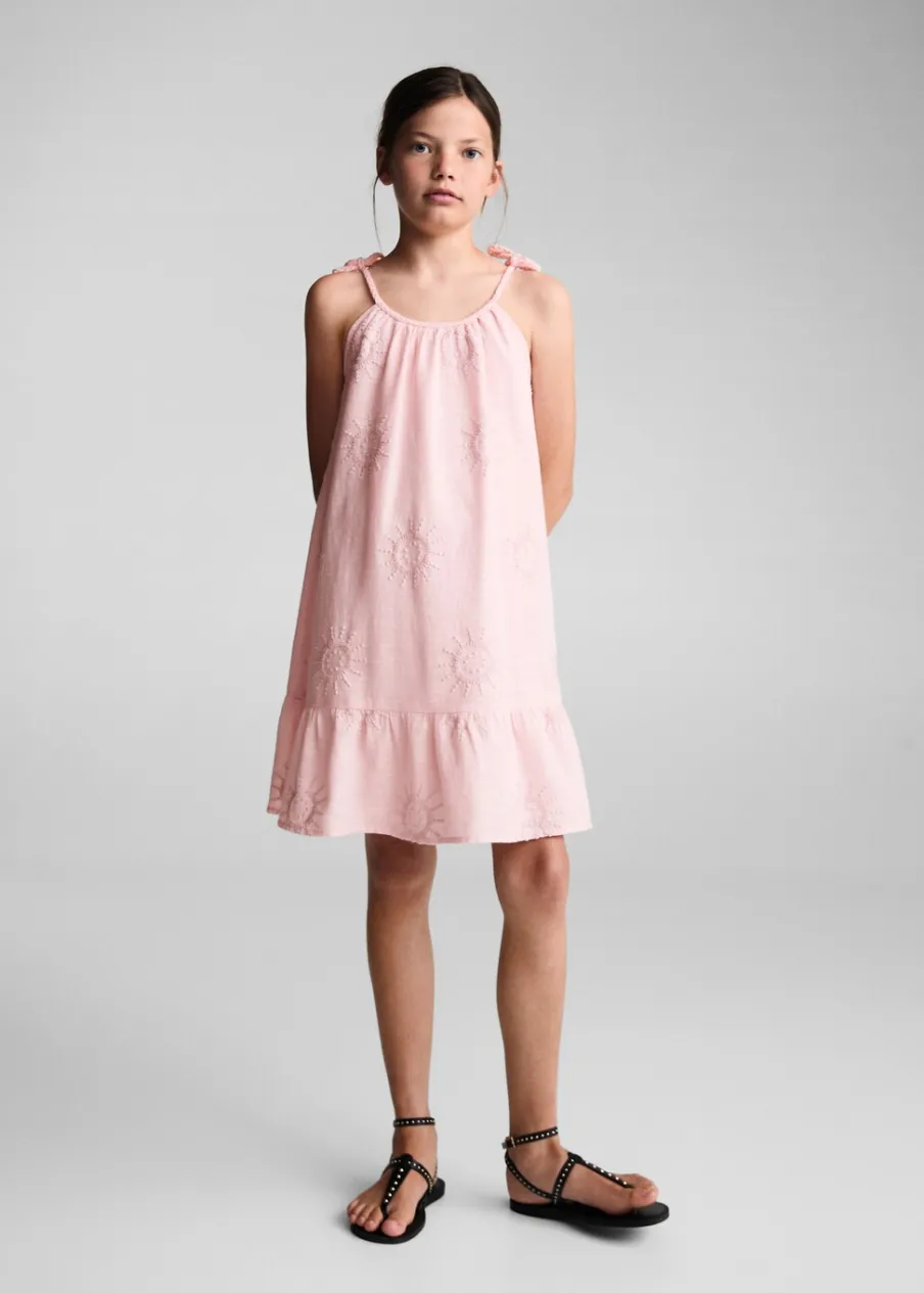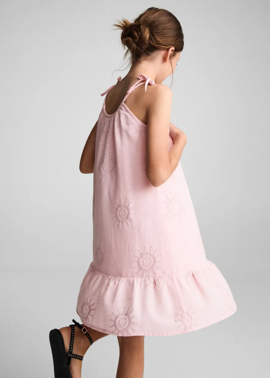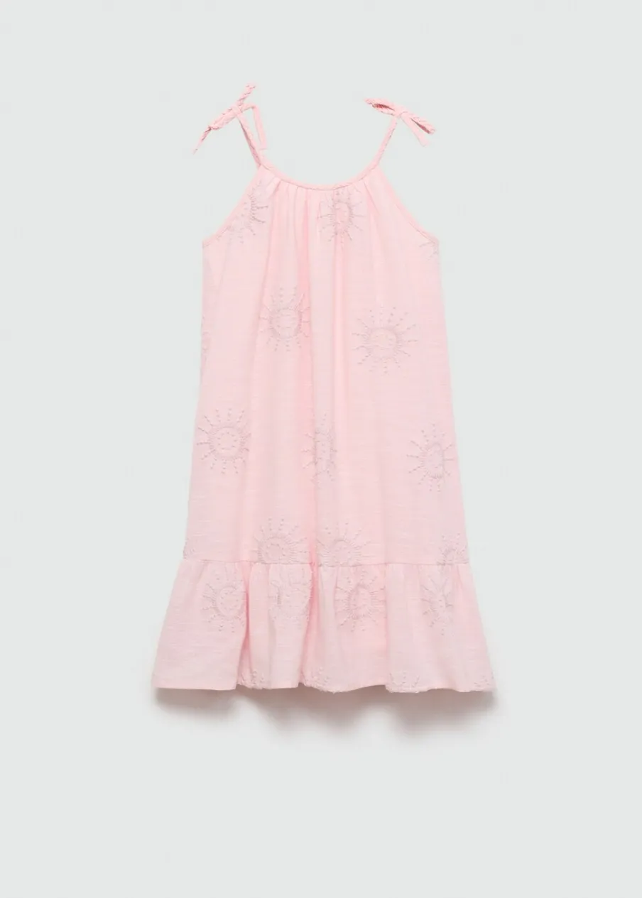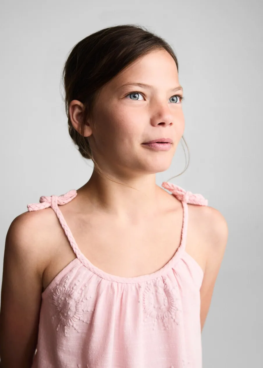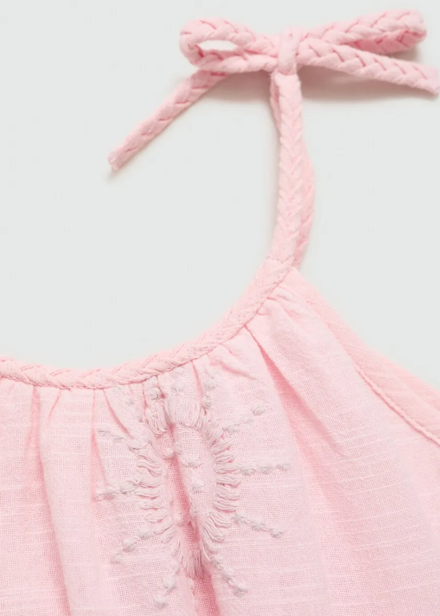Opis100% bomull. Krój do kolan. Cienkie ramiączka. Okrągły dekolt. Plecione szelki. Ramiączka wiązane na kokard…