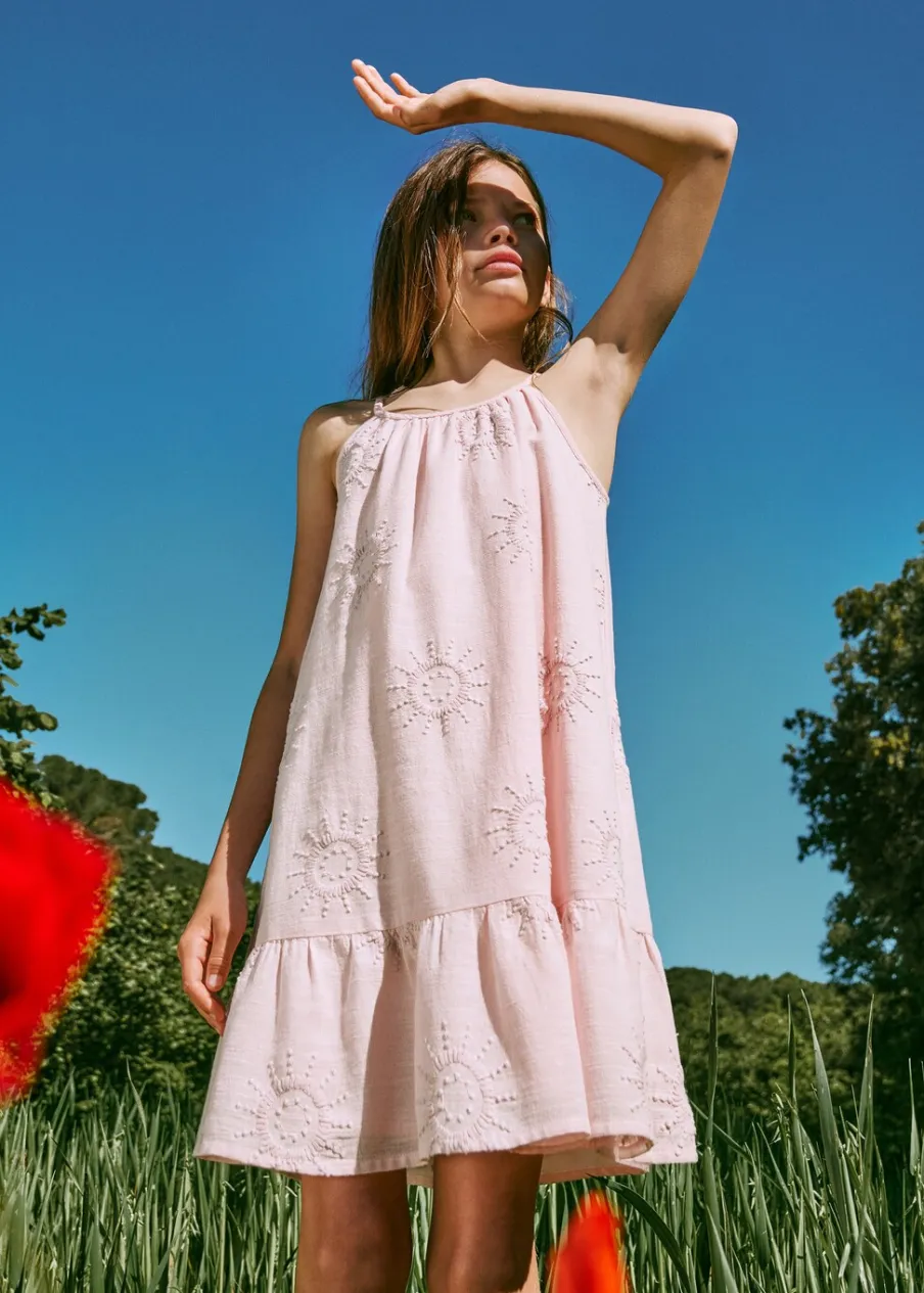 100% bomull. Krój do kolan. Cienkie ramiączka. Okrągły dekolt. Plecione szelki. Ramiączka wiązane na kokardki. Falbanki u dołu. Cienka tkanina.