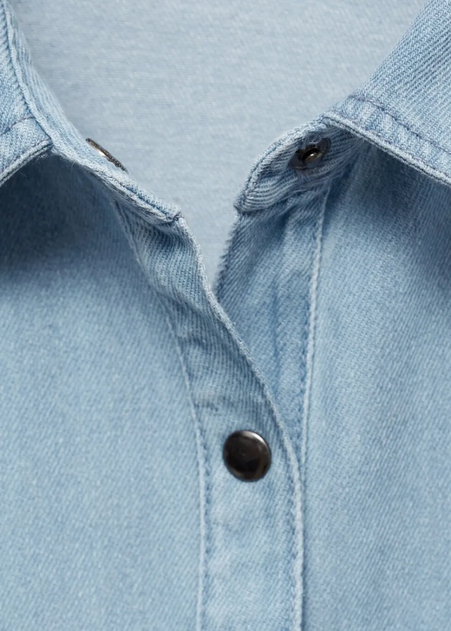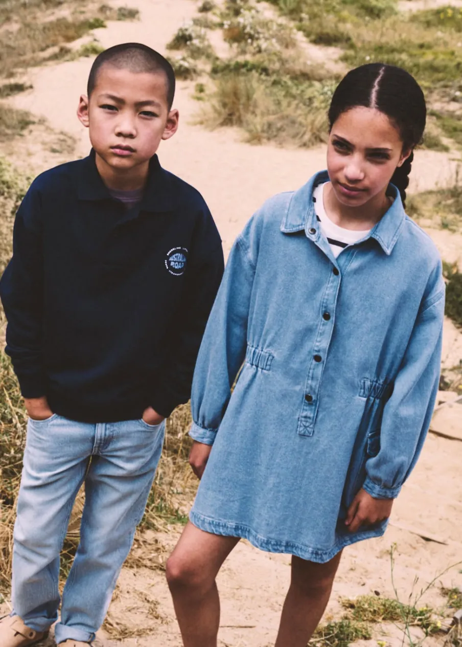 OpisKolekcja Powrót do szkoły. Tkanina bawełniana w dżinsowym stylu. Krótki krój. Koszulowy kołnierz. Długi ręk…