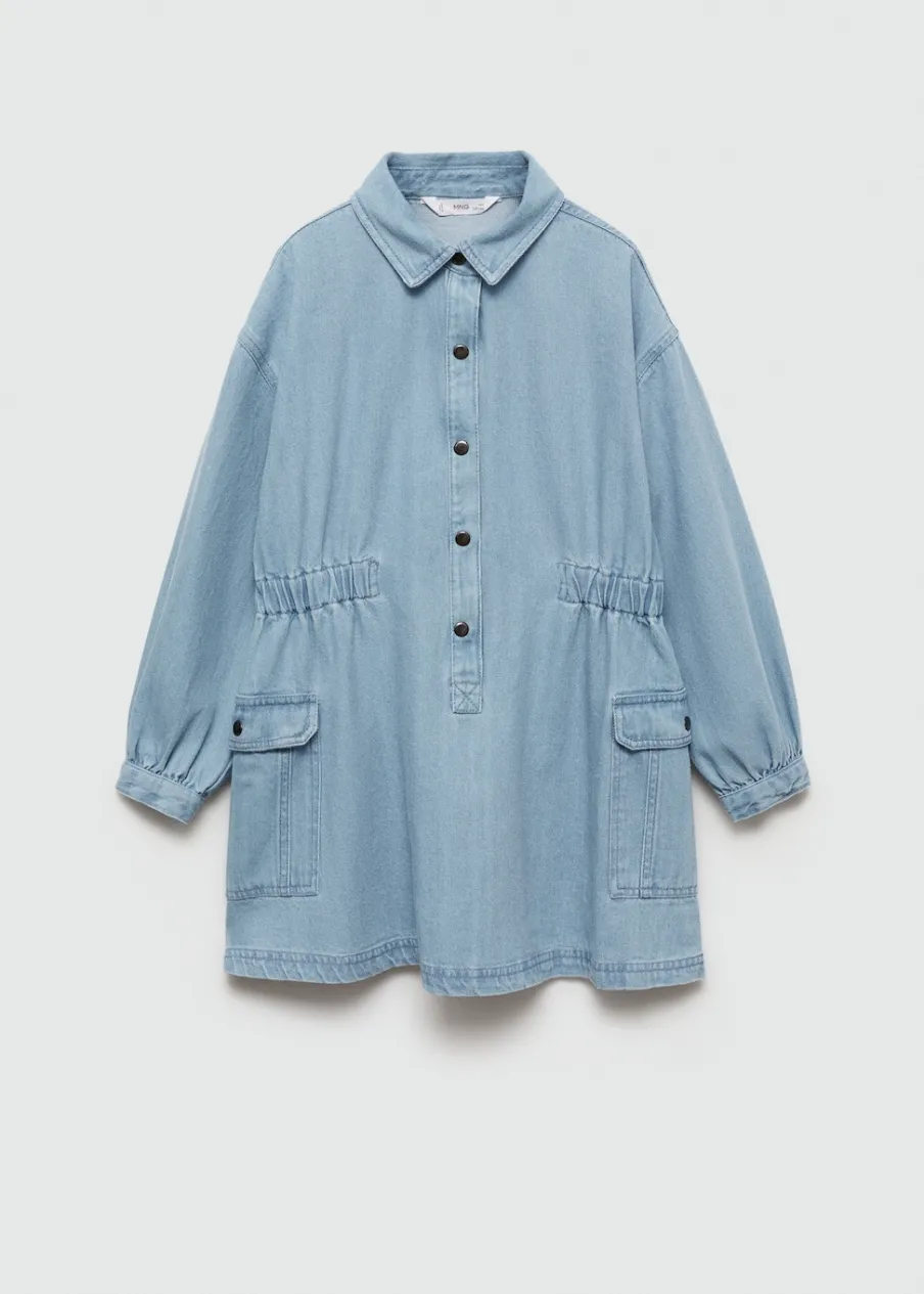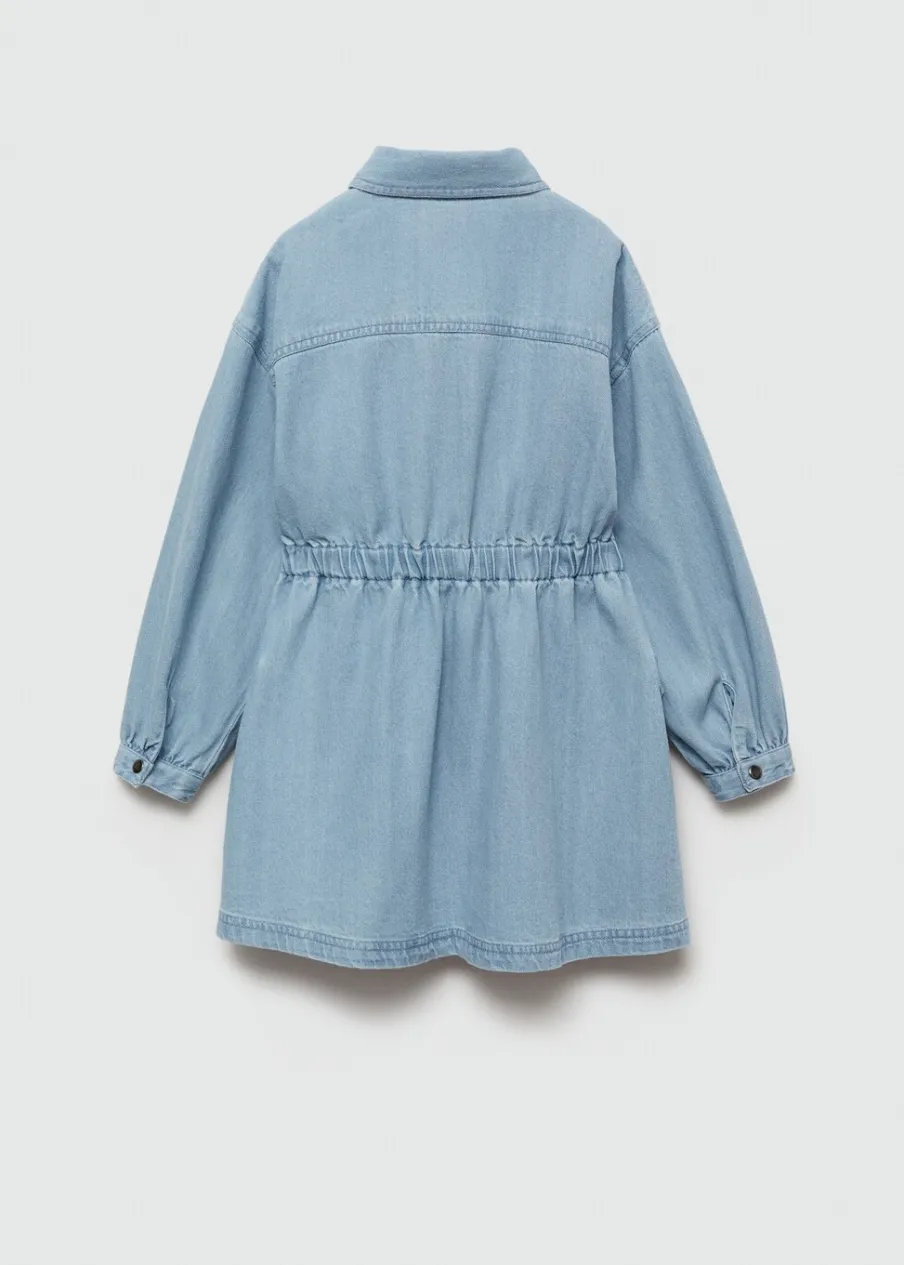 Kolekcja Powrót do szkoły. Tkanina bawełniana w dżinsowym stylu. Krótki krój. Koszulowy kołnierz. Długi rękaw. Marszczona talia. Dwie kieszenie. Zapięcie z przodu. Zapięcie na guziki.