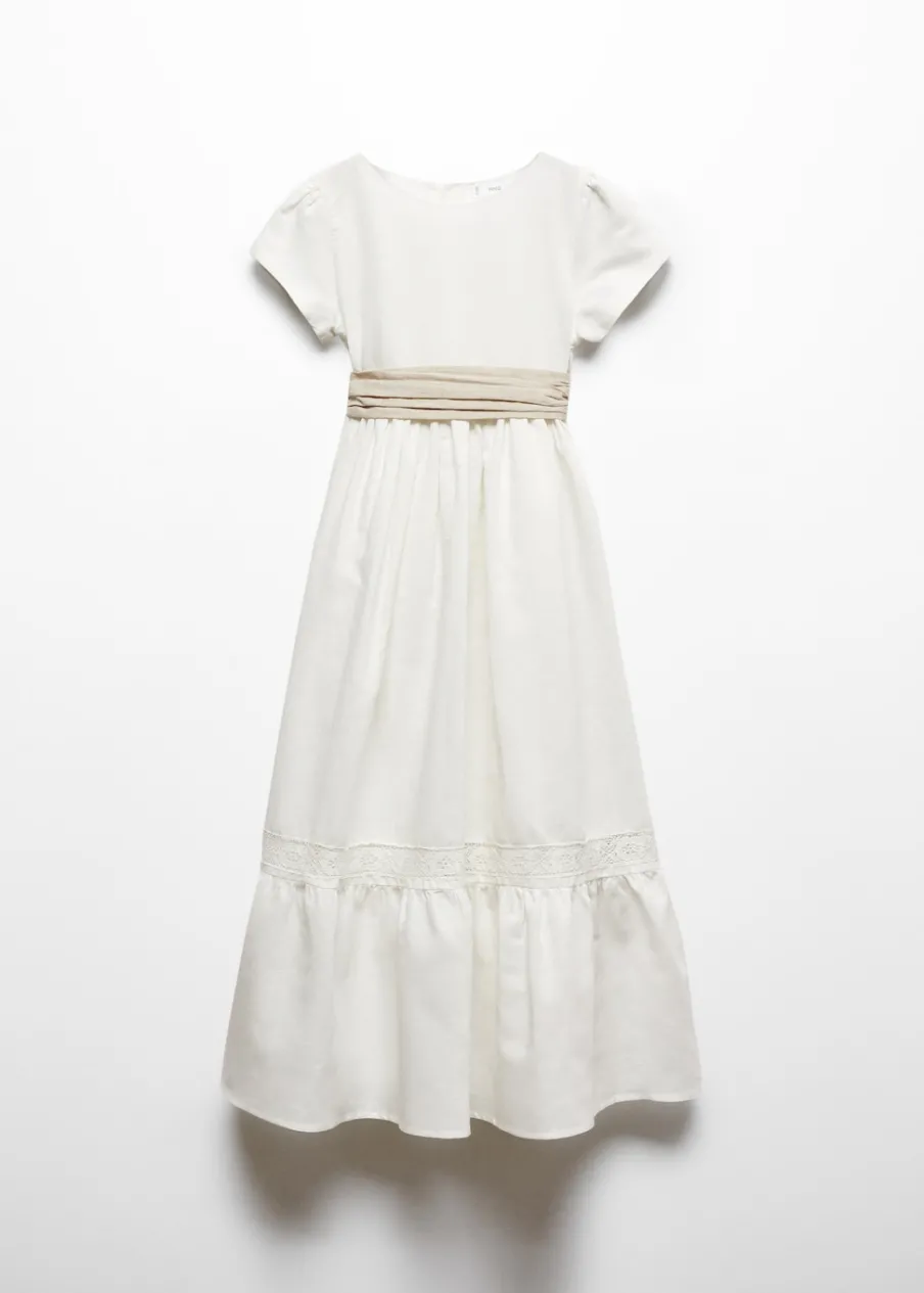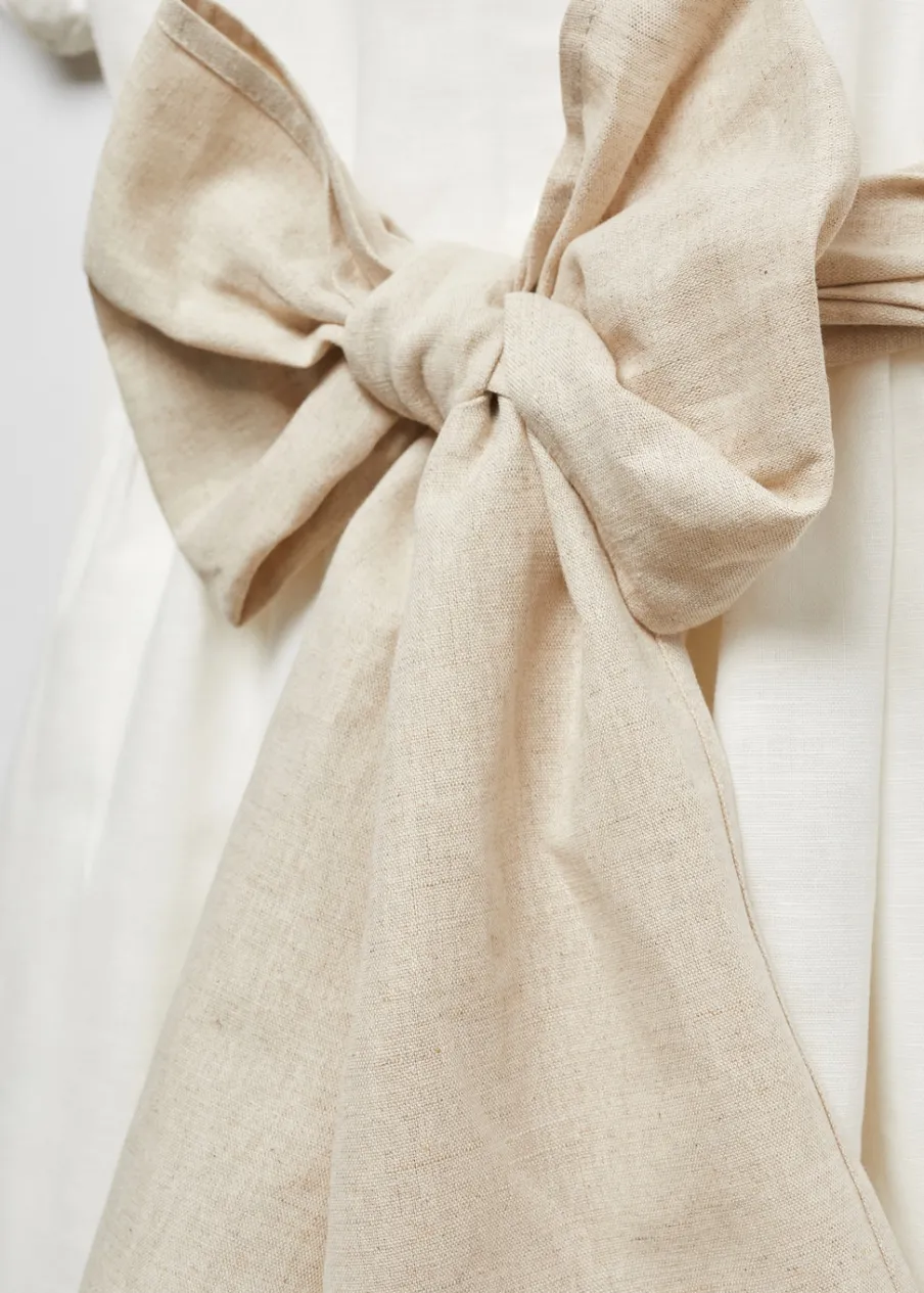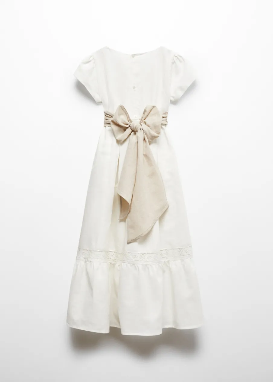 Tkanina mieszanka bawełny i lnu. Model długi. Ozdobny haft. Falbanki u dołu. Okrągły dekolt. Krótki rękaw. Wiązane zapięcie. Zapięcie na guziki. Sukienka ma długość 100 cm. Model ma 140 cm wzrostu i nosi rozmiar 10.