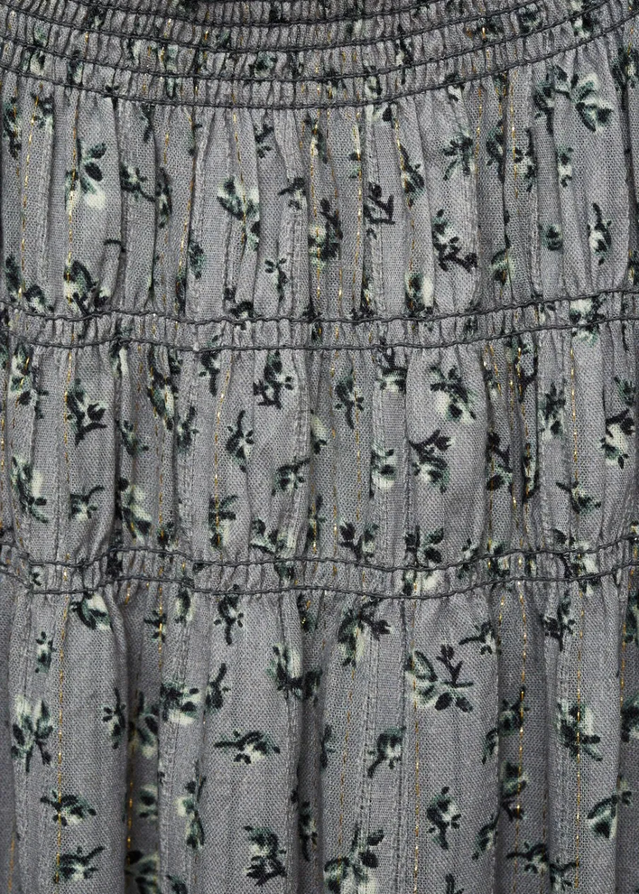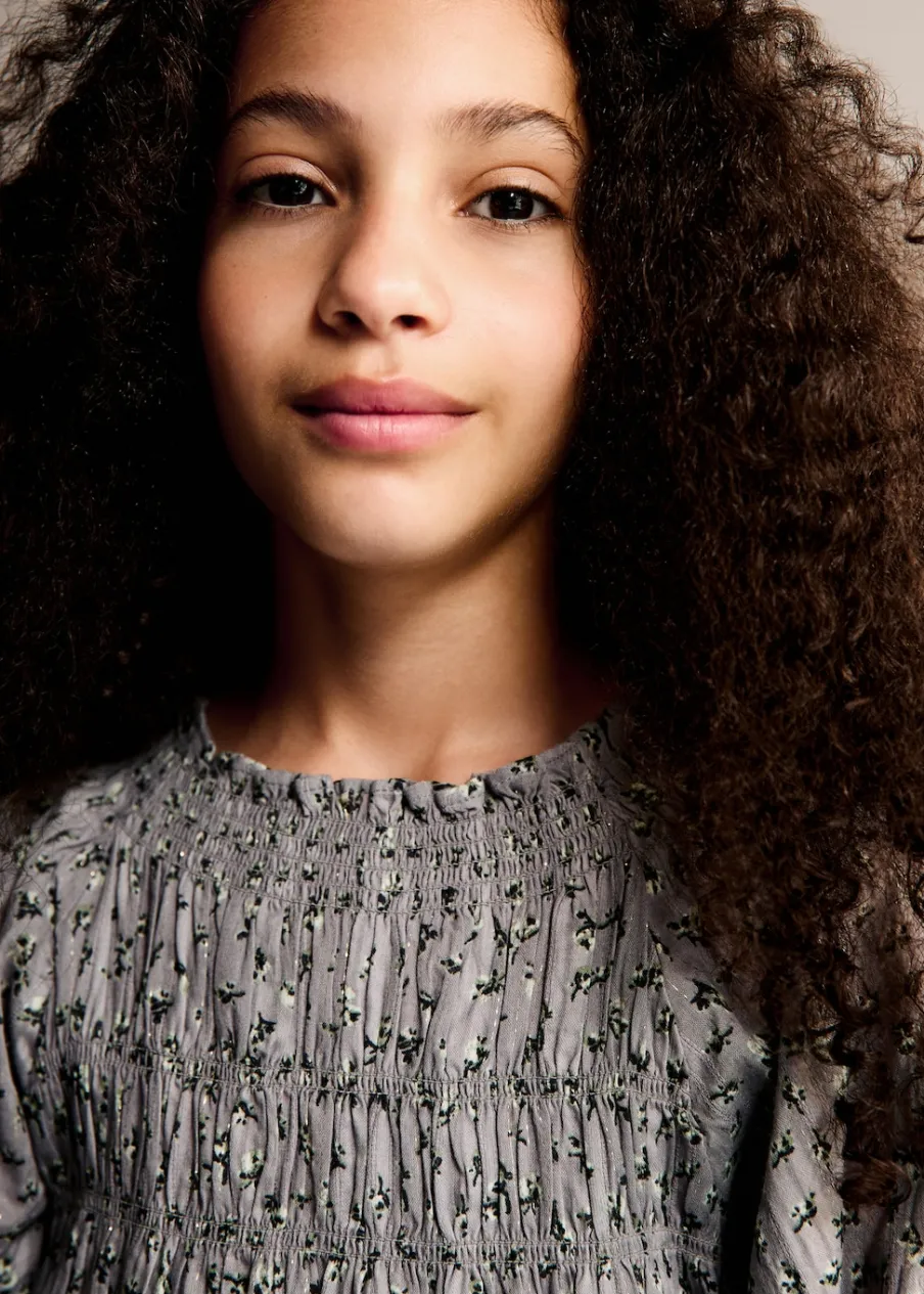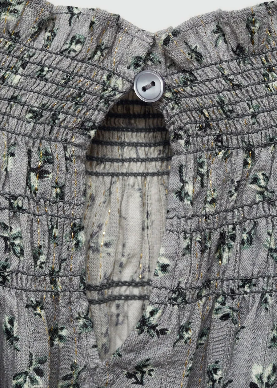 Tkanina z bawełną. Model prosty. Detal z lureksu. Marszczony detal. Marszczona talia. Długi bufiasty rękaw. Krótki krój. Zapięcie na guzik z tyłu. Nadruk.