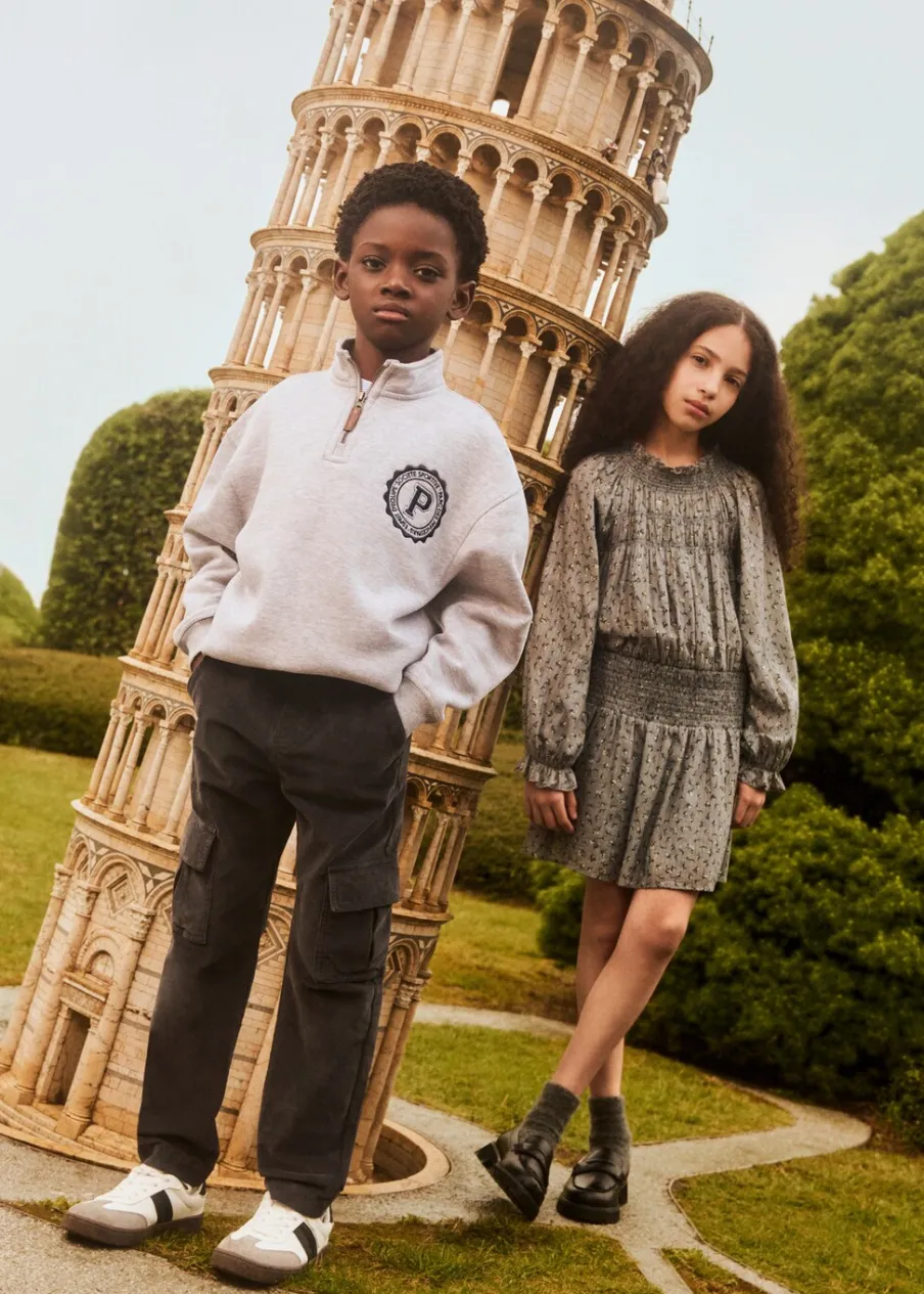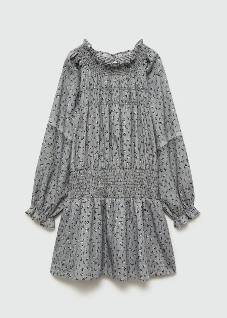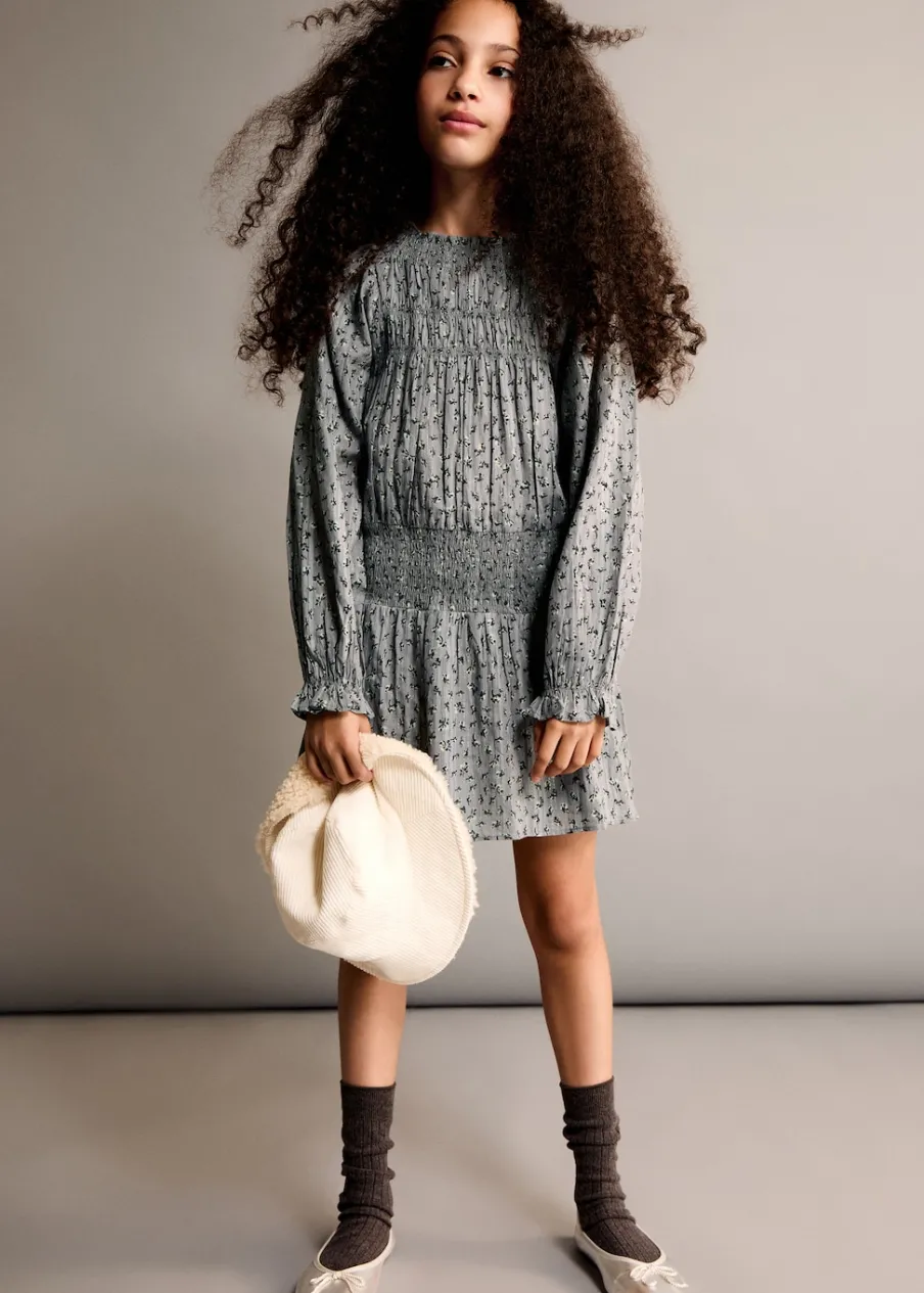 Tkanina z bawełną. Model prosty. Detal z lureksu. Marszczony detal. Marszczona talia. Długi bufiasty rękaw. Krótki krój. Zapięcie na guzik z tyłu. Nadruk.