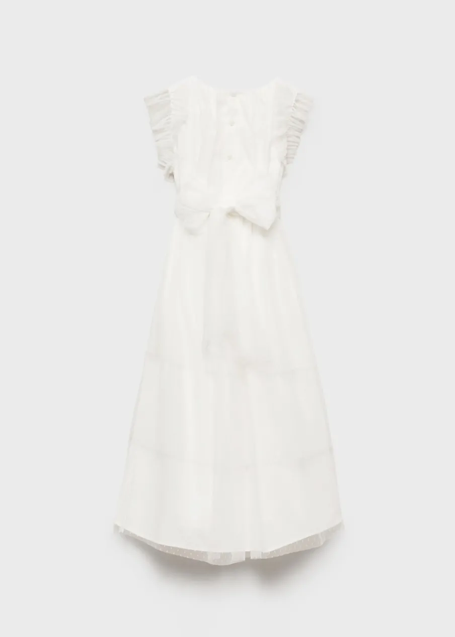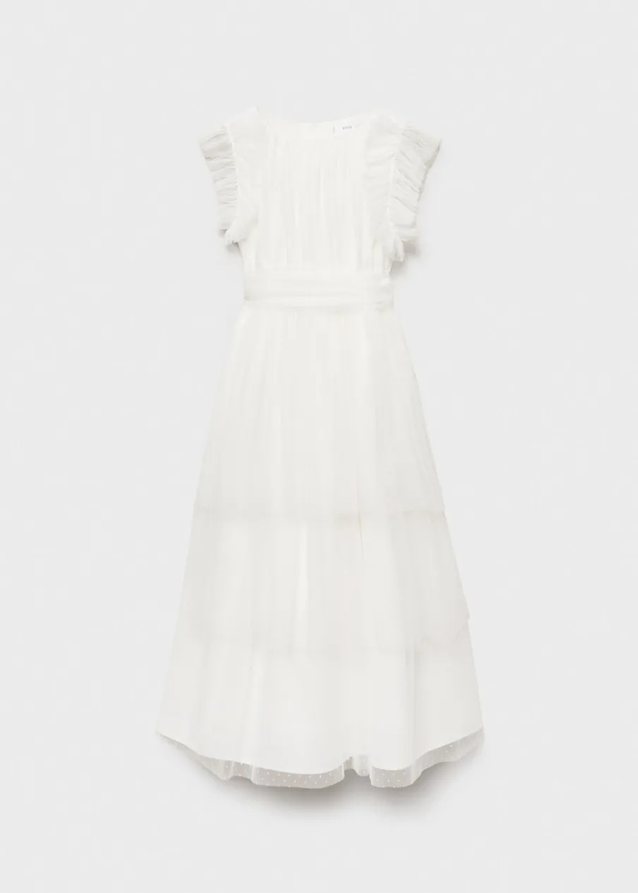 Tkanina plumeti. Tiulowa tkanina. Model długi. Okrągły dekolt. Bez rękawów. Falbanki na ramionach. Falbanki u dołu. Wstążka w pasie wiązana na kokardę. Zapięcie z tyłu na guziki. Sukienka ma długość 100 cm. Kolekcja wizytowa.