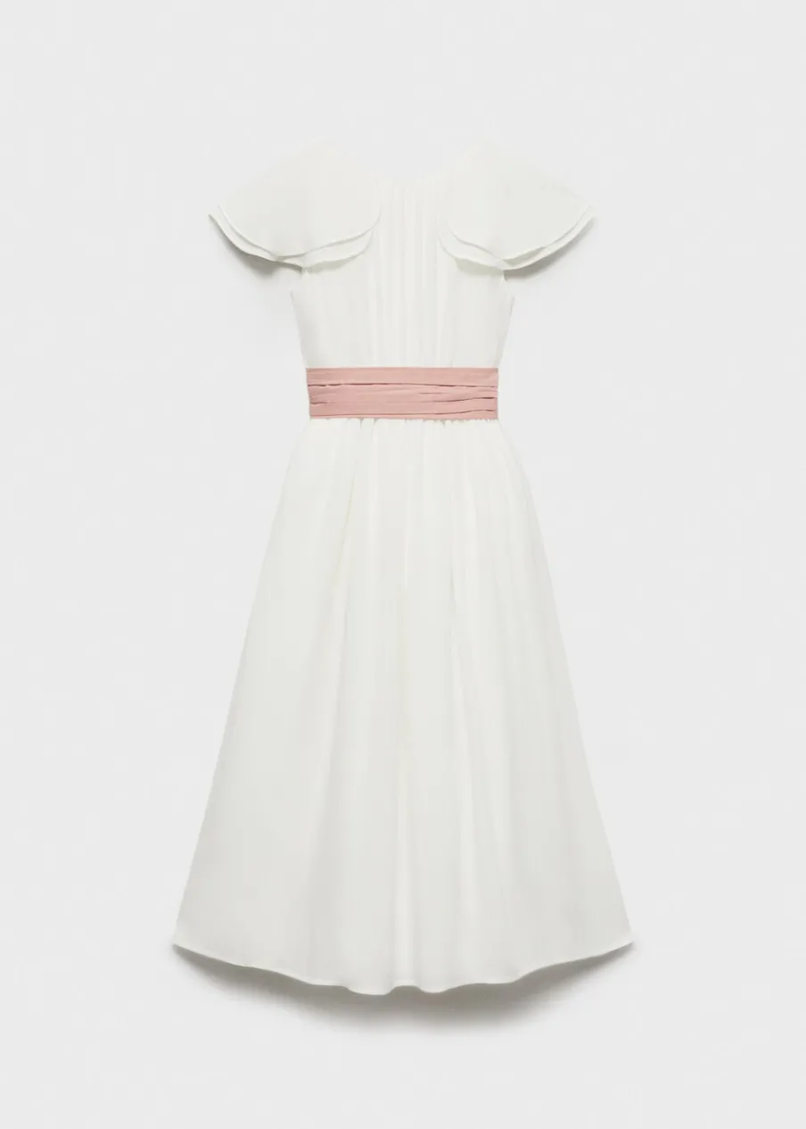 Z teksturą. Ozdobne plisy. Model długi. Okrągły dekolt. Krótki rękaw z falbanką. Dekolt w szpic na plecach. Wiązane zapięcie. Zapięcie na guziki. Sukienka ma długość 100 cm. Kolekcja wizytowa.