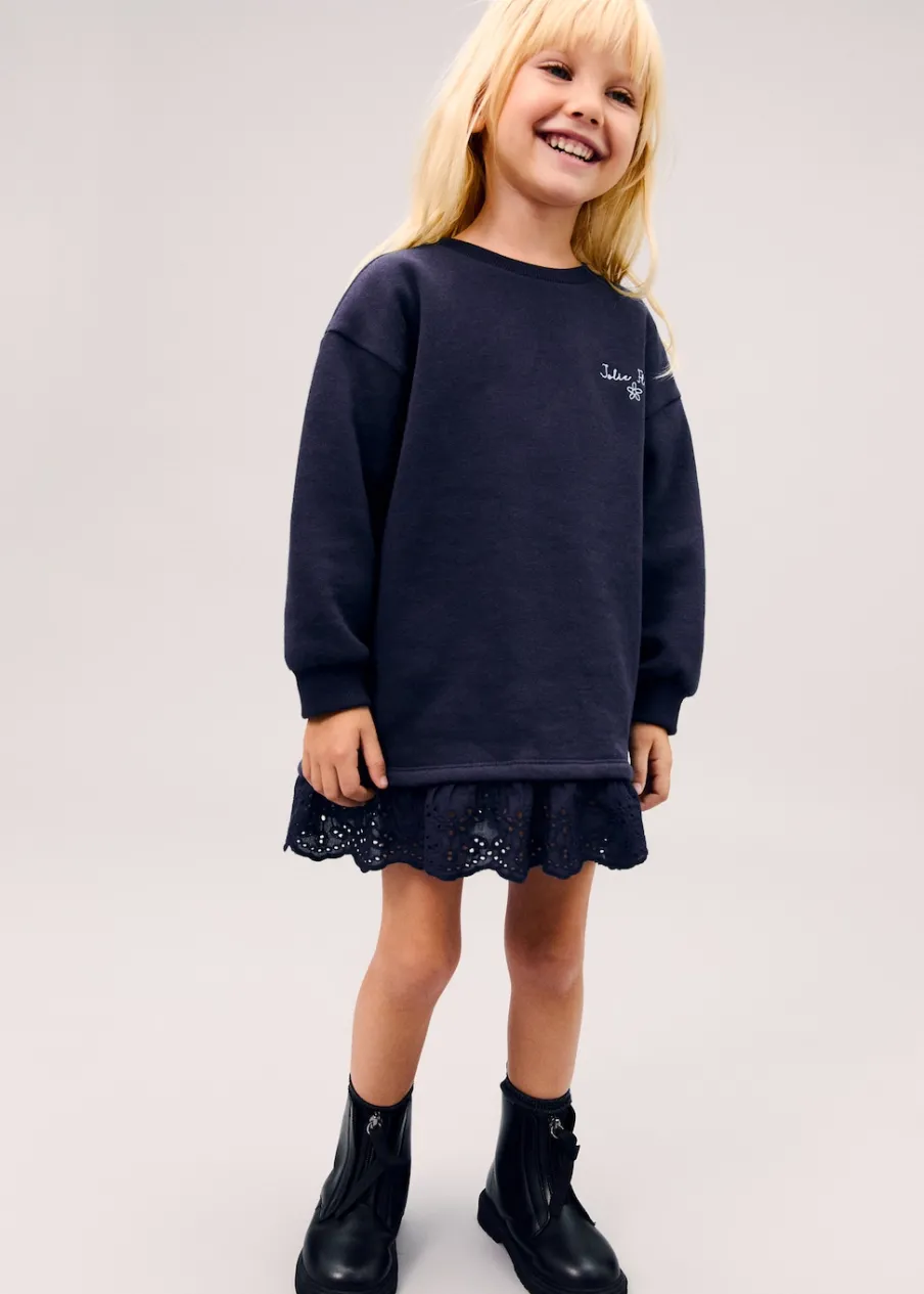 OpisPowrót do szkoły. Tkanina z bawełną. Model prosty. Okrągły dekolt. Długi rękaw. Haftowany detal. Falbana u d…