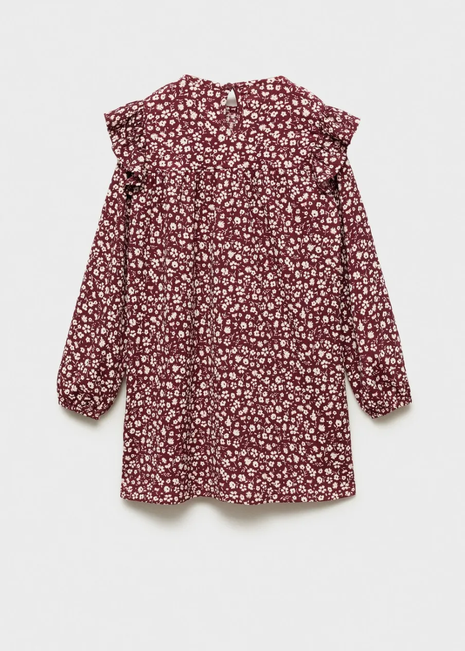 Model prosty. Kwiatowy wzór. Okrągły dekolt. Długi rękaw. Krótki krój. Marszczony detal. Z falbanami. Zapięcie na guzik z tyłu.