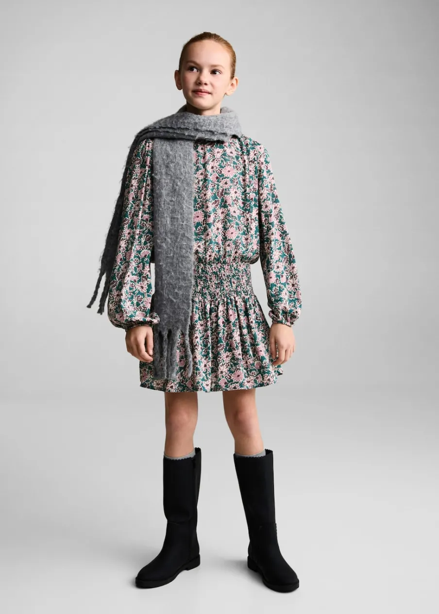 Kwiatowy wzór. Model prosty. Marszczona tekstura. Okrągły dekolt. Długi rękaw z elastycznymi mankietami.