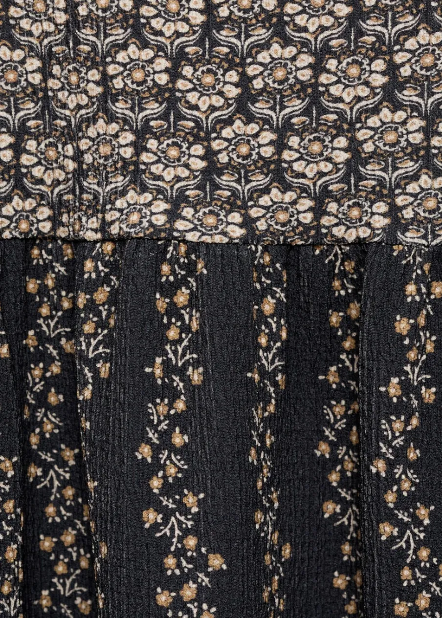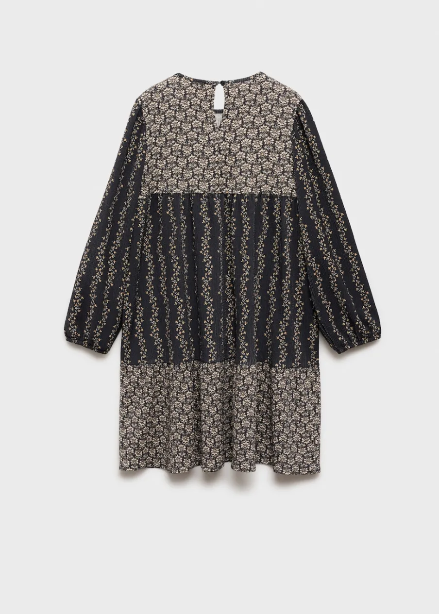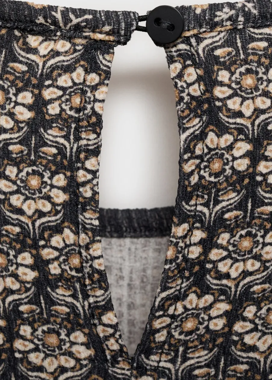 Mieszanka wzorów. Krótki krój. Okrągły dekolt z zapięciem na guzik. Długi rękaw z elastycznymi mankietami.