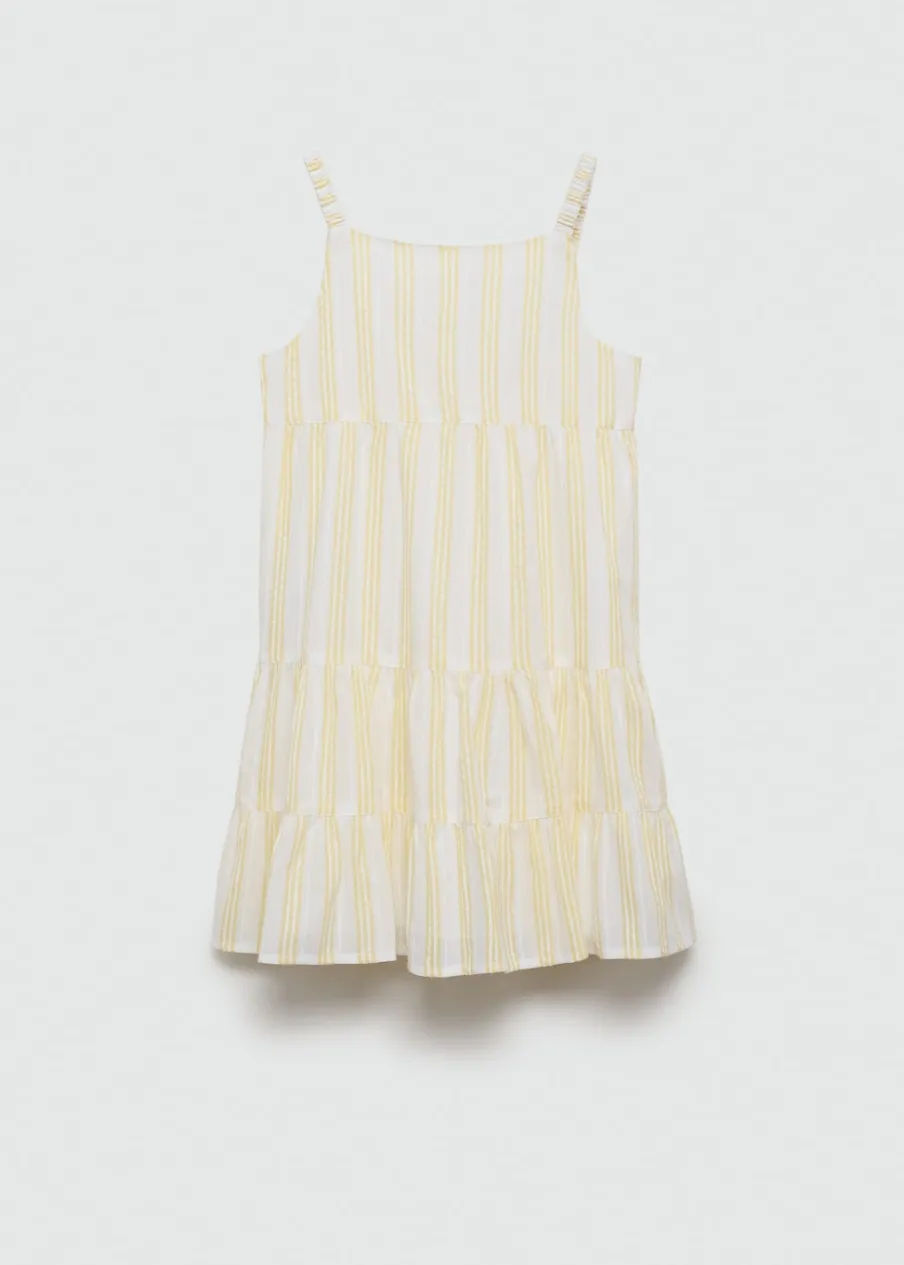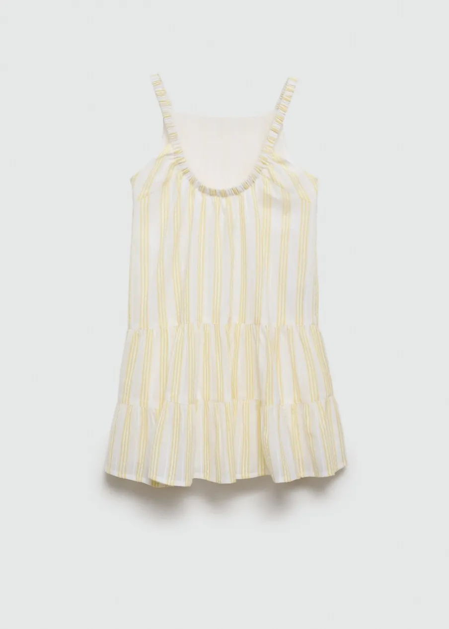 100% bomull. Krótki krój. Model prosty. Wzór w pasy. Marszczone ramiączka. Elastyczne wykończenia. Falbanki u dołu. Kwadratowy dekolt. Fason z odkrytymi plecami. Wewnętrzna podszewka. Bez zapięcia.
