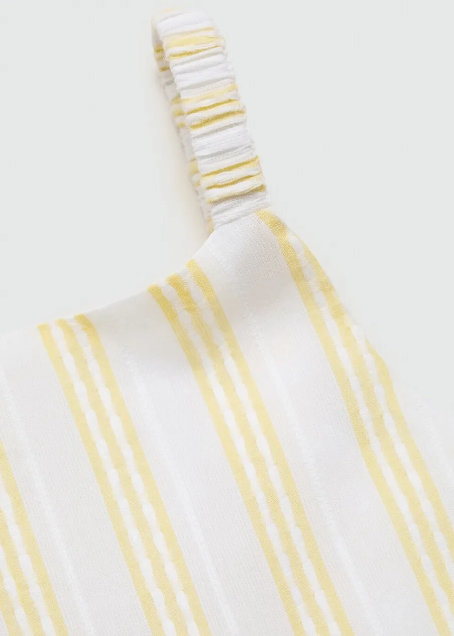 Opis100% bomull. Krótki krój. Model prosty. Wzór w pasy. Marszczone ramiączka. Elastyczne wykończenia. Falbanki …