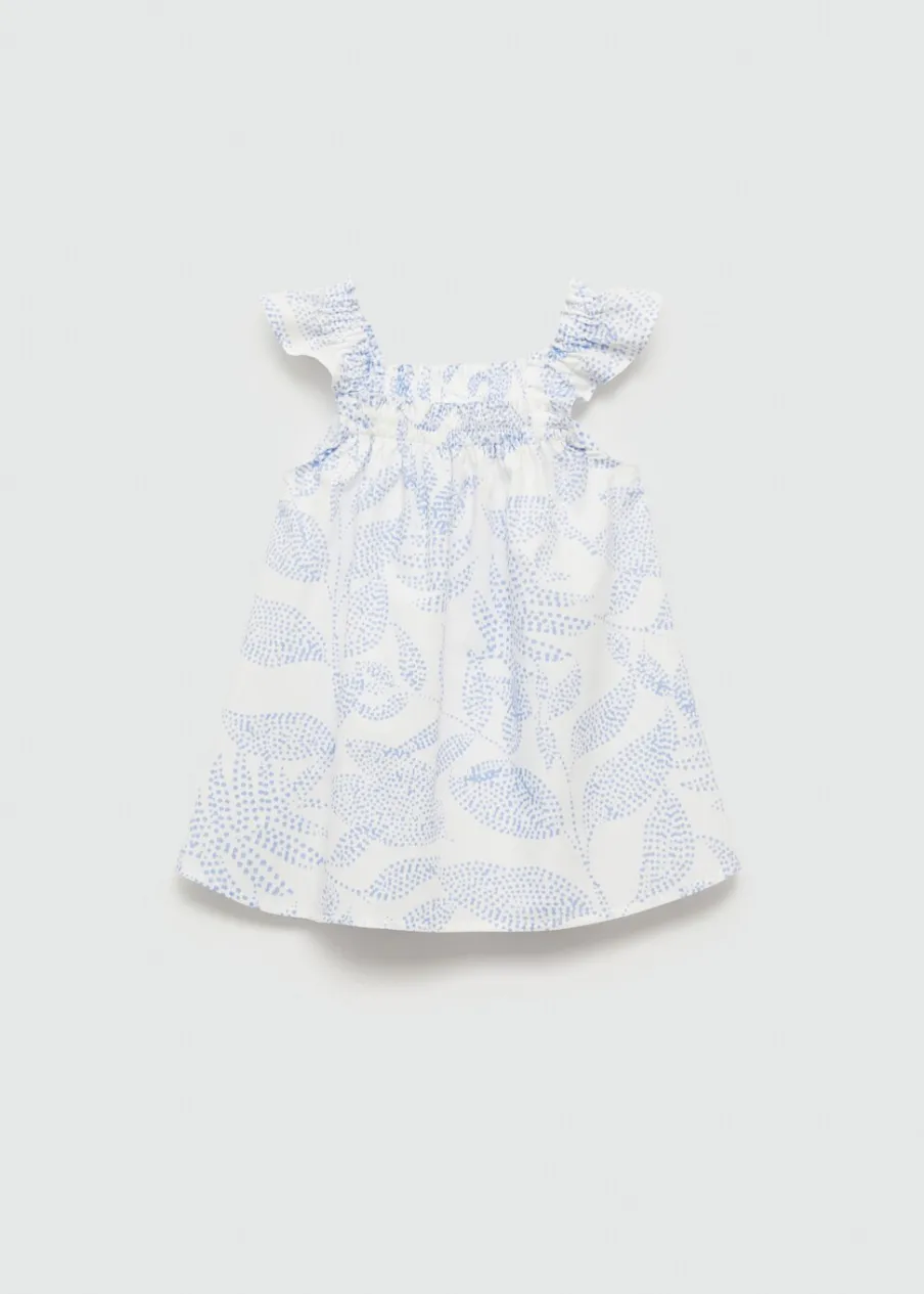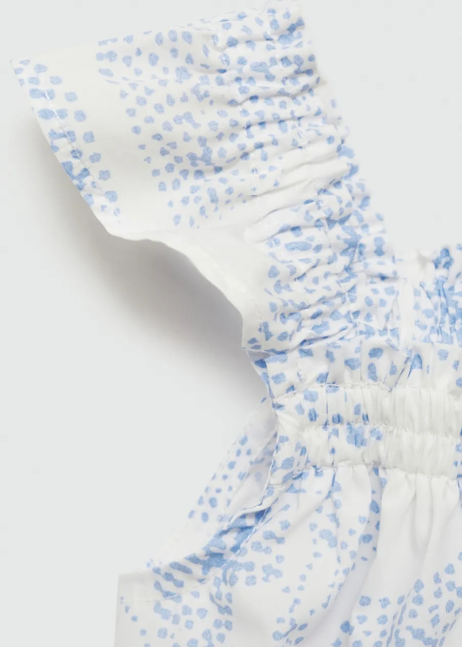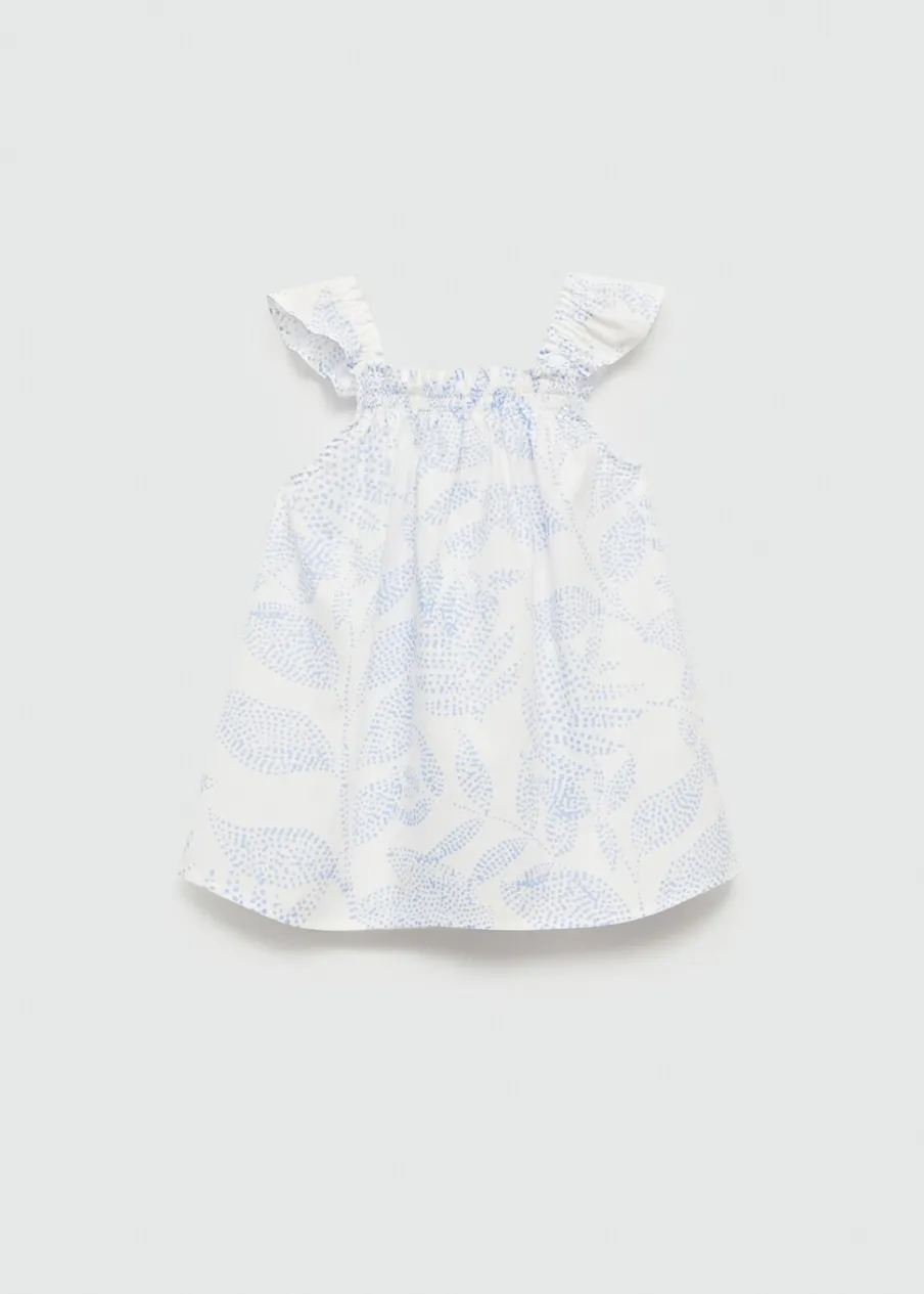 100% bomull. Krótki krój. Ramiączka z falbaną. Wzór w liście. Kwadratowy dekolt. Dekolt na gumkę. Marszczony detal. Bez zapięcia.