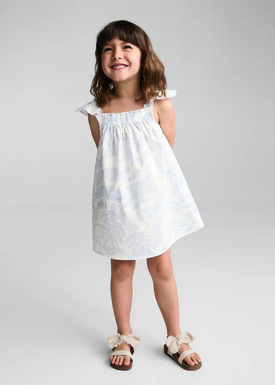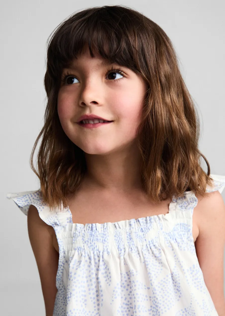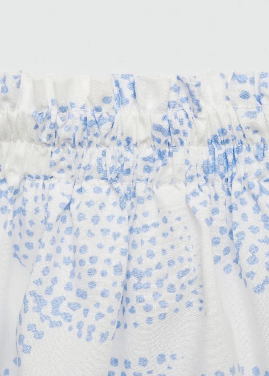 100% bomull. Krótki krój. Ramiączka z falbaną. Wzór w liście. Kwadratowy dekolt. Dekolt na gumkę. Marszczony detal. Bez zapięcia.