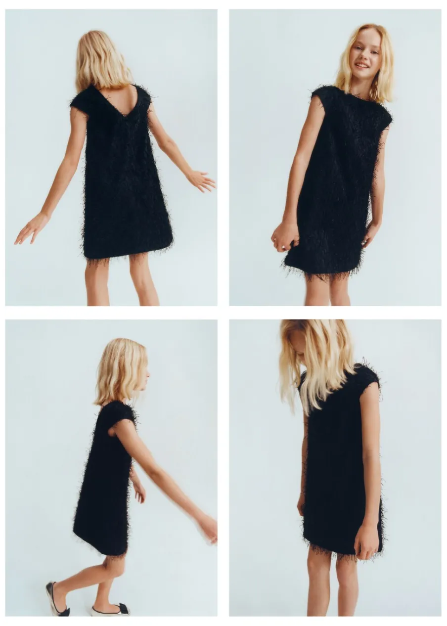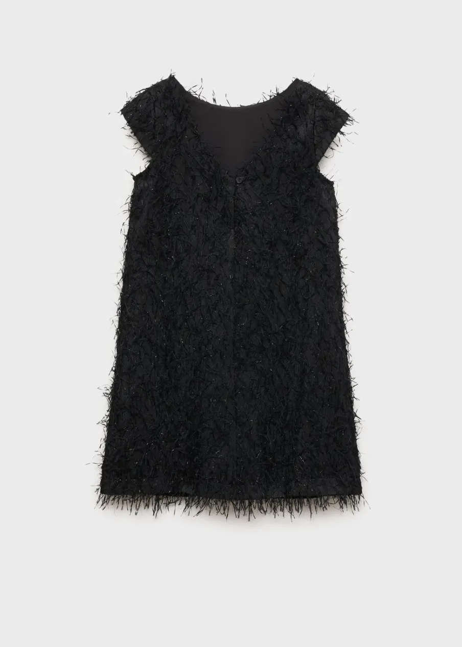 Dekoracyjne frędzle. Model prosty. Krótki krój. Bez rękawów. Okrągły dekolt. Wewnętrzna podszewka. Kolekcja wieczorowa i imprezowa.