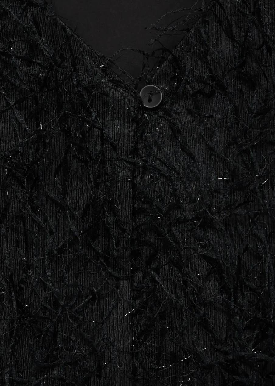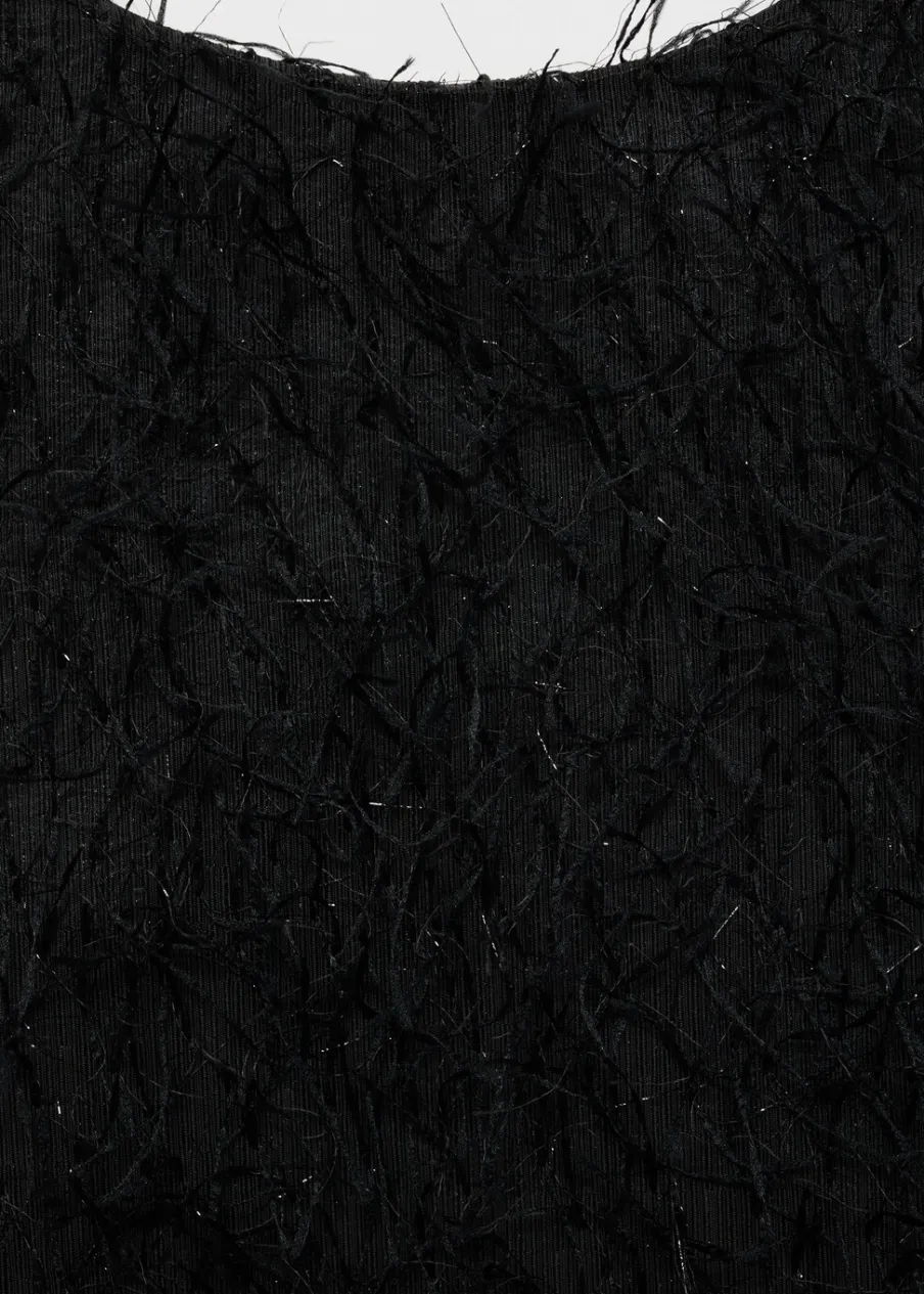 Dekoratív rojtokkal, egyenes szabású modell, rövid szabás, ujjatlan, kerek nyakkivágás, belső bélés.