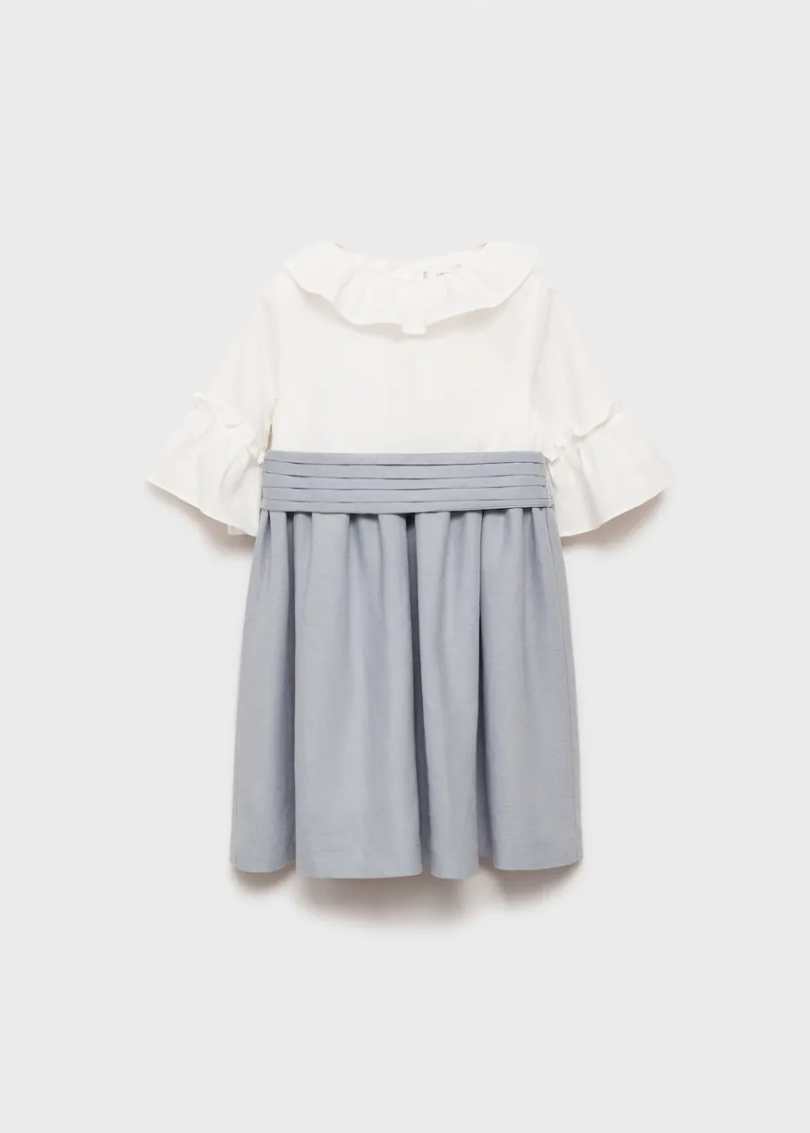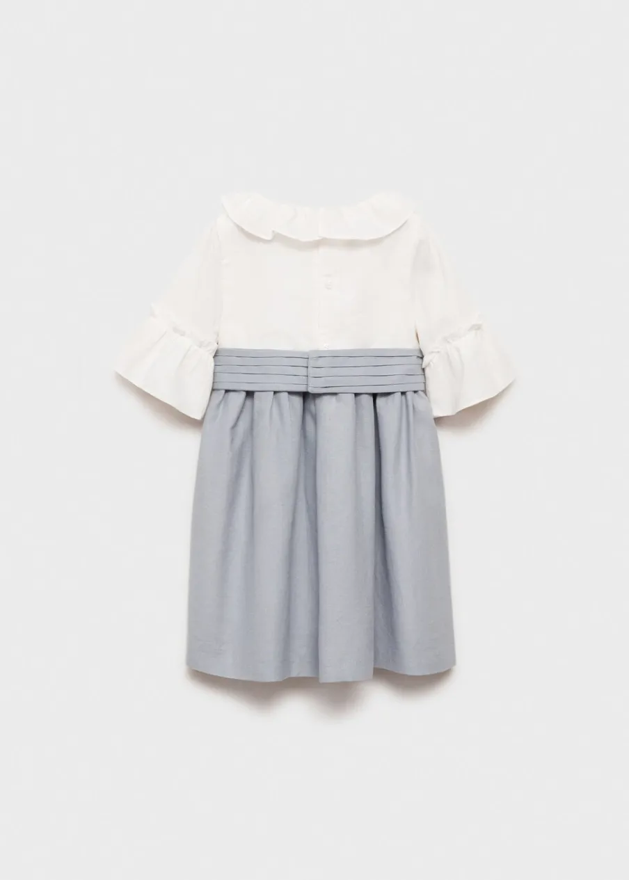 Rękaw trzy czwarte. Body z kołnierzykiem falbanką. Plisowane mankiety. Wiązanie w talii. Falbanki na spódnicy. Kontrastowy pas. Zapięcie z tyłu na guziki. Kolekcja wieczorowa i imprezowa.