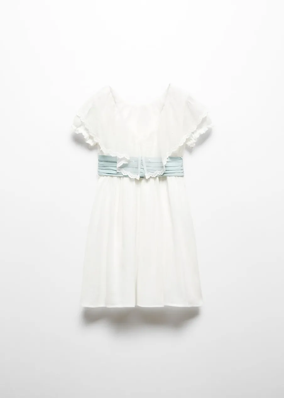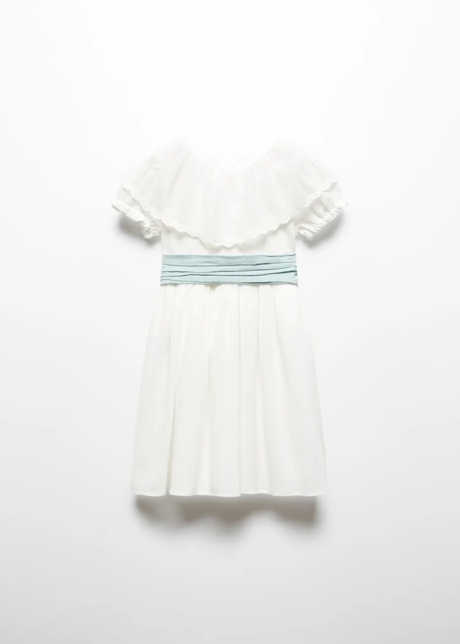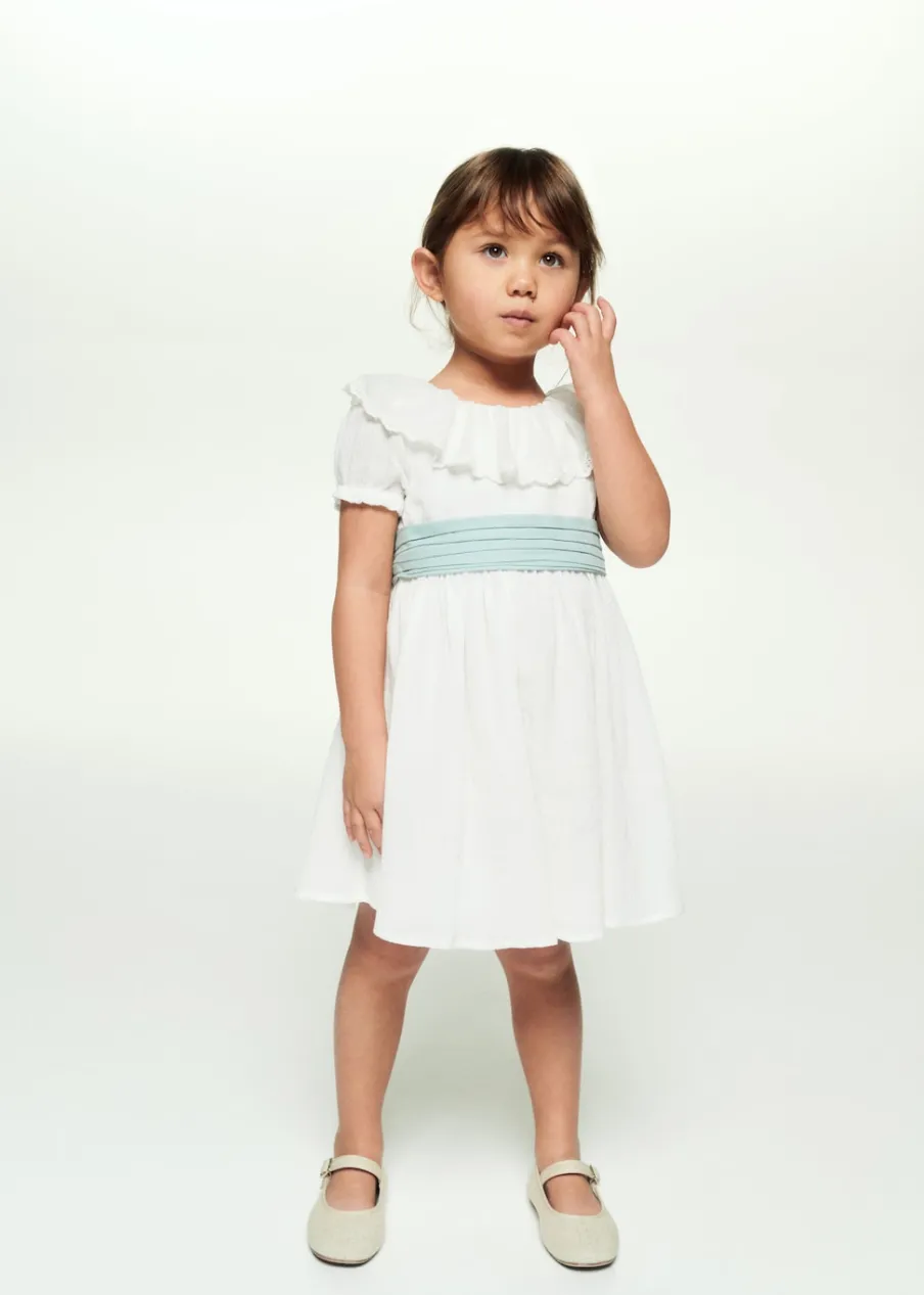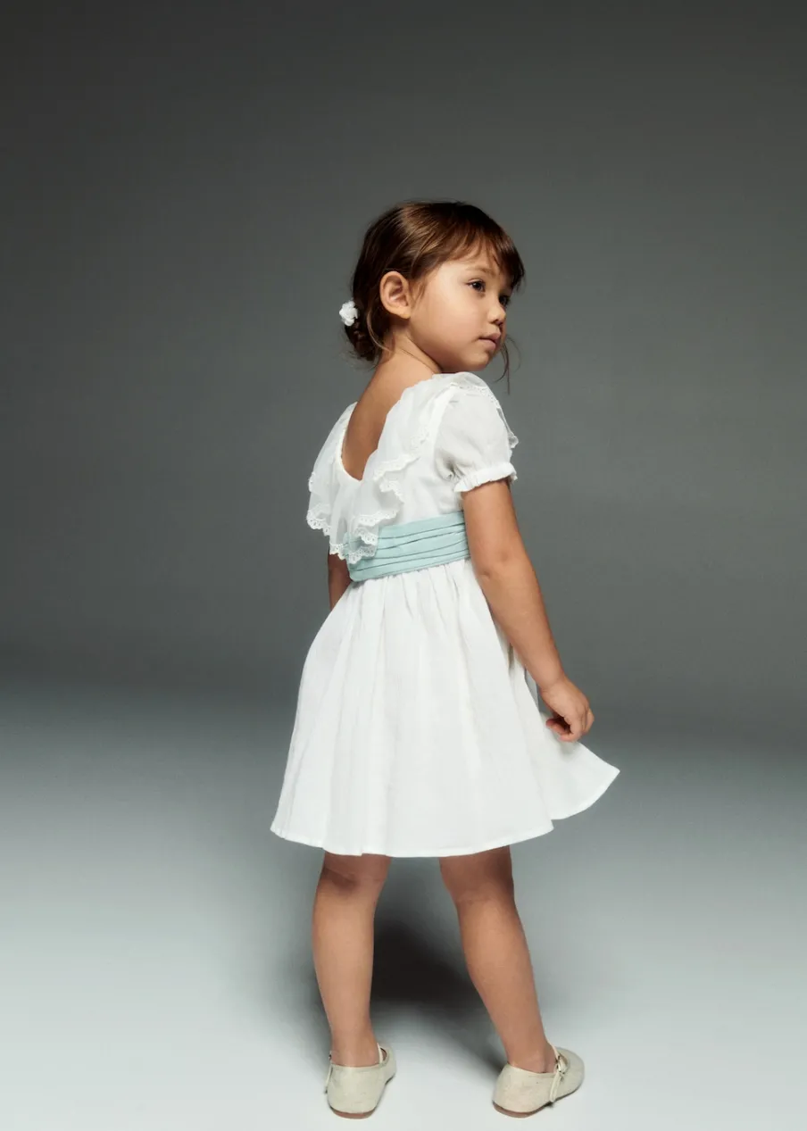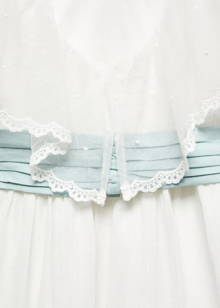 Kolekcja wizytowa. 100% bomull. Tiulowa tkanina. Krój do kolan. Kołnierzyk bebe. Okrągły dekolt. Zapięcie na guziki. Pasek zapinany na klamrę.