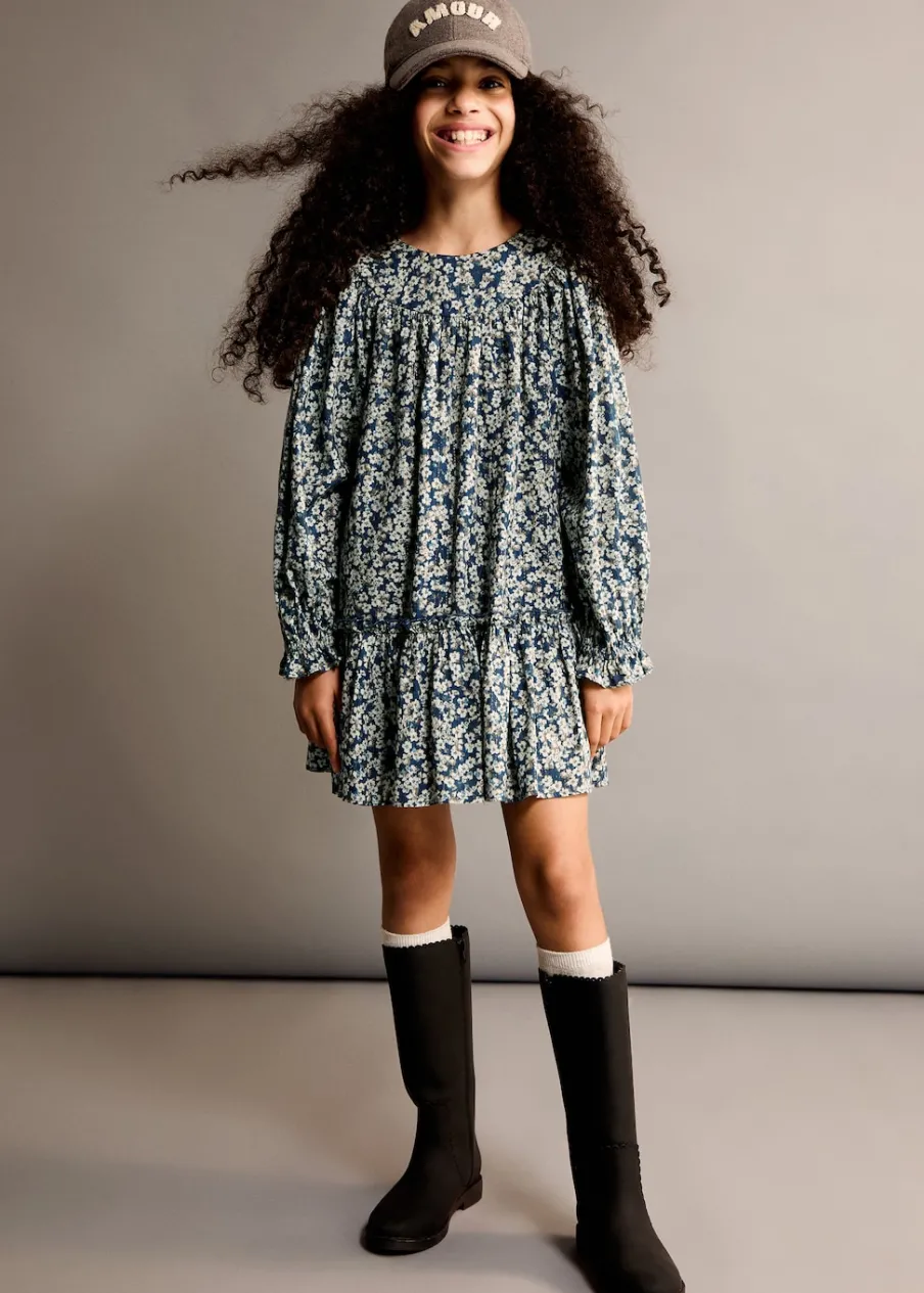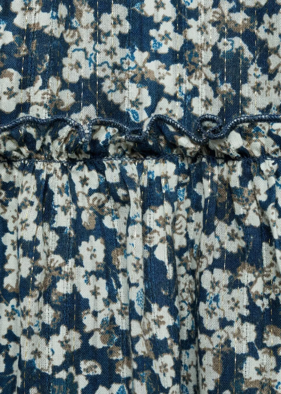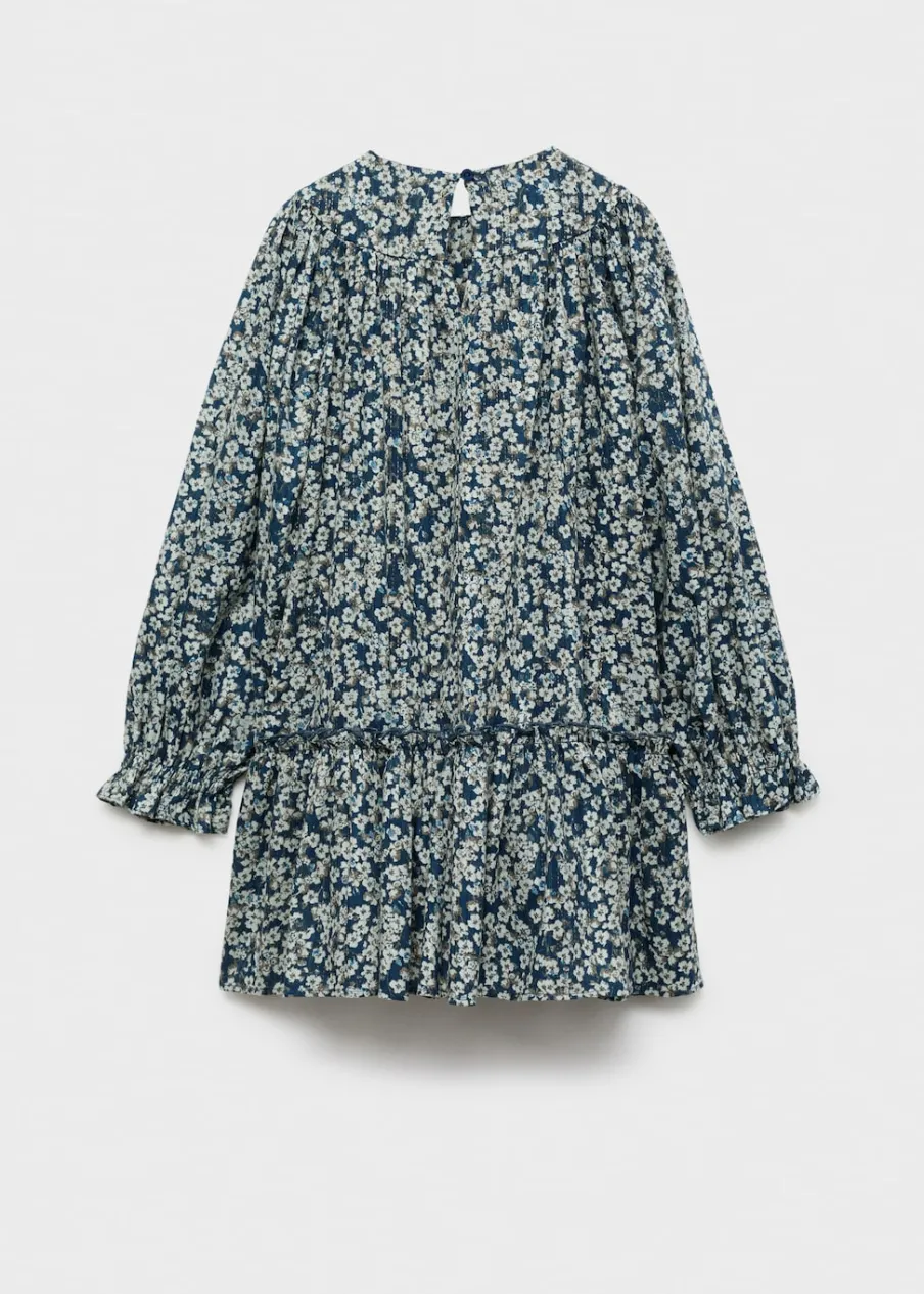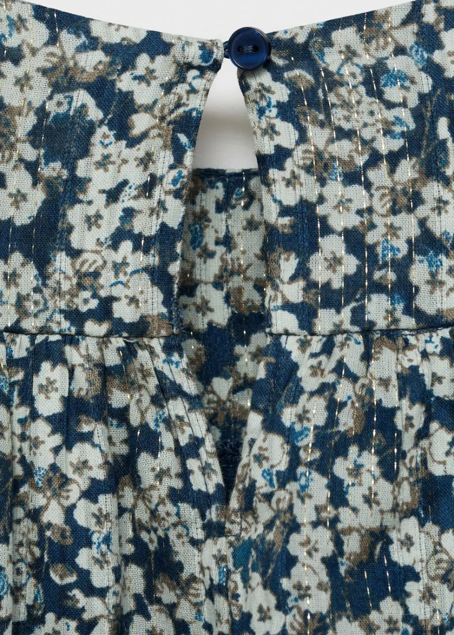 Kwiatowy wzór. Okrągły dekolt. Długi rękaw. Wewnętrzna podszewka. Zapięcie na guzik z tyłu. Tkanina bawełniana. Model prosty.