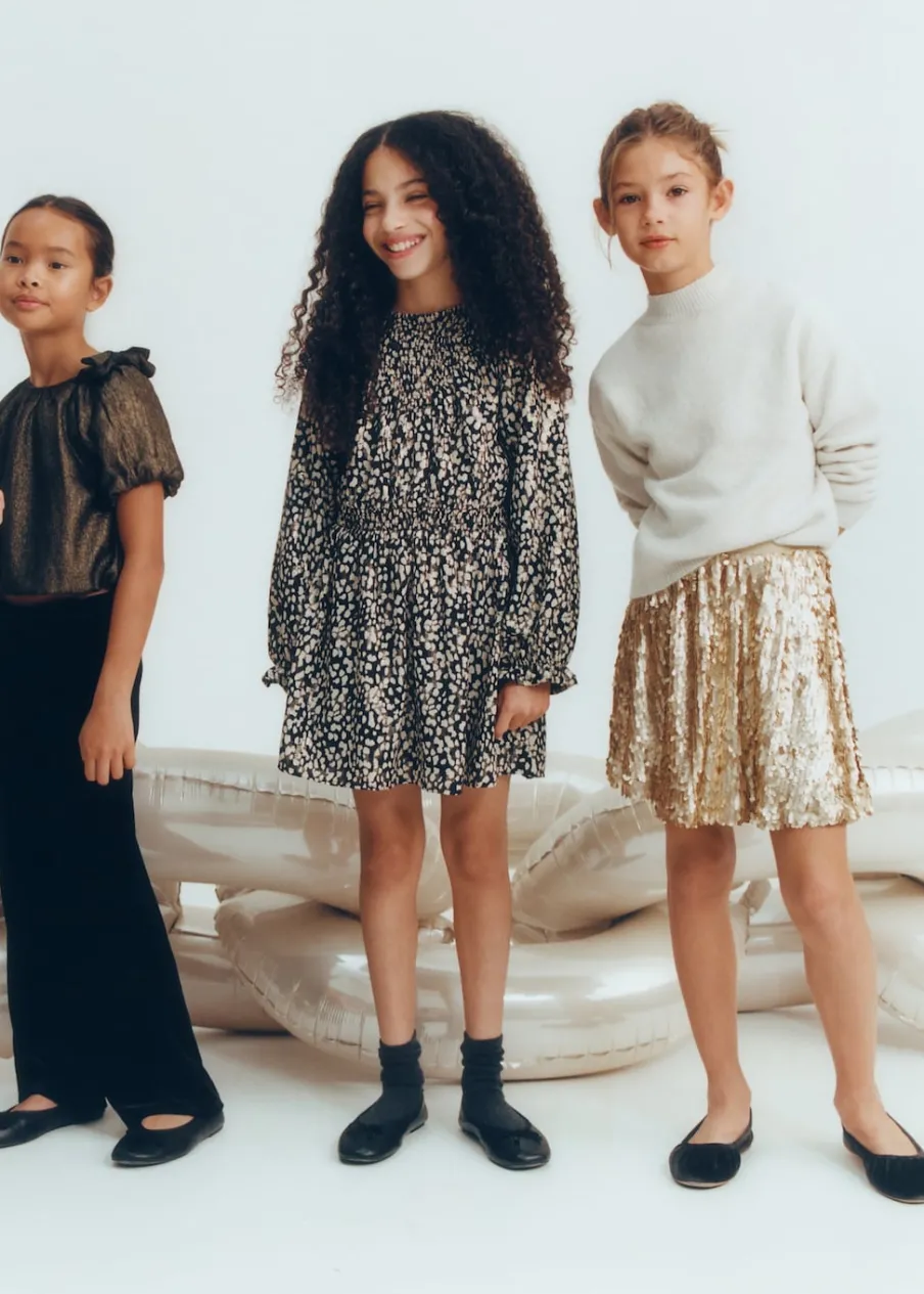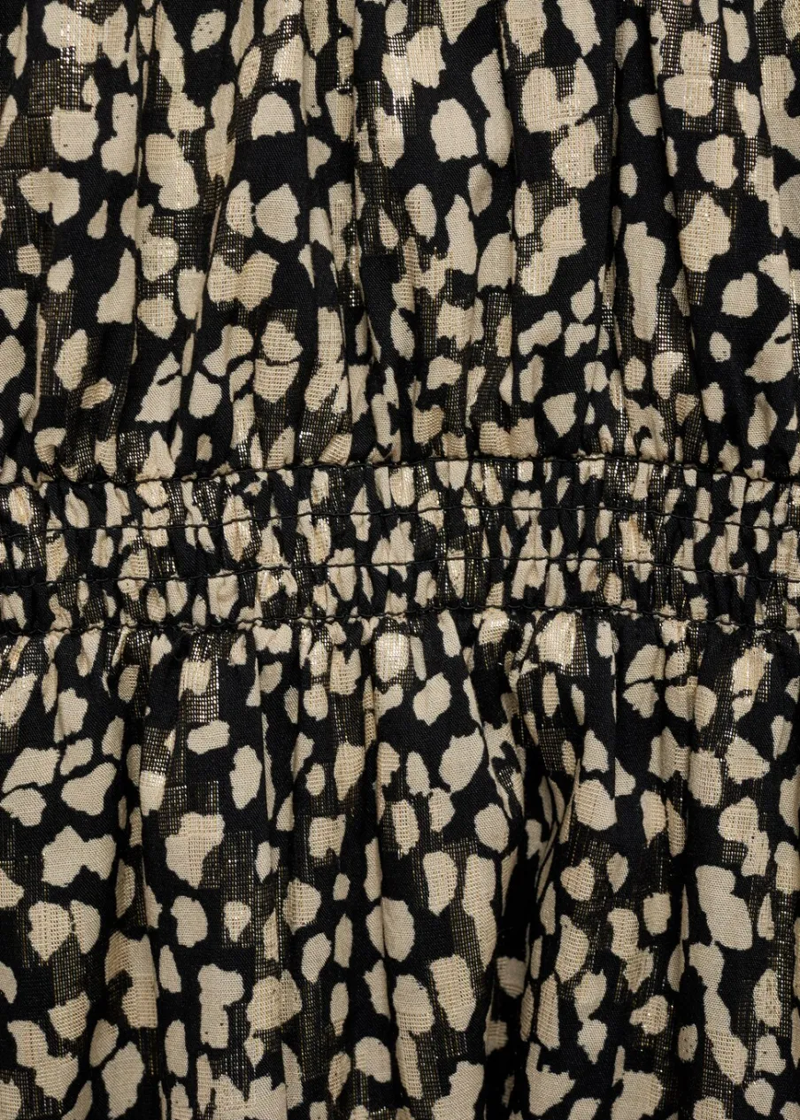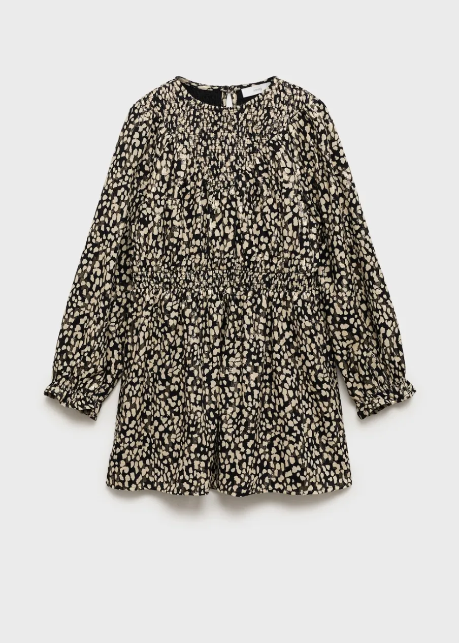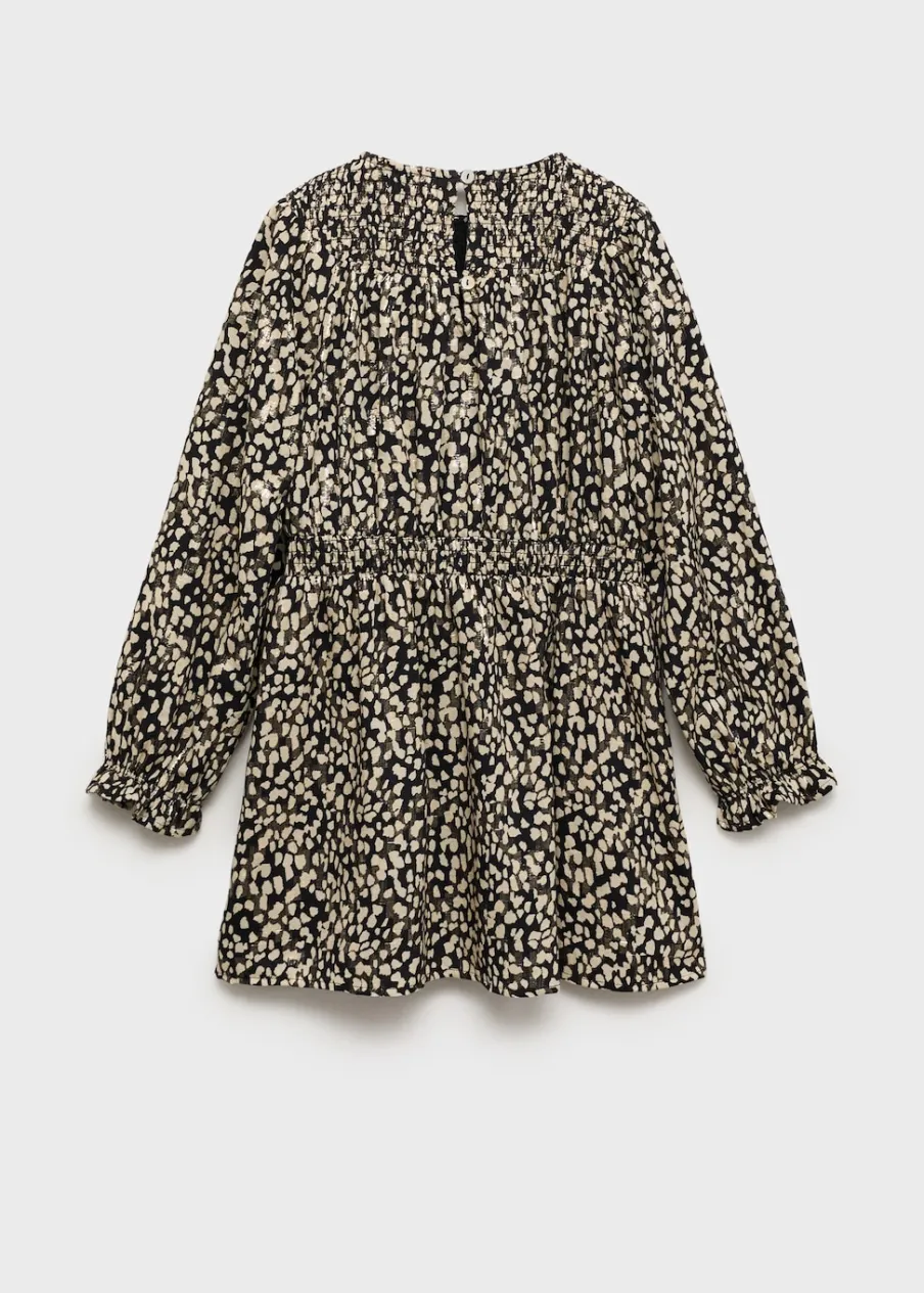 Wzorzysty. Krótki krój. Marszczony detal. Elastyczne marszczenie. Okrągły dekolt. Długi rękaw. Bawełniana podszewka.