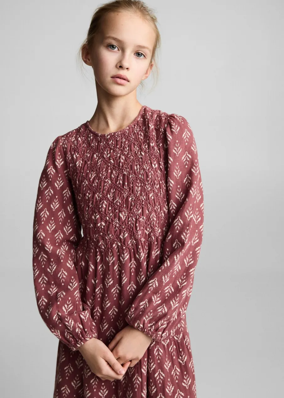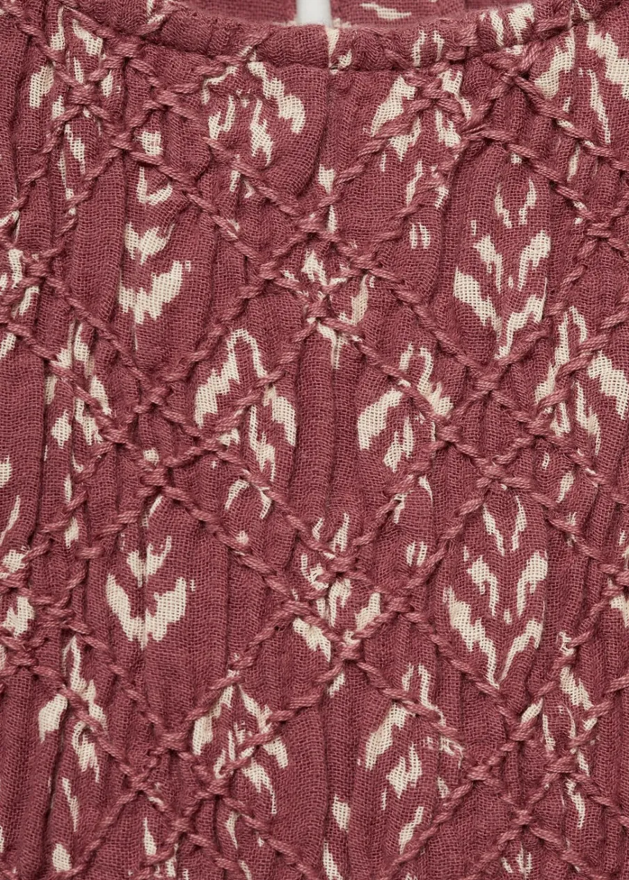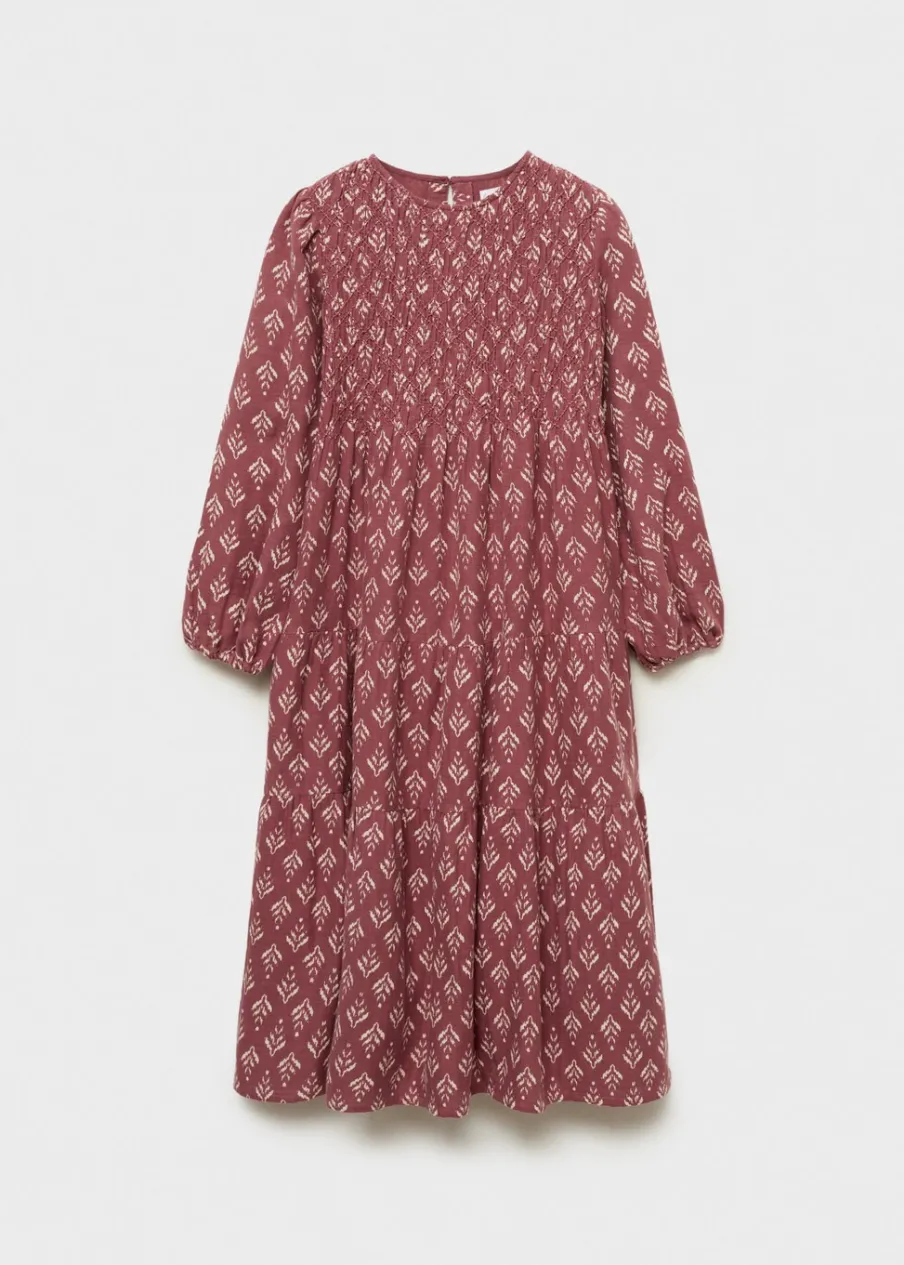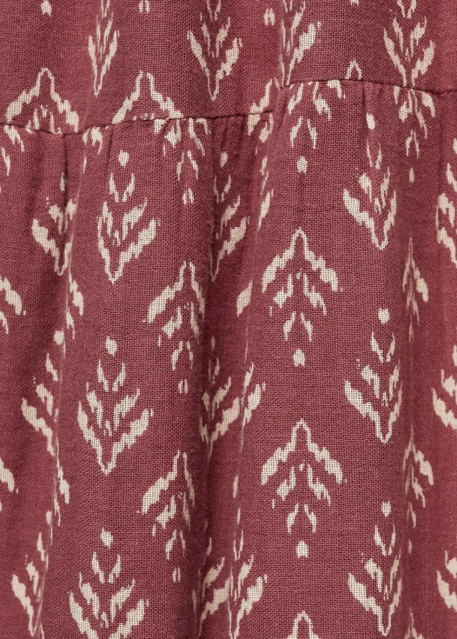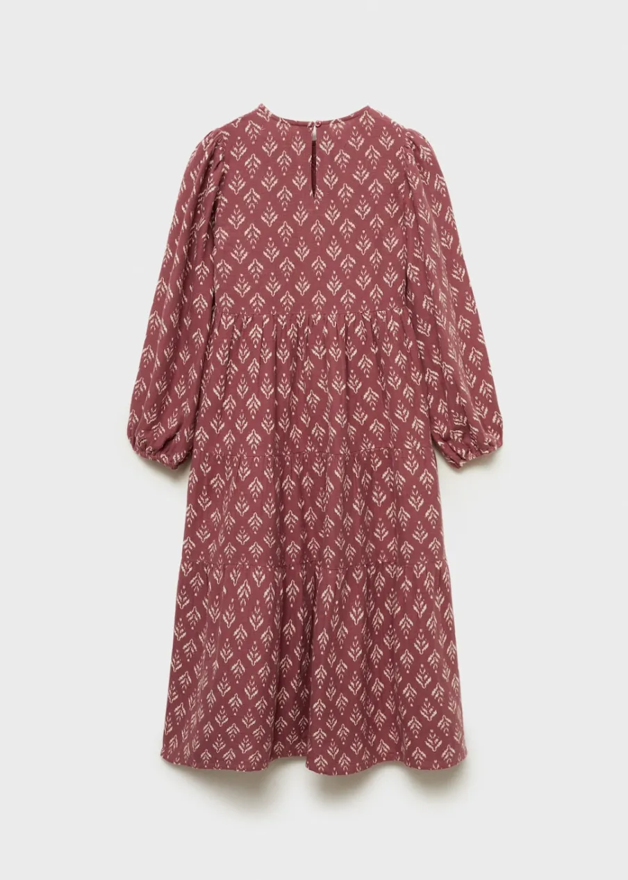 Bawełna 100%. Krój do kolan. Długi bufiasty rękaw. Marszczone mankiety. Wzorzysty. Ozdobne marszczenie. Zapięcie na guzik pod szyją.