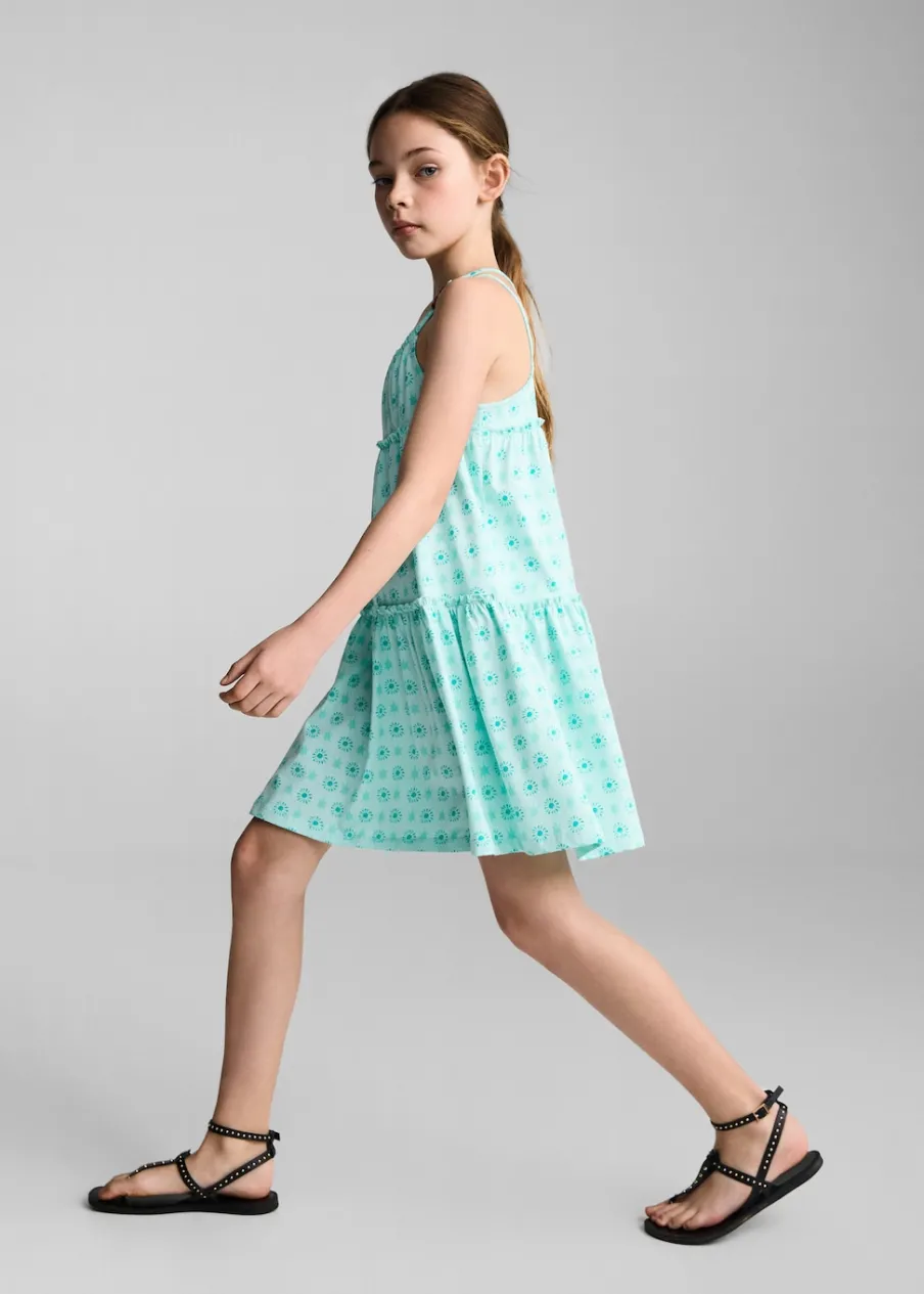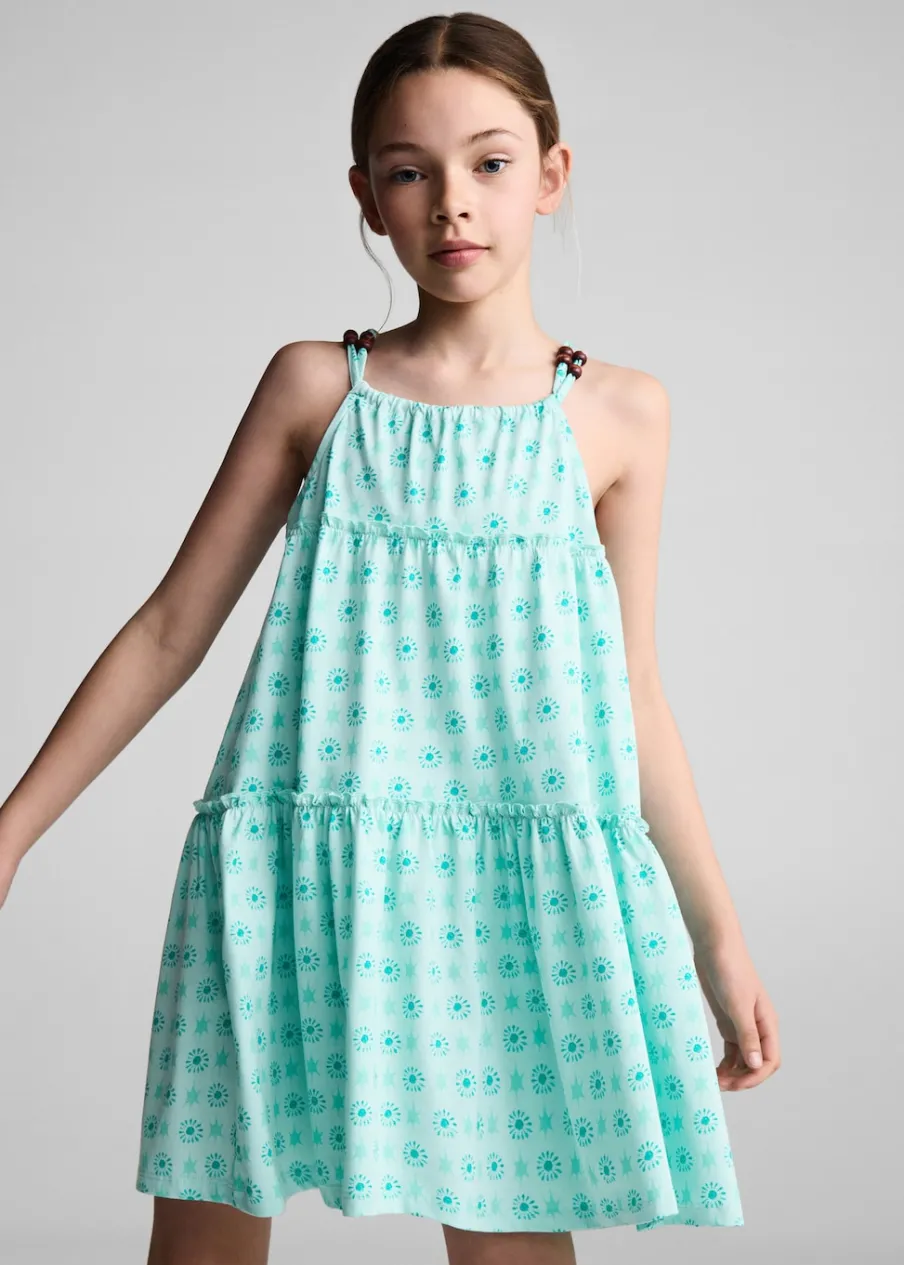 100% bomull. Model prosty. Krótki krój. Model z falbankami. Cienkie ramiączka. Ozdobne koraliki. Okrągły dekolt. Bez rękawów. Bez zapięcia. Nadruk.