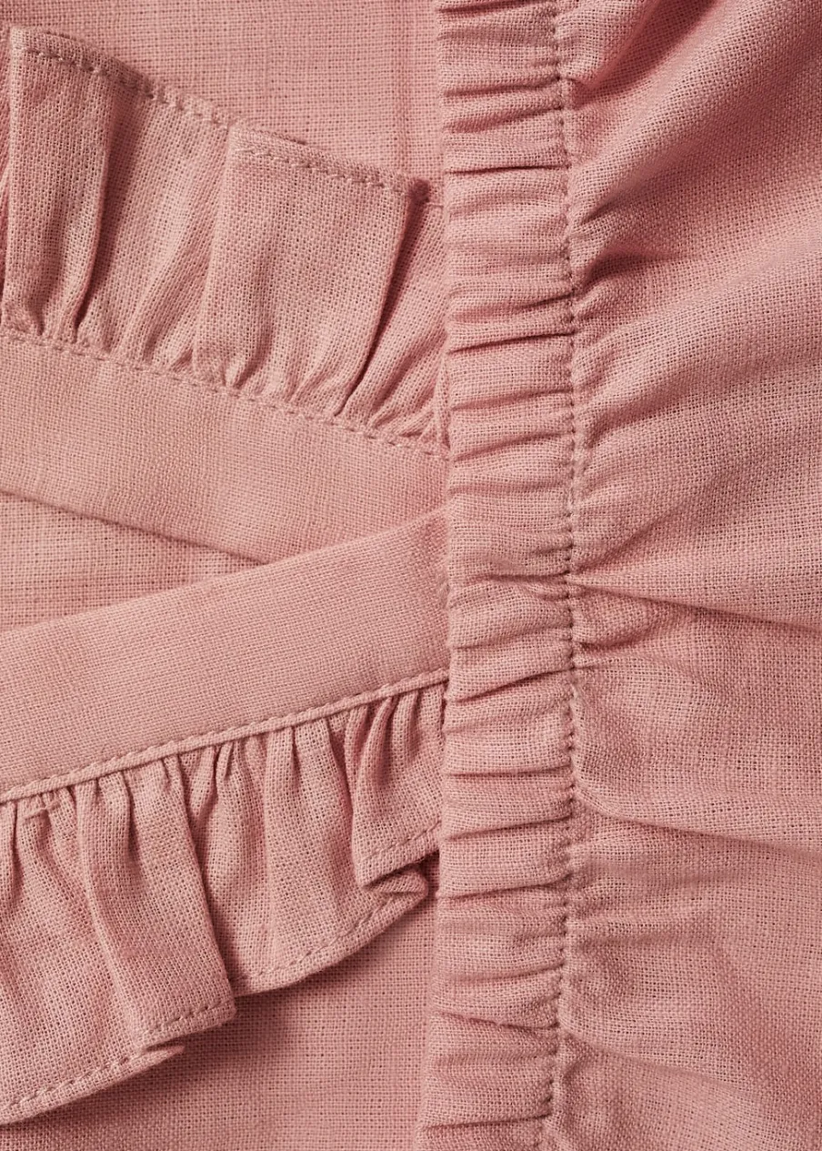 OpisBawełniana tkanina. Tkanina lniana. Kwadratowy dekolt. Ramiączka z falbaną. Ozdobne zakładki. Elastyczny pas. El…